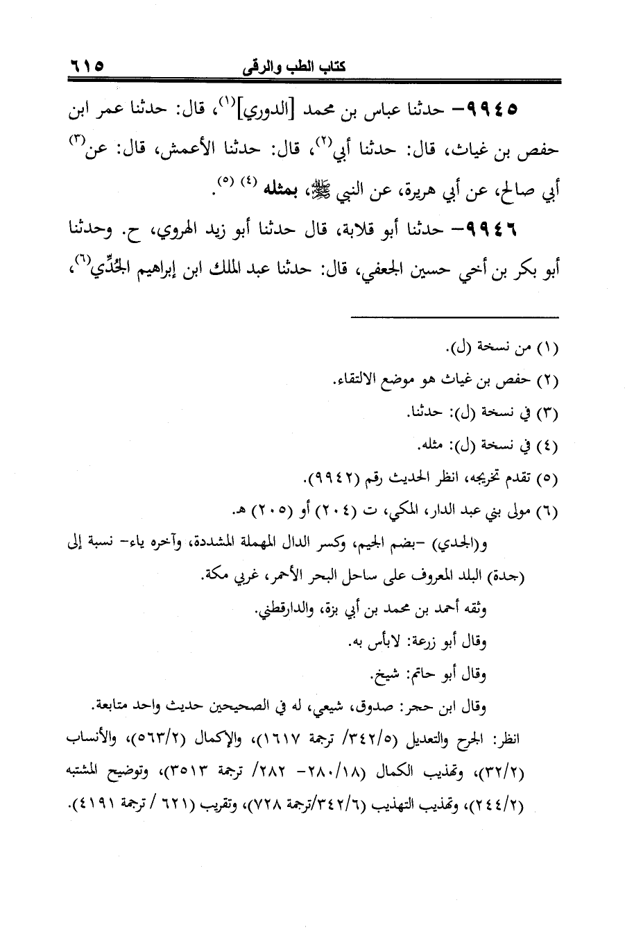 9946 - حدثنا أَبو قلابة، قال حدثنا أَبو زيد الهروي، ح. وحدثنا أَبو بكر بن أخي حسين الجعفي، قال: حدثنا عبد الملك ابن إبراهيم الجُدِّي (¬1)،