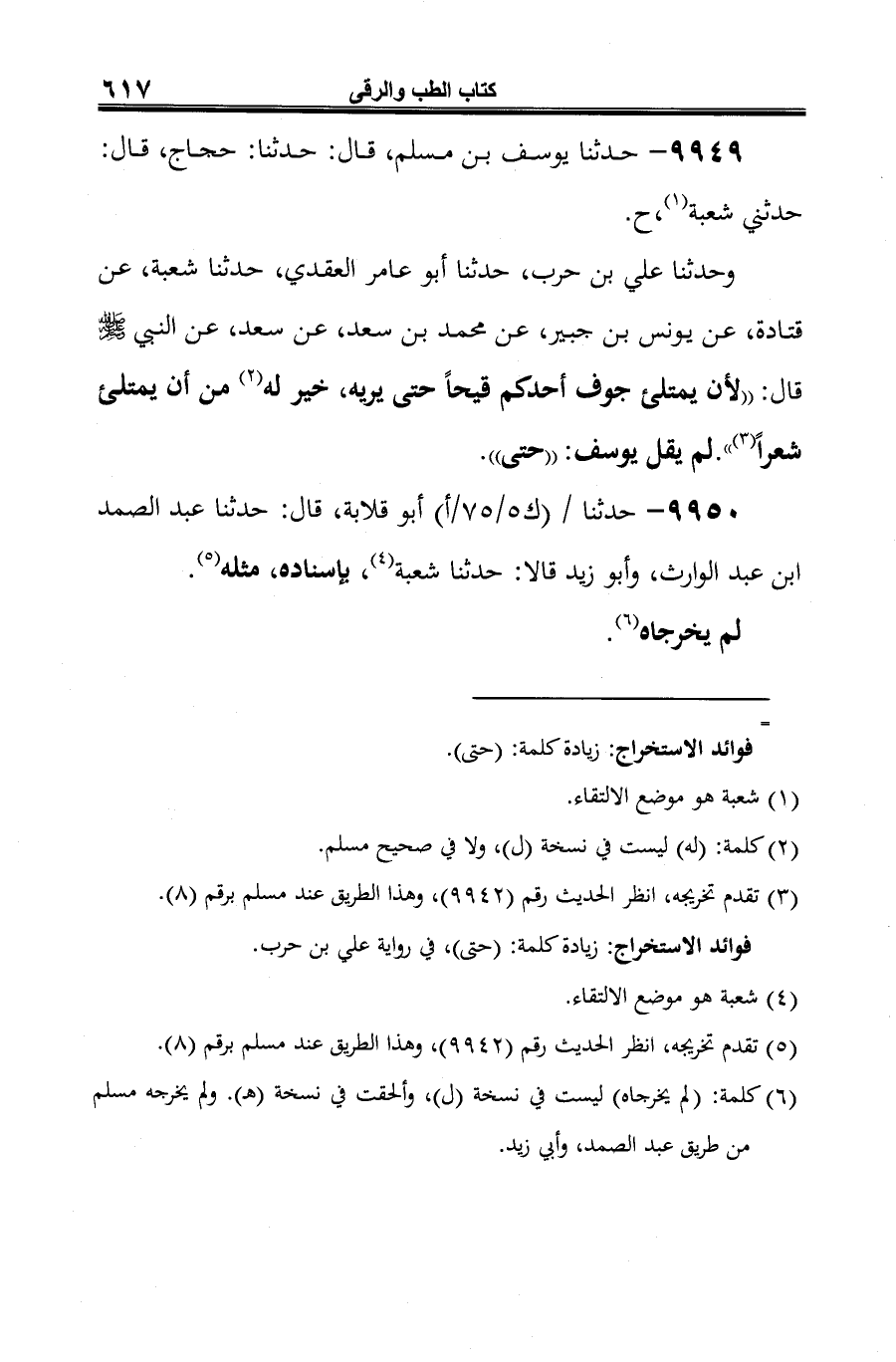 9949 - حدثنا يوسف بن مسلم، قال: حدثنا: حجاج، قال: حدثني شعبة (¬1)، ح.