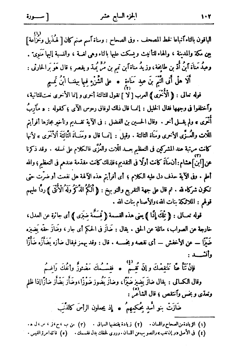 قَوْلُهُ تَعَالَى: (الْأُخْرى) الْعَرَبُ [لَا «٢»] تَقُولُ لِلثَّالِثَةِ أُخْرَى وَإِنَّمَا الْأُخْرَى نَعْتٌ لِلثَّانِيَةِ، وَاخْتَلَفُوا فِي وَجْهِهَا فَقَالَ الْخَلِيلُ: إِنَّمَا قَالَ ذَلِكَ لِوِفَاقِ رُءُوسِ الْآيِ، كَقَوْلِهِ: (مَآرِبُ أُخْرى) وَلَمْ يَقُلْ أُخَرُ. وَقَالَ الْحُسَيْنُ بْنُ الْفَضْلِ: فِي الْآيَةِ تَقْدِيمٌ وَتَأْخِيرٌ مَجَازُهَا أَفَرَأَيْتُمُ اللَّاتَ وَالْعُزَّى الْأُخْرَى وَمَنَاةَ الثَّالِثَةَ. وَقِيلَ: إِنَّمَا قَالَ (وَمَناةَ الثَّالِثَةَ الْأُخْرى) لِأَنَّهَا كَانَتْ مُرَتَّبَةً عِنْدَ الْمُشْرِكِينَ فِي التَّعْظِيمِ بَعْدَ اللَّاتِ وَالْعُزَّى فَالْكَلَامُ عَلَى نَسَقِهِ. وَقَدْ ذَكَرْنَا عَنِ [ابْنِ «٣»] هِشَامٍ: أَنَّ مَنَاةَ كَانَتْ أَوَّلًا فِي التَّقْدِيمِ، فَلِذَلِكَ كَانَتْ مُقَدَّمَةً عِنْدَهُمْ فِي التَّعْظِيمِ، وَاللَّهُ أَعْلَمُ. وَفِي الْآيَةِ حَذْفٌ دَلَّ عَلَيْهِ الْكَلَامُ، أَيْ أَفَرَأَيْتُمْ هَذِهِ الْآلِهَةَ هَلْ نَفَعَتْ أَوْ ضَرَّتْ حَتَّى تَكُونَ شُرَكَاءَ لِلَّهِ. ثُمَّ قَالَ عَلَى جِهَةِ التَّقْرِيعِ وَالتَّوْبِيخِ: (أَلَكُمُ الذَّكَرُ وَلَهُ الْأُنْثى) رَدًّا عَلَيْهِمْ قَوْلَهُمْ: الْمَلَائِكَةُ بَنَاتُ اللَّهِ، وَالْأَصْنَامُ بَنَاتُ اللَّهِ. قَوْلُهُ تَعَالَى: (تِلْكَ إِذاً) يَعْنِي هَذِهِ الْقِسْمَةُ (قِسْمَةٌ ضِيزى) أَيْ جَائِرَةٌ عَنِ الْعَدْلِ، خَارِجَةٌ عَنِ الصَّوَابِ، مَائِلَةٌ عَنِ الْحَقِّ. يُقَالُ: ضَازَ فِي الْحُكْمِ أَيْ جَارَ، وَضَازَ حَقَّهُ يَضِيزُهُ ضَيْزًا- عَنِ الْأَخْفَشِ- أَيْ نَقَصَهُ وَبَخَسَهُ. قَالَ: وَقَدْ يُهْمَزُ فَيُقَالُ ضَأَزَهُ يَضْأَزُهُ ضَأْزًا وَأَنْشَدَ: