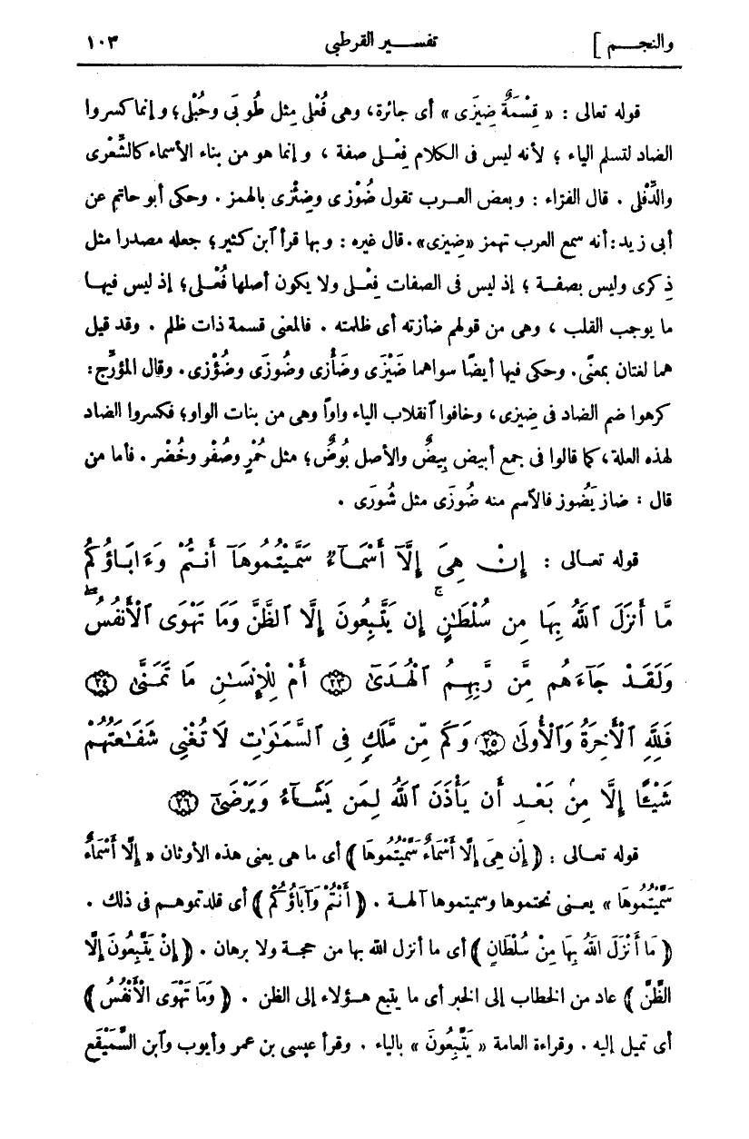إِنْ هِيَ إِلاَّ أَسْماءٌ سَمَّيْتُمُوها أَنْتُمْ وَآباؤُكُمْ مَا أَنْزَلَ اللَّهُ بِها مِنْ سُلْطانٍ إِنْ يَتَّبِعُونَ إِلاَّ الظَّنَّ وَما تَهْوَى الْأَنْفُسُ وَلَقَدْ جاءَهُمْ مِنْ رَبِّهِمُ الْهُدى (٢٣) أَمْ لِلْإِنْسانِ مَا تَمَنَّى (٢٤) فَلِلَّهِ الْآخِرَةُ وَالْأُولى (٢٥) وَكَمْ مِنْ مَلَكٍ فِي السَّماواتِ لَا تُغْنِي شَفاعَتُهُمْ شَيْئاً إِلاَّ مِنْ بَعْدِ أَنْ يَأْذَنَ اللَّهُ لِمَنْ يَشاءُ وَيَرْضى (٢٦)