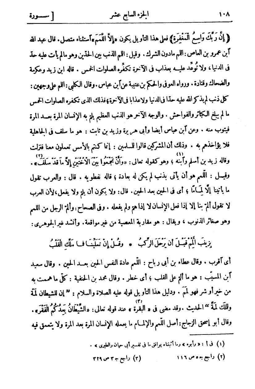 (إِنَّ رَبَّكَ واسِعُ الْمَغْفِرَةِ) فَعَلَى هَذَا التَّأْوِيلِ يكون (إِلَّا اللَّمَمَ) استثناء متصل. قال عبد الله ابن عَمْرِو بْنِ الْعَاصِ: اللَّمَمُ مَا دُونَ الشِّرْكِ. وَقِيلَ: اللَّمَمُ الذَّنْبُ بَيْنَ الْحَدَّيْنِ وَهُوَ مَا لَمْ يَأْتِ عَلَيْهِ حَدٌّ فِي الدُّنْيَا، وَلَا تُوُعِّدَ عَلَيْهِ بِعَذَابٍ فِي الْآخِرَةِ تُكَفِّرُهُ الصَّلَوَاتُ الْخَمْسُ. قَالَهُ ابْنُ زَيْدٍ وَعِكْرِمَةُ وَالضَّحَّاكُ وَقَتَادَةُ. وَرَوَاهُ الْعَوْفِيُّ وَالْحَكَمُ بْنُ عُتَيْبَةَ عَنِ ابْنِ عَبَّاسٍ. وَقَالَ الْكَلْبِيُّ: اللَّمَمُ عَلَى وَجْهَيْنِ: كُلُّ ذَنْبٍ لَمْ يَذْكُرِ اللَّهُ عَلَيْهِ حَدًّا فِي الدُّنْيَا وَلَا عَذَابًا فِي الْآخِرَةِ، فَذَلِكَ الَّذِي تُكَفِّرُهُ الصَّلَوَاتُ الْخَمْسُ مَا لَمْ يَبْلُغِ الْكَبَائِرَ وَالْفَوَاحِشَ. وَالْوَجْهُ الْآخَرُ هُوَ الذَّنْبُ الْعَظِيمُ يُلِمُّ بِهِ الْإِنْسَانُ الْمَرَّةَ بَعْدَ الْمَرَّةِ فَيَتُوبُ مِنْهُ. وَعَنِ ابْنِ عَبَّاسٍ أَيْضًا وَأَبِي هُرَيْرَةَ وَزَيْدِ بْنِ ثَابِتٍ: هُوَ مَا سَلَفَ فِي الْجَاهِلِيَّةِ فَلَا يُؤَاخِذُهُمْ بِهِ. وَذَلِكَ أَنَّ الْمُشْرِكِينَ قَالُوا لِلْمُسْلِمِينَ: إِنَّمَا كُنْتُمْ بِالْأَمْسِ تَعْمَلُونَ مَعَنَا فَنَزَلَتْ وَقَالَهُ زَيْدُ بْنُ أَسْلَمَ وَابْنُهُ «١»، وَهُوَ كَقَوْلِهِ تَعَالَى: (وَأَنْ تَجْمَعُوا بَيْنَ الْأُخْتَيْنِ إِلَّا مَا قَدْ سَلَفَ) «٢». وَقِيلَ: اللَّمَمُ هُوَ أَنْ يَأْتِيَ بِذَنْبٍ لَمْ يَكُنْ لَهُ بِعَادَةٍ، قَالَهُ نِفْطَوَيْهِ. قَالَ: وَالْعَرَبُ تَقُولُ مَا يَأْتِينَا إِلَّا لِمَامًا، أَيْ فِي الْحِينِ بَعْدَ الْحِينِ. قَالَ: وَلَا يَكُونُ أَنْ يُلِمَّ وَلَا يَفْعَلَ، لِأَنَّ الْعَرَبَ لَا تَقُولُ أَلَمَّ بِنَا إِلَّا إِذَا فَعَلَ الْإِنْسَانُ لَا إِذَا هَمَّ وَلَمْ يَفْعَلْهُ. وَفِي الصِّحَاحِ: وَأَلَمَّ الرَّجُلُ مِنَ اللَّمَمِ وَهُوَ صَغَائِرُ الذُّنُوبِ، وَيُقَالُ: هُوَ مُقَارَبَةُ الْمَعْصِيَةِ مِنْ غَيْرِ مُوَاقَعَةٍ. وَأَنْشَدَ غَيْرُ الْجَوْهَرِيُّ: