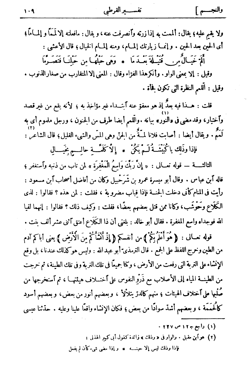 وَقِيلَ: إِلَّا بِمَعْنَى الْوَاوِ. وَأَنْكَرَ هَذَا الْفَرَّاءُ وَقَالَ: الْمَعْنَى إِلَّا الْمُتَقَارِبَ مِنْ صِغَارِ الذُّنُوبِ. وَقِيلَ: اللَّمَمُ النَّظْرَةُ الَّتِي تَكُونُ فَجْأَةً. قُلْتُ: هَذَا فِيهِ بُعْدٌ إِذْ هُوَ مَعْفُوٌّ عَنْهُ ابْتِدَاءً غَيْرُ مُؤَاخَذٍ بِهِ، لِأَنَّهُ يَقَعُ مِنْ غَيْرِ قَصْدٍ وَاخْتِيَارٍ، وَقَدْ مَضَى فِي (النُّورِ) «١» بَيَانُهُ. وَاللَّمَمُ أَيْضًا طَرَفٌ مِنَ الْجُنُونِ، وَرَجُلٌ مَلْمُومٌ أَيْ بِهِ لَمَمٌ. وَيُقَالُ أَيْضًا: أَصَابَتْ فُلَانًا لَمَّةٌ مِنَ الْجِنِّ وَهِيَ الْمَسُّ وَالشَّيْءُ الْقَلِيلُ، قَالَ الشَّاعِرُ «٢»: