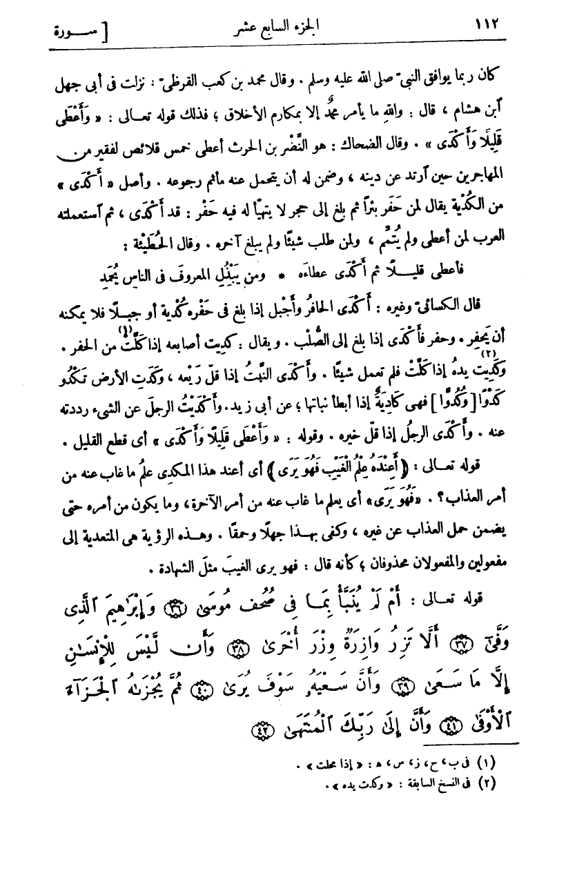 كَانَ رُبَّمَا يُوَافِقُ النَّبِيَّ صَلَّى اللَّهُ عَلَيْهِ وَسَلَّمَ. وَقَالَ مُحَمَّدُ بْنُ كَعْبٍ الْقُرَظِيُّ: نَزَلَتْ فِي أبي جهل ابن هِشَامٍ، قَالَ: وَاللَّهِ مَا يَأْمُرُ مُحَمَّدٌ إِلَّا بِمَكَارِمِ الْأَخْلَاقِ، فَذَلِكَ قَوْلُهُ تَعَالَى: (وَأَعْطى قَلِيلًا وَأَكْدى). وقال الضحاك: هو النضر بن الحرث أَعْطَى خَمْسَ قَلَائِصَ لِفَقِيرٍ مِنَ الْمُهَاجِرِينَ حِينَ ارْتَدَّ عَنْ دِينِهِ، وَضَمِنَ لَهُ أَنْ يَتَحَمَّلَ عَنْهُ مَأْثَمَ رُجُوعِهِ. وَأَصْلُ (أَكْدى) مِنَ الْكُدْيَةِ يُقَالُ لِمَنْ حَفَرَ بِئْرًا ثُمَّ بَلَغَ إِلَى حَجَرٍ لَا يَتَهَيَّأُ لَهُ فِيهِ حَفْرٌ: قَدْ أَكْدَى، ثُمَّ اسْتَعْمَلَتْهُ الْعَرَبُ لِمَنْ أَعْطَى وَلَمْ يُتَمِّمْ، وَلِمَنْ طَلَبَ شَيْئًا وَلَمْ يَبْلُغْ آخِرَهُ. وَقَالَ الْحُطَيْئَةُ: