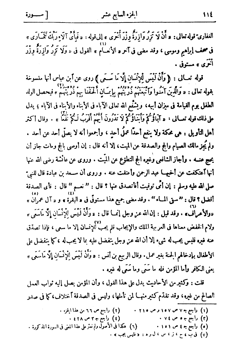 الْغِفَارِيُّ قَوْلُهُ تَعَالَى: (أَلَّا تَزِرُ وازِرَةٌ وِزْرَ أُخْرى) إِلَى قَوْلِهِ: (فَبِأَيِّ آلاءِ رَبِّكَ تَتَمارى) فِي صُحُفِ إِبْرَاهِيمَ وَمُوسَى، وَقَدْ مَضَى فِي آخِرِ (الْأَنْعَامِ) «١» الْقَوْلُ فِي (وَلا تَزِرُ وازِرَةٌ وِزْرَ أُخْرى) مُسْتَوْفًى. قَوْلُهُ تَعَالَى: (وَأَنْ لَيْسَ لِلْإِنْسانِ إِلَّا مَا سَعى) رُوِيَ عَنِ ابْنِ عَبَّاسٍ أَنَّهَا مَنْسُوخَةٌ بِقَوْلِهِ تَعَالَى: (وَالَّذِينَ آمَنُوا وَاتَّبَعَتْهُمْ ذُرِّيَّتُهُمْ بِإِيمانٍ أَلْحَقْنا بِهِمْ ذُرِّيَّتَهُمْ) «٢» فَيَحْصُلُ الْوَلَدُ الطِّفْلُ يَوْمَ الْقِيَامَةِ فِي مِيزَانِ أَبِيهِ، وَيُشَفِّعُ اللَّهُ تَعَالَى الْآبَاءَ فِي الْأَبْنَاءِ وَالْأَبْنَاءَ فِي الْآبَاءِ، يَدُلُّ عَلَى ذَلِكَ قَوْلُهُ تَعَالَى: (آباؤُكُمْ وَأَبْناؤُكُمْ لَا تَدْرُونَ أَيُّهُمْ أَقْرَبُ لَكُمْ نَفْعاً) «٣». وَقَالَ أَكْثَرُ أَهْلِ التَّأْوِيلِ: هِيَ مُحْكَمَةٌ ولا ينفع أحدا عمل أحد، وأجمعوا أنه لَا يُصَلِّي أَحَدٌ عَنْ أَحَدٍ. وَلَمْ يُجِزْ مَالِكٌ الصِّيَامَ وَالْحَجَّ وَالصَّدَقَةَ عَنِ الْمَيِّتِ، إِلَّا أَنَّهُ قَالَ: إِنْ أَوْصَى بِالْحَجِّ وَمَاتَ جَازَ أَنْ يُحَجَّ عَنْهُ. وَأَجَازَ الشَّافِعِيُّ وَغَيْرُهُ الْحَجَّ التَّطَوُّعَ عَنِ الْمَيِّتِ. وَرُوِيَ عَنْ عَائِشَةَ رَضِيَ اللَّهُ عَنْهَا أَنَّهَا اعْتَكَفَتْ عَنْ أَخِيهَا عَبْدِ الرَّحْمَنِ وَأَعْتَقَتْ عَنْهُ. وَرُوِيَ أَنَّ سَعْدَ بْنَ عُبَادَةَ قَالَ لِلنَّبِيِّ صَلَّى اللَّهُ عَلَيْهِ وَسَلَّمَ: إِنَّ أُمِّي تُوُفِّيَتْ أَفَأَتَصَدَّقُ عَنْهَا؟ قَالَ: (نَعَمْ) قَالَ: فَأَيُّ الصَّدَقَةِ أَفْضَلُ؟ قَالَ: (سَقْيُ الْمَاءِ). وَقَدْ مَضَى جَمِيعُ هَذَا مُسْتَوْفًى فِي (الْبَقَرَةِ) «٤» و (آل عمران) «٥» (والأعراف) «٦». وَقَدْ قِيلَ: إِنَّ اللَّهَ عَزَّ وَجَلَّ إِنَّمَا قَالَ: (وَأَنْ لَيْسَ لِلْإِنْسانِ إِلَّا مَا سَعى) وَلَامُ الْخَفْضِ مَعْنَاهَا فِي الْعَرَبِيَّةِ الْمِلْكُ وَالْإِيجَابُ فَلَمْ يَجِبْ «٧» لِلْإِنْسَانِ إِلَّا مَا سَعَى، فَإِذَا تصدق عنه غيره فليس يجب له شي إِلَّا أَنَّ اللَّهَ عَزَّ وَجَلَّ يَتَفَضَّلُ عَلَيْهِ بِمَا لَا يَجِبُ لَهُ، كَمَا يَتَفَضَّلُ عَلَى الْأَطْفَالِ بِإِدْخَالِهِمُ الْجَنَّةَ بِغَيْرِ عَمَلٍ. وَقَالَ الرَّبِيعُ بْنُ أَنَسٍ: (وَأَنْ لَيْسَ لِلْإِنْسانِ إِلَّا مَا سَعى) يَعْنِي الْكَافِرَ وَأَمَّا الْمُؤْمِنُ فَلَهُ مَا سَعَى وَمَا سَعَى لَهُ غَيْرُهُ. قُلْتُ: وَكَثِيرٌ مِنَ الْأَحَادِيثِ يَدُلُّ عَلَى هَذَا الْقَوْلِ، وَأَنَّ المؤمن يصل إليه ثَوَابِ الْعَمَلِ الصَّالِحِ مِنْ غَيْرِهِ، وَقَدْ تَقَدَّمَ كَثِيرٌ مِنْهَا لِمَنْ تَأَمَّلَهَا، وَلَيْسَ فِي الصَّدَقَةِ اختلاف، كما في صدر