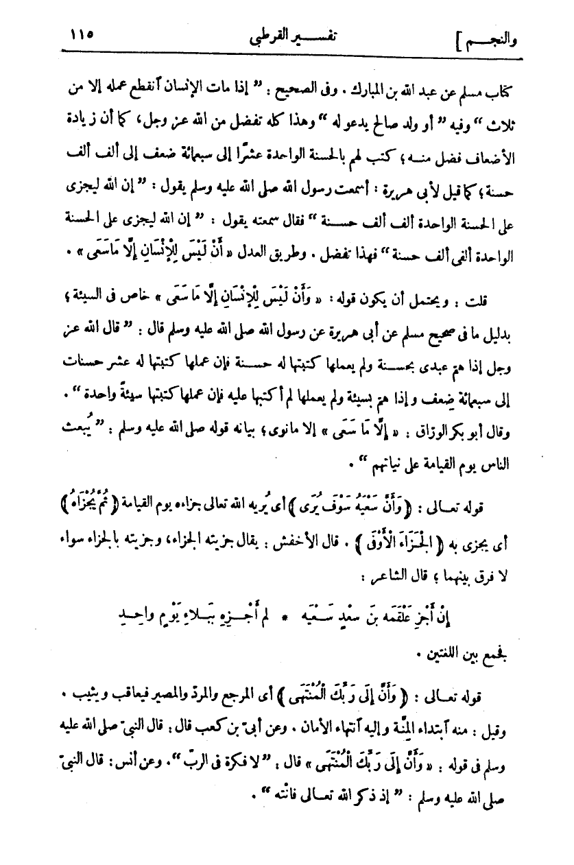 كِتَابِ مُسْلِمٍ عَنْ عَبْدِ اللَّهِ بْنِ الْمُبَارَكِ. وَفِي الصَّحِيحِ: (إِذَا مَاتَ الْإِنْسَانُ انْقَطَعَ عَمَلُهُ إِلَّا مِنْ ثَلَاثٍ) وَفِيهِ (أَوْ وَلَدٌ صَالِحٌ يَدْعُو لَهُ) وَهَذَا كُلُّهُ تَفَضُّلٌ مِنَ اللَّهِ عَزَّ وَجَلَّ، كَمَا أَنَّ زِيَادَةَ الْأَضْعَافِ فَضْلٌ مِنْهُ، كَتَبَ لَهُمْ بِالْحَسَنَةِ الْوَاحِدَةِ عَشْرًا إِلَى سَبْعِمِائَةِ ضِعْفٍ إِلَى أَلْفِ أَلْفِ حَسَنَةٍ، كَمَا قِيلَ لِأَبِي هُرَيْرَةَ: أَسَمِعْتَ رَسُولَ اللَّهِ صَلَّى اللَّهُ عَلَيْهِ وَسَلَّمَ يَقُولُ: (إِنَّ اللَّهَ لَيَجْزِي عَلَى الْحَسَنَةِ الْوَاحِدَةِ أَلْفَ أَلْفِ حَسَنَةٍ) فَقَالَ سَمِعْتُهُ يَقُولُ: (إِنَّ اللَّهَ لَيَجْزِي عَلَى الْحَسَنَةِ الْوَاحِدَةِ أَلْفَيْ أَلْفِ حَسَنَةٍ) فَهَذَا تَفَضُّلٌ. وَطَرِيقُ الْعَدْلِ (أَنْ لَيْسَ لِلْإِنْسانِ إِلَّا مَا سَعى). قُلْتُ: وَيَحْتَمِلُ أَنْ يَكُونَ قَوْلُهُ: (وَأَنْ لَيْسَ لِلْإِنْسانِ إِلَّا مَا سَعى) خَاصٌّ فِي السَّيِّئَةِ، بِدَلِيلِ مَا فِي صَحِيحِ مُسْلِمٍ عَنْ أَبِي هُرَيْرَةَ عَنْ رَسُولِ اللَّهِ صَلَّى اللَّهُ عَلَيْهِ وَسَلَّمَ قَالَ: (قَالَ اللَّهُ عَزَّ وَجَلَّ إِذَا هَمَّ عَبْدِي بِحَسَنَةٍ وَلَمْ يَعْمَلْهَا كَتَبْتُهَا لَهُ حَسَنَةً فَإِنْ عَمِلَهَا كَتَبْتُهَا لَهُ عَشْرَ حَسَنَاتٍ إِلَى سَبْعِمِائَةِ ضِعْفٍ وَإِذَا هَمَّ بِسَيِّئَةٍ وَلَمْ يَعْمَلْهَا لَمْ أَكْتُبْهَا عَلَيْهِ فَإِنْ عَمِلَهَا كَتَبْتُهَا سَيِّئَةً وَاحِدَةً (. وَقَالَ أَبُو بَكْرٍ الْوَرَّاقُ:) إِلَّا مَا سَعى) إِلَّا مَا نَوَى، بَيَانُهُ قَوْلُهُ صَلَّى اللَّهُ عَلَيْهِ وَسَلَّمَ: (يُبْعَثُ النَّاسُ يَوْمَ الْقِيَامَةِ عَلَى نِيَّاتِهِمْ). قَوْلُهُ تَعَالَى: (وَأَنَّ سَعْيَهُ سَوْفَ يُرى) أَيْ يُرِيَهُ اللَّهُ تَعَالَى جَزَاءَهُ يَوْمَ الْقِيَامَةِ (ثُمَّ يُجْزاهُ) أَيْ يُجْزَى بِهِ (الْجَزاءَ الْأَوْفى). قَالَ الْأَخْفَشُ: يُقَالُ جَزَيْتُهُ الْجَزَاءَ، وَجَزَيْتُهُ بِالْجَزَاءِ سَوَاءٌ لَا فَرْقَ بَيْنَهُمَا، قَالَ الشَّاعِرُ: