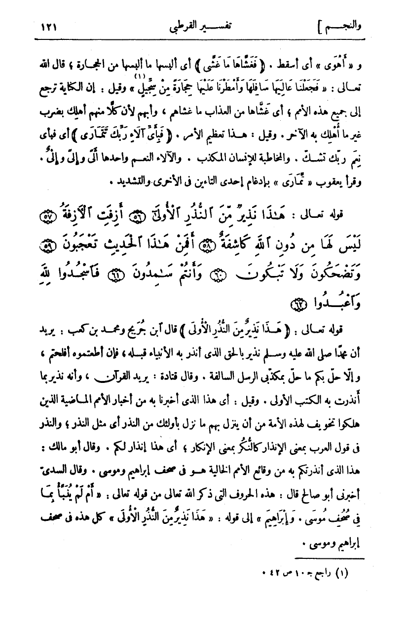 قَوْلُهُ تَعَالَى: (هَذَا نَذِيرٌ مِنَ النُّذُرِ الْأُولى) قَالَ ابْنُ جُرَيْجٍ وَمُحَمَّدُ بْنُ كَعْبٍ: يُرِيدُ أَنَّ مُحَمَّدًا صَلَّى اللَّهُ عَلَيْهِ وَسَلَّمَ نَذِيرٌ بِالْحَقِّ الَّذِي أَنْذَرَ بِهِ الْأَنْبِيَاءَ قَبْلَهُ، فَإِنْ أَطَعْتُمُوهُ أَفْلَحْتُمْ، وَإِلَّا حَلَّ بِكُمْ مَا حَلَّ بِمُكَذِّبِي الرُّسُلِ السَّالِفَةِ. وَقَالَ قَتَادَةُ: يُرِيدُ الْقُرْآنَ، وَأَنَّهُ نَذِيرٌ بِمَا أَنْذَرَتْ بِهِ الْكُتُبُ الْأُولَى. وَقِيلَ: أَيْ هَذَا الَّذِي أَخْبَرْنَا بِهِ مِنْ أَخْبَارِ الْأُمَمِ الْمَاضِيَةِ الَّذِينَ هَلَكُوا تَخْوِيفٌ لِهَذِهِ الْأُمَّةِ مِنْ أَنْ يَنْزِلَ بِهِمْ مَا نَزَلَ بِأُولَئِكَ مِنَ النُّذُرِ أَيْ مِثْلَ النُّذُرِ، وَالنُّذُرُ فِي قَوْلِ الْعَرَبِ بِمَعْنَى الْإِنْذَارِ كَالنُّكُرِ بِمَعْنَى الْإِنْكَارِ، أَيْ هَذَا إِنْذَارٌ لَكُمْ. وَقَالَ أَبُو مَالِكٍ: هَذَا الَّذِي أَنْذَرْتُكُمْ بِهِ مِنْ وَقَائِعِ الْأُمَمِ الْخَالِيَةِ هُوَ فِي صُحُفِ إِبْرَاهِيمَ وَمُوسَى. وَقَالَ السُّدِّيُّ أَخْبَرَنِي أَبُو صَالِحٍ قَالَ: هَذِهِ الْحُرُوفُ الَّتِي ذَكَرَ اللَّهُ تَعَالَى مِنْ قَوْلِهِ تَعَالَى: (أَمْ لَمْ يُنَبَّأْ بِما فِي صُحُفِ مُوسى. وَإِبْراهِيمَ) إِلَى قَوْلِهِ: (هَذَا نَذِيرٌ مِنَ النُّذُرِ الْأُولى) كُلُّ هذه في صحف إبراهيم وموسى.