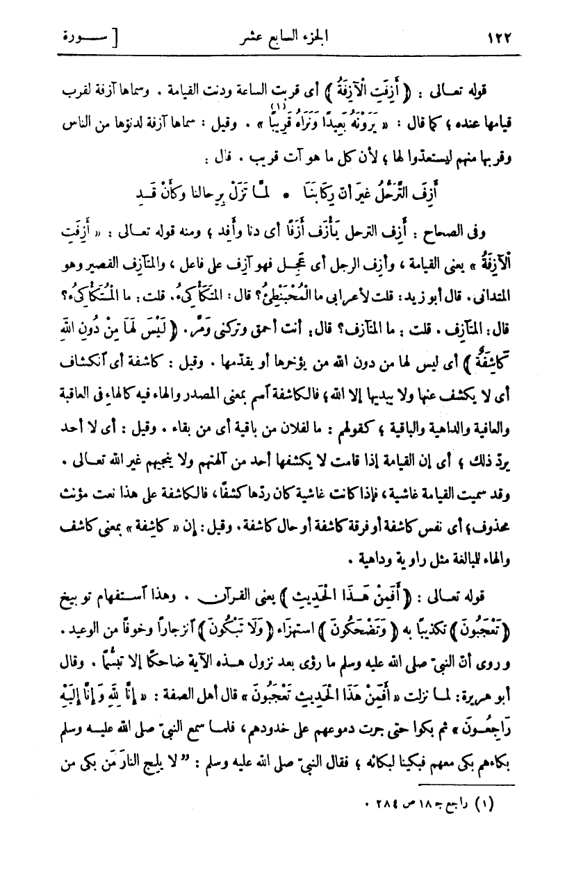 وَفِي الصِّحَاحِ: أَزِفَ التَّرَحُّلُ يَأْزَفُ أَزَفًا أَيْ دَنَا وَأَفِدَ، وَمِنْهُ قَوْلُهُ تَعَالَى: (أَزِفَتِ الْآزِفَةُ) يَعْنِي الْقِيَامَةَ، وَأَزِفَ الرَّجُلُ أَيْ عَجِلَ فَهُوَ آزِفٌ عَلَى فَاعِلٍ، وَالْمُتَآزِفُ الْقَصِيرُ وَهُوَ الْمُتَدَانِي. قَالَ أَبُو زَيْدٍ: قُلْتُ لِأَعْرَابِيٍّ مَا الْمُحْبَنْطِئُ؟ قَالَ: الْمُتَكَأْكِئُ. قُلْتُ: مَا الْمُتَكَأْكِئُ؟ قَالَ: الْمُتَآزِفُ. قُلْتُ: مَا الْمُتَآزِفُ؟ قَالَ: أَنْتَ أَحْمَقُ وَتَرَكَنِي وَمَرَّ. (لَيْسَ لَها مِنْ دُونِ اللَّهِ كاشِفَةٌ) أَيْ لَيْسَ لَهَا مِنْ دُونِ اللَّهِ مَنْ يُؤَخِّرُهَا أَوْ يُقَدِّمُهَا. وَقِيلَ: كَاشِفَةٌ أَيِ انْكِشَافٌ أَيْ لَا يَكْشِفُ عَنْهَا وَلَا يُبْدِيهَا إِلَّا اللَّهُ، فَالْكَاشِفَةُ اسْمٌ بِمَعْنَى الْمَصْدَرِ وَالْهَاءُ فِيهِ كَالْهَاءِ فِي الْعَاقِبَةِ وَالْعَافِيَةِ وَالدَّاهِيَةِ وَالْبَاقِيَةِ، كَقَوْلِهِمْ: مَا لِفُلَانٍ مِنْ بَاقِيَةٍ أَيْ مِنْ بَقَاءٍ. وَقِيلَ: أَيْ لَا أَحَدَ يَرُدُّ ذَلِكَ، أَيْ أَنَّ الْقِيَامَةَ إِذَا قَامَتْ لَا يَكْشِفُهَا أَحَدٌ مِنْ آلِهَتِهِمْ وَلَا يُنْجِيهِمْ غَيْرُ اللَّهِ تَعَالَى. وَقَدْ سُمِّيَتِ الْقِيَامَةُ غَاشِيَةٌ، فَإِذَا كَانَتْ غَاشِيَةٌ كَانَ رَدُّهَا كَشْفًا، فَالْكَاشِفَةُ عَلَى هَذَا نَعْتُ مُؤَنَّثٍ مَحْذُوفٍ، أي نقس كَاشِفَةٌ أَوْ فِرْقَةٌ كَاشِفَةٌ أَوْ حَالٌ كَاشِفَةٌ. وَقِيلَ: إِنَّ (كاشِفَةٌ) بِمَعْنَى كَاشِفٍ وَالْهَاءُ لِلْمُبَالَغَةِ مِثْلُ رَاوِيَةٍ وَدَاهِيَةٍ. قَوْلُهُ تَعَالَى: (أَفَمِنْ هذَا الْحَدِيثِ) يَعْنِي الْقُرْآنَ. وَهَذَا اسْتِفْهَامُ تَوْبِيخٍ (تَعْجَبُونَ) تَكْذِيبًا بِهِ (وَتَضْحَكُونَ) اسْتِهْزَاءً (وَلا تَبْكُونَ) انْزِجَارًا وَخَوْفًا مِنَ الْوَعِيدِ. وَرُوِيَ أَنَّ النَّبِيَّ صَلَّى اللَّهُ عَلَيْهِ وَسَلَّمَ ما روى بَعْدَ نُزُولِ هَذِهِ الْآيَةِ ضَاحِكًا إِلَّا تَبَسُّمًا. وَقَالَ أَبُو هُرَيْرَةَ: لَمَّا نَزَلَتْ (أَفَمِنْ هذَا الْحَدِيثِ تَعْجَبُونَ) قَالَ أَهْلُ الصُّفَّةِ: (إِنَّا لِلَّهِ وَإِنَّا إِلَيْهِ راجِعُونَ) ثُمَّ بَكَوْا حَتَّى جَرَتْ دُمُوعُهُمْ عَلَى خُدُودِهِمْ، فَلَمَّا سَمِعَ النَّبِيُّ صَلَّى اللَّهُ عَلَيْهِ وَسَلَّمَ بُكَاءَهُمْ بَكَى مَعَهُمْ فَبَكَيْنَا لِبُكَائِهِ، فَقَالَ النَّبِيُّ صَلَّى اللَّهُ عَلَيْهِ وَسَلَّمَ: (لَا يلج النار من بكى من)
