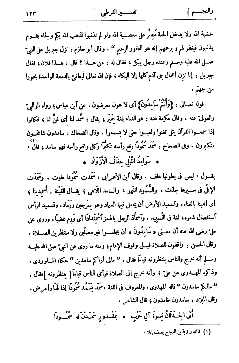 خَشْيَةِ اللَّهِ وَلَا يَدْخُلُ الْجَنَّةَ مُصِرٌّ عَلَى مَعْصِيَةِ اللَّهِ وَلَوْ لَمْ تُذْنِبُوا لَذَهَبَ اللَّهُ بِكُمْ وَلَجَاءَ بِقَوْمٍ يُذْنِبُونَ فَيَغْفِرُ لَهُمْ وَيَرْحَمُهُمْ إِنَّهُ هُوَ الْغَفُورُ الرَّحِيمُ (. وَقَالَ أَبُو حَازِمٍ: نَزَلَ جِبْرِيلَ عَلَى النَّبِيِّ صَلَّى اللَّهُ عَلَيْهِ وَسَلَّمَ وَعِنْدَهُ رَجُلٌ يَبْكِي، فَقَالَ لَهُ: مَنْ هَذَا؟ قَالَ: هَذَا فُلَانٌ، فَقَالَ جِبْرِيلُ: إِنَّا نَزِنُ أَعْمَالَ بَنِي آدَمَ كُلَّهَا إِلَّا الْبُكَاءَ، فَإِنَّ اللَّهَ تَعَالَى لَيُطْفِئُ بِالدَّمْعَةِ الْوَاحِدَةِ بُحُورًا مِنْ جَهَنَّمَ. قَوْلُهُ تَعَالَى: (وَأَنْتُمْ سامِدُونَ) أَيْ لَاهُونَ مُعْرِضُونَ. عَنِ ابْنِ عَبَّاسٍ، رَوَاهُ الْوَالِبِيُّ وَالْعَوْفِيُّ عَنْهُ. وَقَالَ عِكْرِمَةُ عَنْهُ: هُوَ الْغِنَاءُ بِلُغَةِ حِمْيَرَ، يُقَالُ: سَمِّدْ لَنَا أَيْ غَنِّ لَنَا، فَكَانُوا إِذَا سَمِعُوا الْقُرْآنَ يُتْلَى تَغَنَّوْا وَلَعِبُوا حَتَّى لَا يَسْمَعُوا. وَقَالَ الضَّحَّاكُ: سَامِدُونَ شَامِخُونَ مُتَكَبِّرُونَ. وَفِي الصِّحَاحِ: سَمَدَ سُمُودًا رَفَعَ رَأْسَهُ تَكَبُّرًا وَكُلُّ رَافِعٍ رَأْسَهُ فَهُوَ سَامِدٌ، قال»