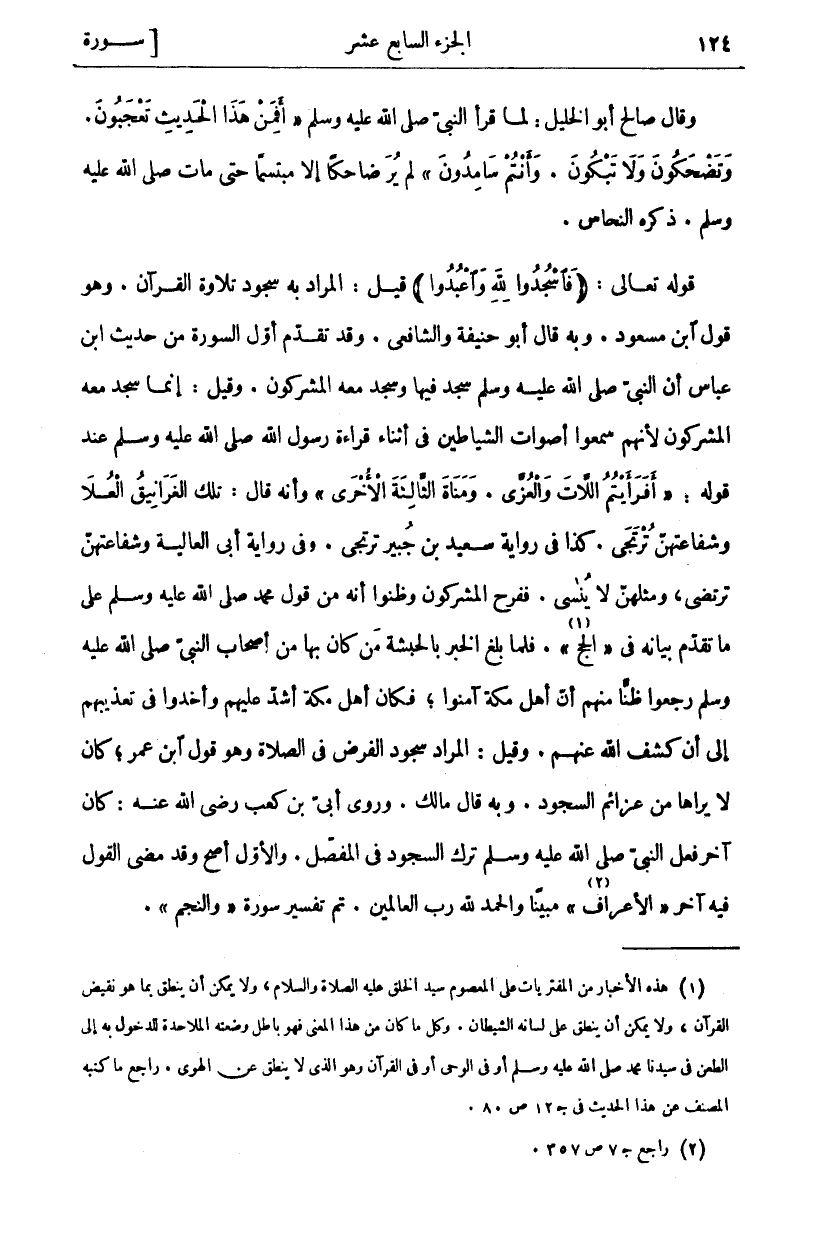 وَقَالَ صَالِحُ أَبُو الْخَلِيلِ: لَمَّا قَرَأَ النَّبِيُّ صَلَّى اللَّهُ عَلَيْهِ وَسَلَّمَ (أَفَمِنْ هذَا الْحَدِيثِ تَعْجَبُونَ. وَتَضْحَكُونَ وَلا تَبْكُونَ. وَأَنْتُمْ سامِدُونَ) لَمْ يُرَ ضَاحِكًا إِلَّا مُبْتَسِمًا حَتَّى مَاتَ صَلَّى اللَّهُ عَلَيْهِ وَسَلَّمَ. ذَكَرَهُ النَّحَّاسُ. قَوْلُهُ تَعَالَى: (فَاسْجُدُوا لِلَّهِ وَاعْبُدُوا) قِيلَ: الْمُرَادُ بِهِ سُجُودُ تِلَاوَةِ الْقُرْآنِ. وَهُوَ قَوْلُ ابْنِ مَسْعُودٍ. وَبِهِ قَالَ أَبُو حَنِيفَةَ وَالشَّافِعِيُّ. وَقَدْ تَقَدَّمَ أَوَّلَ السُّورَةِ مِنْ حَدِيثُ ابْنِ عَبَّاسٍ أَنَّ النَّبِيَّ صَلَّى اللَّهُ عَلَيْهِ وَسَلَّمَ سَجَدَ فِيهَا وَسَجَدَ مَعَهُ الْمُشْرِكُونَ. وَقِيلَ: إِنَّمَا سَجَدَ مَعَهُ الْمُشْرِكُونَ لِأَنَّهُمْ سَمِعُوا أَصْوَاتَ الشَّيَاطِينِ فِي أَثْنَاءِ قِرَاءَةُ رَسُولِ اللَّهِ صَلَّى اللَّهُ عَلَيْهِ وَسَلَّمَ عند قَوْلِهِ: (أَفَرَأَيْتُمُ اللَّاتَ وَالْعُزَّى. وَمَناةَ الثَّالِثَةَ الْأُخْرى) وَأَنَّهُ قَالَ: تِلْكَ الْغَرَانِيقُ الْعُلَا وَشَفَاعَتُهُنَّ تُرْتَجَى. كَذَا فِي رِوَايَةِ سَعِيدِ بْنِ جُبَيْرٍ تُرْتَجَى. وَفِي رِوَايَةِ أَبِي الْعَالِيَةِ وَشَفَاعَتُهُنَّ تُرْتَضَى، وَمِثْلُهُنَّ لَا يُنْسَى. فَفَرِحَ الْمُشْرِكُونَ وَظَنُّوا أَنَّهُ مِنْ قَوْلِ مُحَمَّدٍ صَلَّى اللَّهُ عَلَيْهِ وَسَلَّمَ عَلَى مَا تَقَدَّمَ بَيَانُهُ فِي (الْحَجِّ) «١». فَلَمَّا بَلَغَ الْخَبَرَ بِالْحَبَشَةِ مَنْ كَانَ بِهَا مِنْ أَصْحَابِ النَّبِيِّ صَلَّى اللَّهُ عَلَيْهِ وَسَلَّمَ رَجَعُوا ظَنًّا مِنْهُمْ أَنَّ أَهْلَ مَكَّةَ آمَنُوا، فَكَانَ أَهْلُ مَكَّةَ أَشَدَّ عَلَيْهِمْ وَأَخَذُوا فِي تَعْذِيبِهِمْ إِلَى أَنْ كَشَفَ اللَّهُ عَنْهُمْ. وَقِيلَ: الْمُرَادُ سُجُودُ الْفَرْضِ فِي الصَّلَاةِ وَهُوَ قَوْلُ ابْنِ عُمَرَ، كَانَ لَا يَرَاهَا مِنْ عَزَائِمِ السُّجُودِ. وَبِهِ قَالَ مَالِكٌ. وَرَوَى أُبَيُّ بْنُ كَعْبٍ رَضِيَ اللَّهُ عَنْهُ: كَانَ آخِرُ فِعْلِ النَّبِيِّ صَلَّى اللَّهُ عَلَيْهِ وَسَلَّمَ تَرْكَ السُّجُودِ فِي الْمُفَصَّلِ. وَالْأَوَّلُ أَصَحُّ وَقَدْ مَضَى الْقَوْلُ فِيهِ آخِرَ (الْأَعْرَافِ) «٢» مُبَيَّنًا وَالْحَمْدُ لِلَّهِ رَبِّ الْعَالَمِينَ. تَمَّ تفسير سورة (والنجم).