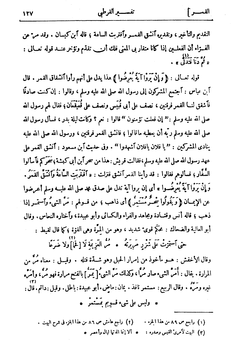 التَّقْدِيمِ وَالتَّأْخِيرِ، وَتَقْدِيرُهُ انْشَقَّ الْقَمَرُ وَاقْتَرَبَتِ السَّاعَةُ، قَالَهُ ابْنُ كَيْسَانَ. وَقَدْ مَرَّ عَنِ الْفَرَّاءِ أَنَّ الْفِعْلَيْنِ إِذَا كَانَا مُتَقَارِبَيِ الْمَعْنَى فَلَكَ أَنْ تُقَدِّمَ وَتُؤَخِّرَ عِنْدَ قَوْلِهِ تَعَالَى: (ثُمَّ دَنا فَتَدَلَّى) «١». قَوْلُهُ تَعَالَى: (وَإِنْ يَرَوْا آيَةً يُعْرِضُوا) هَذَا يَدُلُّ عَلَى أَنَّهُمْ رَأَوُا انْشِقَاقَ الْقَمَرِ. قَالَ ابْنُ عَبَّاسٍ: اجْتَمَعَ الْمُشْرِكُونَ إِلَى رَسُولِ اللَّهِ صَلَّى اللَّهُ عَلَيْهِ وَسَلَّمَ، وَقَالُوا: إِنْ كُنْتَ صَادِقًا فَاشْقُقْ لَنَا الْقَمَرَ فِرْقَتَيْنِ، نِصْفٌ عَلَى أَبِي قُبَيْسٍ وَنِصْفٌ عَلَى قُعَيْقِعَانَ، فَقَالَ لَهُمْ رَسُولُ اللَّهِ صَلَّى اللَّهُ عَلَيْهِ وَسَلَّمَ: (إِنْ فَعَلْتُ تُؤْمِنُونَ) قَالُوا: نَعَمْ؟ وَكَانَتْ لَيْلَةَ بَدْرٍ، فَسَأَلَ رَسُولَ اللَّهِ صَلَّى اللَّهُ عَلَيْهِ وَسَلَّمَ رَبَّهُ أَنْ يُعْطِيَهُ مَا قَالُوا، فَانْشَقَّ الْقَمَرُ فِرْقَتَيْنِ، وَرَسُولُ اللَّهِ صَلَّى اللَّهُ عَلَيْهِ وَسَلَّمَ يُنَادِي الْمُشْرِكِينَ: (يَا فُلَانُ يَا فُلَانُ اشْهَدُوا). وَفِي حَدِيثِ ابْنِ مَسْعُودٍ: انْشَقَّ الْقَمَرُ عَلَى عَهْدِ رَسُولِ اللَّهِ صَلَّى اللَّهُ عَلَيْهِ وَسَلَّمَ، فَقَالَتْ قُرَيْشٌ: هَذَا مِنْ سِحْرِ ابْنِ أَبِي كَبْشَةَ، سَحَرَكُمْ فَاسْأَلُوا السُّفَّارَ، فَسَأَلُوهُمْ فَقَالُوا: قَدْ رَأَيْنَا الْقَمَرَ انْشَقَّ فَنَزَلَتْ: (اقْتَرَبَتِ السَّاعَةُ وَانْشَقَّ الْقَمَرُ. وَإِنْ يَرَوْا آيَةً يُعْرِضُوا) أَيْ إِنْ يَرَوْا آيَةً تَدُلُّ عَلَى صِدْقِ مُحَمَّدٍ صَلَّى اللَّهُ عَلَيْهِ وَسَلَّمَ أَعْرَضُوا عَنْ الْإِيمَانِ (وَيَقُولُوا سِحْرٌ مُسْتَمِرٌّ) أَيْ ذَاهِبٌ، مِنْ قَوْلِهِمْ: مَرَّ الشَّيْءُ وَاسْتَمَرَّ إِذَا ذَهَبَ، قَالَهُ أَنَسٌ وَقَتَادَةُ وَمُجَاهِدٌ وَالْفَرَّاءُ وَالْكِسَائِيُّ وَأَبُو عُبَيْدَةَ، وَاخْتَارَهُ النَّحَّاسُ. وَقَالَ أَبُو الْعَالِيَةِ وَالضَّحَّاكُ: مُحْكَمٌ قَوِيٌّ شَدِيدٌ، وَهُوَ مِنَ الْمِرَّةِ وَهِيَ الْقُوَّةُ، كَمَا قَالَ لَقِيطٌ: