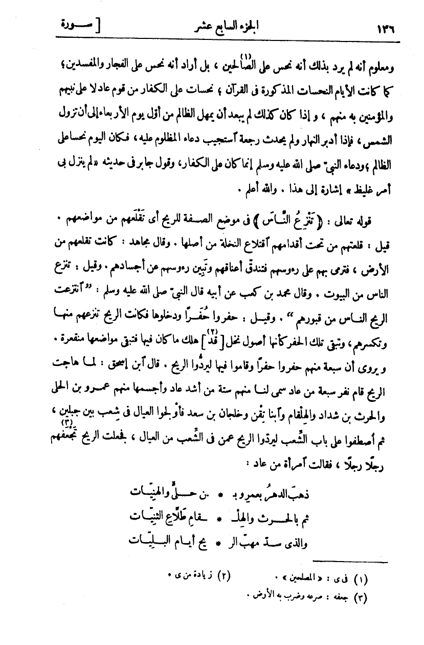 وَمَعْلُومٌ أَنَّهُ لَمْ يُرِدْ بِذَلِكَ أَنَّهُ نَحْسٌ عَلَى الصَّالِحِينَ «١»، بَلْ أَرَادَ أَنَّهُ نَحْسٌ عَلَى الْفُجَّارِ وَالْمُفْسِدِينَ، كَمَا كَانَتِ الْأَيَّامُ النَّحِسَاتُ الْمَذْكُورَةُ فِي الْقُرْآنِ، نَحِسَاتٍ عَلَى الْكُفَّارِ مِنْ قَوْمِ عَادٍ لَا عَلَى نَبِيِّهِمْ وَالْمُؤْمِنِينَ بِهِ مِنْهُمْ، وَإِذَا كَانَ كَذَلِكَ لَمْ يَبْعُدْ أَنْ يُمْهَلَ الظَّالِمُ مِنْ أَوَّلِ يَوْمِ الْأَرْبِعَاءِ إِلَى أَنْ تَزُولَ الشَّمْسُ، فَإِذَا أَدْبَرَ النَّهَارُ وَلَمْ يُحْدِثْ رَجْعَةً اسْتُجِيبَ دُعَاءُ الْمَظْلُومِ عَلَيْهِ، فَكَانَ الْيَوْمُ نَحْسًا عَلَى الظَّالِمِ، وَدُعَاءُ النَّبِيِّ صَلَّى اللَّهُ عَلَيْهِ وَسَلَّمَ إِنَّمَا كَانَ عَلَى الْكُفَّارِ، وَقَوْلُ جَابِرٍ فِي حَدِيثِهِ (لَمْ يَنْزِلْ بِي أَمْرٌ غليظ) إشارة إلى هذا. والله أعلم. قوله تعالى: (تَنْزِعُ النَّاسَ) فِي مَوْضِعِ الصِّفَةِ لِلرِّيحِ أَيْ تَقْلَعُهُمْ مِنْ مَوَاضِعِهِمْ. قِيلَ: قَلَعَتْهُمْ مِنْ تَحْتِ أَقْدَامِهِمُ اقْتِلَاعَ النَّخْلَةِ مِنْ أَصْلِهَا. وَقَالَ مُجَاهِدٌ: كَانَتْ تَقْلَعُهُمْ مِنَ الْأَرْضِ، فَتَرْمِي بِهِمْ عَلَى رؤوسهم فتندق أعناقهم وتبين رؤوسهم عَنْ أَجْسَادِهِمْ. وَقِيلَ: تَنْزِعُ النَّاسَ مِنَ الْبُيُوتِ. وَقَالَ مُحَمَّدُ بْنُ كَعْبٍ عَنْ أَبِيهِ قَالَ النَّبِيُّ صَلَّى اللَّهُ عَلَيْهِ وَسَلَّمَ: (انْتَزَعَتِ الرِّيحُ النَّاسَ مِنْ قُبُورِهِمْ). وَقِيلَ: حَفِرُوا حُفَرًا وَدَخَلُوهَا فَكَانَتِ الرِّيحُ تَنْزِعُهُمْ مِنْهَا وَتَكْسِرُهُمْ، وَتُبْقِي تِلْكَ الْحُفَرَ كَأَنَّهَا أُصُولُ نَخْلٍ [قَدْ «٢»] هَلَكَ مَا كَانَ فِيهَا فَتَبْقَى مَوَاضِعُهَا مُنْقَعِرَةً. يُرْوَى أَنَّ سَبْعَةً مِنْهُمْ حَفِرُوا حُفَرًا وَقَامُوا فِيهَا لِيَرُدُّوا الرِّيحَ. قَالَ ابْنُ إِسْحَاقَ: لَمَّا هَاجَتِ الرِّيحُ قَامَ نَفَرٌ سَبْعَةٌ مِنْ عَادٍ سُمِّيَ لَنَا مِنْهُمْ سِتَّةٌ مِنْ أَشَدِّ عَادٍ وَأَجْسَمِهَا مِنْهُمْ عمرو بن الحلي والحرث بْنُ شَدَّادٍ وَالْهِلْقَامُ وَابْنَا تِقْنٍ وَخَلْجَانُ بْنُ سَعْدٍ فَأَوْلَجُوا الْعِيَالَ فِي شِعْبٍ بَيْنَ جَبَلَيْنِ، ثُمَّ اصْطَفَوْا عَلَى بَابِ الشِّعْبِ لِيَرُدُّوا الرِّيحَ عَمَّنْ فِي الشِّعْبِ مِنَ الْعِيَالِ، فَجَعَلَتِ الرِّيحُ تَجْعَفُهُمْ «٣» رَجُلًا رَجُلًا، فَقَالَتِ امْرَأَةٌ مِنْ عَادٍ: