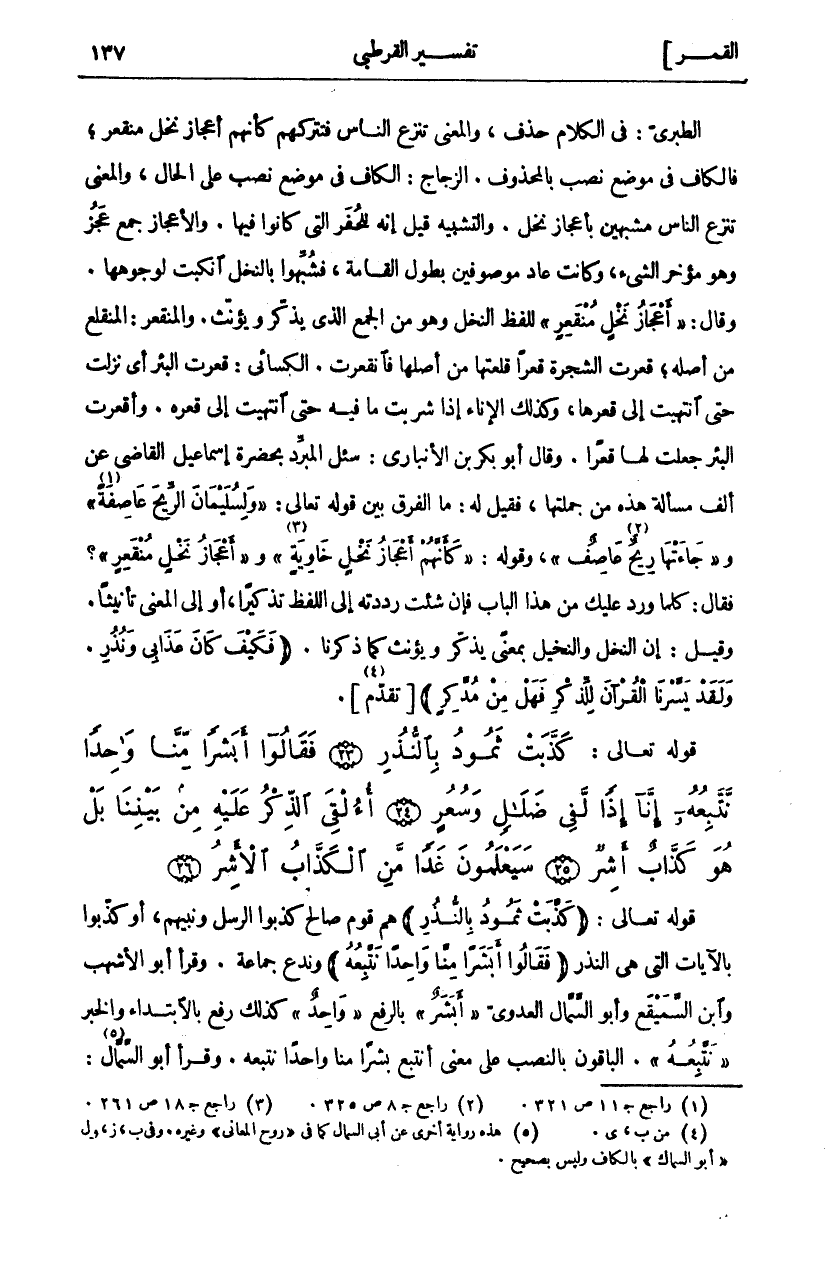 قَوْلُهُ تَعَالَى: (كَذَّبَتْ ثَمُودُ بِالنُّذُرِ) هُمْ قَوْمُ صَالِحٍ كَذَّبُوا الرُّسُلَ وَنَبِيَّهُمْ، أَوْ كَذَّبُوا بِالْآيَاتِ الَّتِي هِيَ النُّذُرُ (فَقالُوا أَبَشَراً مِنَّا واحِداً نَتَّبِعُهُ) وندع جماعة. وقرا أبو الأشهب وابن السميقع وَأَبُو السَّمَّالِ الْعَدَوِيُّ (أَبَشَرٌ) بِالرَّفْعِ (وَاحِدٌ) كَذَلِكَ رُفِعَ بِالِابْتِدَاءِ وَالْخَبَرُ (نَتَّبِعُهُ). الْبَاقُونَ بِالنَّصْبِ عَلَى مَعْنَى أَنَتَّبِعُ بَشَرًا مِنَّا وَاحِدًا نَتَّبِعُهُ. وَقَرَأَ أبو السمال «٥»: