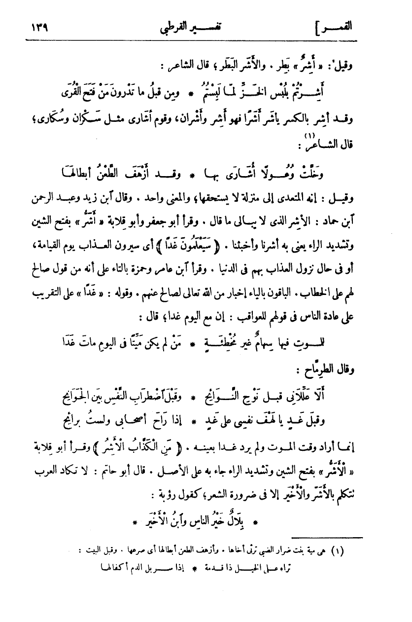 وَإِنَّمَا أَرَادَ وَقْتَ الْمَوْتِ وَلَمْ يُرِدْ غَدًا بِعَيْنِهِ. (مَنِ الْكَذَّابُ الْأَشِرُ) وَقَرَأَ أَبُو قِلَابَةَ (الْأَشَرُّ) بِفَتْحِ الشِّينِ وَتَشْدِيدِ الرَّاءِ جَاءَ بِهِ عَلَى الْأَصْلِ. قَالَ أَبُو حَاتِمٍ: لَا تَكَادُ الْعَرَبُ تَتَكَلَّمُ بِالْأَشَرِّ وَالْأَخْيَرِ إِلَّا فِي ضَرُورَةِ الشِّعْرِ، كَقَوْلِ رُؤْبَةَ: