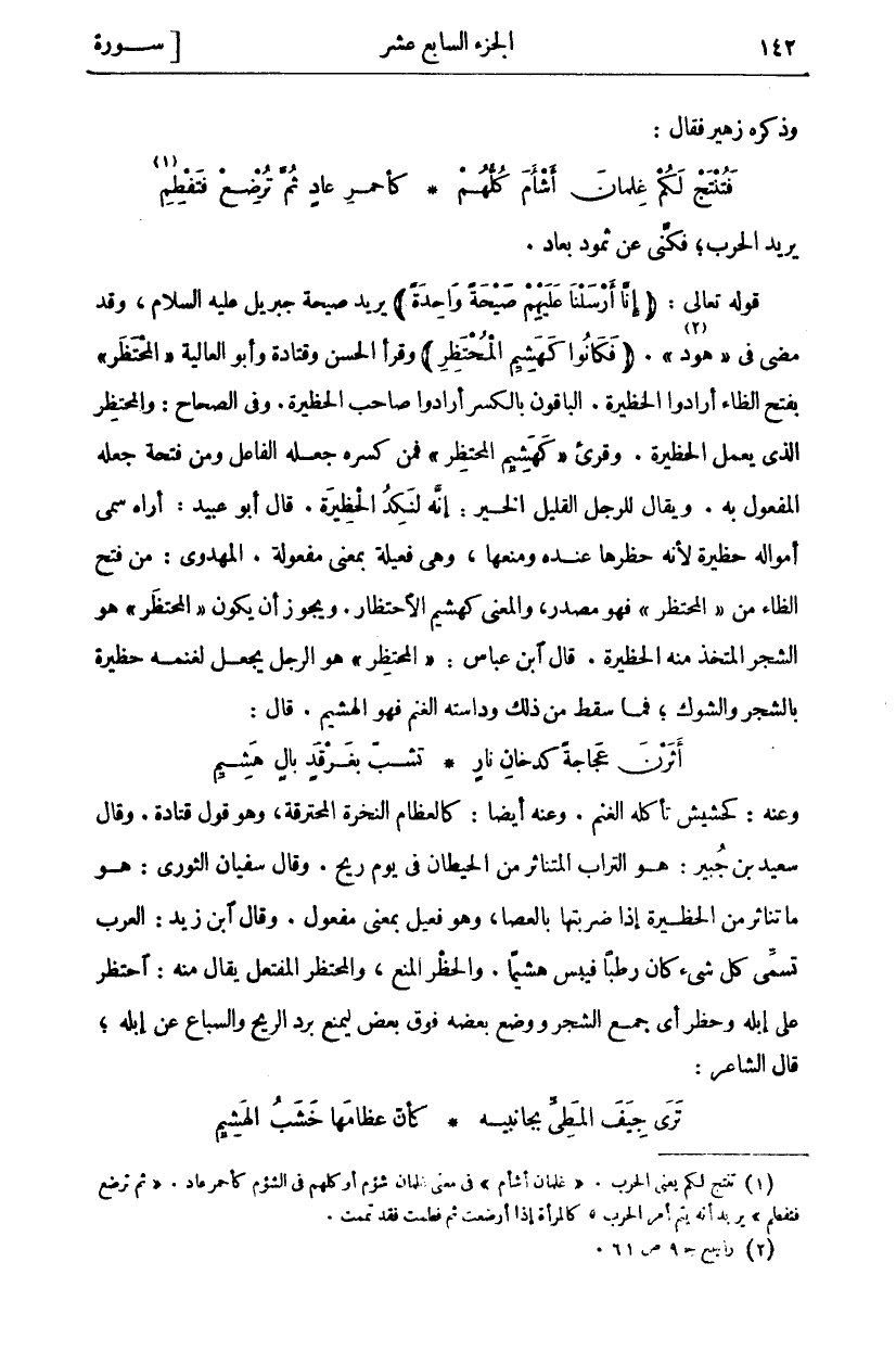 يُرِيدُ الْحَرْبَ، فَكَنَّى عَنْ ثَمُودَ بِعَادٍ. قَوْلُهُ تَعَالَى: (إِنَّا أَرْسَلْنا عَلَيْهِمْ صَيْحَةً واحِدَةً) يُرِيدُ صَيْحَةَ جِبْرِيلَ عَلَيْهِ السَّلَامُ، وَقَدْ مَضَى فِي (هُودٍ) «٢». (فَكانُوا كَهَشِيمِ الْمُحْتَظِرِ) وَقَرَأَ الْحَسَنُ وَقَتَادَةُ وَأَبُو الْعَالِيَةِ (الْمُحْتَظَرِ) بِفَتْحِ الظَّاءِ أَرَادُوا الْحَظِيرَةَ. الْبَاقُونَ بِالْكَسْرِ أَرَادُوا صَاحِبَ الْحَظِيرَةِ. وَفِي الصِّحَاحِ: وَالْمُحْتَظِرُ الذي يعمل الحظيرة. وقرى (كَهَشِيمِ الْمُحْتَظِرِ) فَمَنْ كَسَرَهُ جَعَلَهُ الْفَاعِلُ وَمَنْ فَتَحَهُ جَعَلَهُ الْمَفْعُولُ بِهِ. وَيُقَالُ لِلرَّجُلِ الْقَلِيلِ الْخَيْرِ: إِنَّهُ لَنَكِدٌ الْحَظِيرَةَ. قَالَ أَبُو عُبَيْدٍ: أَرَاهُ سَمَّى أَمْوَالَهُ حَظِيرَةً لِأَنَّهُ حَظَرَهَا عِنْدَهُ وَمَنَعَهَا، وَهِيَ فَعِيلَةٌ بِمَعْنَى مَفْعُولَةٍ. الْمَهْدَوِيُّ: مَنْ فَتَحَ الظَّاءَ مِنْ (الْمُحْتَظِرِ) فَهُوَ مَصْدَرٌ، وَالْمَعْنَى كَهَشِيمِ الِاحْتِظَارِ. وَيَجُوزُ أَنْ يَكُونَ (الْمُحْتَظِرِ) هُوَ الشَّجَرُ الْمُتَّخَذُ مِنْهُ الْحَظِيرَةَ. قَالَ ابْنُ عَبَّاسٍ: (الْمُحْتَظِرِ) هُوَ الرَّجُلُ يَجْعَلُ لِغَنَمِهِ حَظِيرَةً بِالشَّجَرِ وَالشَّوْكِ، فَمَا سَقَطَ مِنْ ذَلِكَ وَدَاسَتْهُ الْغَنَمُ فَهُوَ الْهَشِيمُ. قَالَ: