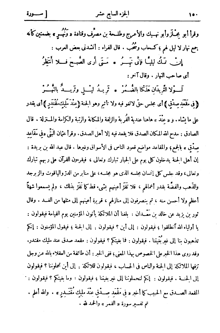 (فِي مَقْعَدِ صِدْقٍ) أَيْ مَجْلِسِ حَقٍّ لَا لَغْوَ فِيهِ وَلَا تَأْثِيمَ وَهُوَ الْجَنَّةُ (عِنْدَ مَلِيكٍ مُقْتَدِرٍ) أَيْ يَقْدِرُ عَلَى مَا يَشَاءُ. وَ (عِنْدَ) هَاهُنَا عِنْدِيَّةُ الْقُرْبَةِ وَالزُّلْفَةِ وَالْمَكَانَةِ وَالرُّتْبَةِ وَالْكَرَامَةِ وَالْمَنْزِلَةِ. قَالَ الصَّادِقُ: مَدَحَ اللَّهُ الْمَكَانَ الصِّدْقَ فَلَا يَقْعُدُ فِيهِ إِلَّا أَهْلُ الصِّدْقِ. وَقَرَأَ عُثْمَانُ الْبَتِّيُّ (فِي مَقَاعِدِ صِدْقٍ) بِالْجَمْعِ، وَالْمَقَاعِدُ مَوَاضِعُ قُعُودِ النَّاسِ فِي الْأَسْوَاقِ وَغَيْرِهَا. قَالَ عَبْدُ اللَّهِ بْنُ بُرَيْدَةَ: إِنَّ أَهْلَ الْجَنَّةِ يَدْخُلُونَ كُلَّ يَوْمٍ عَلَى الْجَبَّارِ تَبَارَكَ وَتَعَالَى، فَيَقْرَءُونَ الْقُرْآنَ عَلَى رَبِّهِمْ تَبَارَكَ وَتَعَالَى، وَقَدْ جَلَسَ كُلُّ إِنْسَانٍ مَجْلِسَهُ الَّذِي هُوَ مَجْلِسُهُ، عَلَى مَنَابِرَ مِنَ الدُّرِّ وَالْيَاقُوتِ وَالزَّبَرْجَدِ وَالذَّهَبِ وَالْفِضَّةِ بِقَدْرِ أَعْمَالِهِمْ، فَلَا تَقَرُّ أَعْيُنُهُمْ بِشَيْءٍ قَطُّ كَمَا تَقَرُّ بِذَلِكَ، وَلَمْ يَسْمَعُوا شَيْئًا أَعْظَمَ وَلَا أَحْسَنَ مِنْهُ، ثُمَّ يَنْصَرِفُونَ إِلَى مَنَازِلِهِمْ، قَرِيرَةٌ أَعْيُنُهُمْ إِلَى مِثْلِهَا مِنَ الْغَدِ. وَقَالَ ثَوْرِ بْنِ يَزِيدَ عَنْ خَالِدِ بْنِ مَعْدَانَ: بَلَغَنَا أَنَّ الْمَلَائِكَةَ يَأْتُونَ الْمُؤْمِنِينَ يَوْمَ الْقِيَامَةِ فَيَقُولُونَ: يَا أَوْلِيَاءَ اللَّهِ انْطَلِقُوا، فَيَقُولُونَ: إِلَى أَيْنَ؟ فَيَقُولُونَ: إِلَى الْجَنَّةِ، فَيَقُولُ الْمُؤْمِنُونَ: إِنَّكُمْ تَذْهَبُونَ بِنَا إِلَى غَيْرِ بُغْيَتِنَا. فَيَقُولُونَ: فَمَا بُغْيَتُكُمْ؟ فَيَقُولُونَ: مَقْعَدُ صِدْقٍ عِنْدَ مَلِيكٍ مُقْتَدِرٍ. وَقَدْ رُوِيَ هَذَا الْخَبَرُ عَلَى الْخُصُوصِ بِهَذَا الْمَعْنَى، فَفِي الْخَبَرِ: أَنَّ طَائِفَةً مِنَ الْعُقَلَاءِ بِاللَّهِ عَزَّ وَجَلَّ تَزُفُّهَا الْمَلَائِكَةُ إِلَى الْجَنَّةِ وَالنَّاسُ فِي الْحِسَابِ، فَيَقُولُونَ لِلْمَلَائِكَةِ: إِلَى أَيْنَ تَحْمِلُونَنَا؟ فَيَقُولُونَ إِلَى الْجَنَّةِ. فَيَقُولُونَ: إِنَّكُمْ لَتَحْمِلُونَنَا إِلَى غَيْرِ بُغْيَتِنَا، فَيَقُولُونَ: وَمَا بُغْيَتُكُمْ؟ فَيَقُولُونَ: الْمَقْعَدُ الصِّدْقُ مَعَ الْحَبِيبِ كَمَا أَخْبَرَ (فِي مَقْعَدِ صِدْقٍ عِنْدَ مَلِيكٍ مُقْتَدِرٍ) وَاللَّهُ أَعْلَمُ. تَمَّ تَفْسِيرُ سُورَةِ (الْقَمَرِ) والحمد لله.