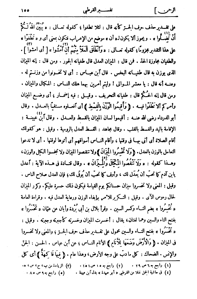 عَلَى تَقْدِيرِ حَذْفِ حَرْفِ الْجَرِّ كَأَنَّهُ قَالَ: لِئَلَّا تَطْغَوْا، كَقَوْلِهِ تَعَالَى: (يُبَيِّنُ اللَّهُ لَكُمْ أَنْ تَضِلُّوا) «١». وَيَجُوزُ أَلَّا يَكُونَ لِ (أَنْ) موضع من الاعراب فتكون بمعنى أي و (تَطْغَوْا) عَلَى هَذَا التَّقْدِيرِ مَجْزُومًا، كَقَوْلِهِ تَعَالَى: (وَانْطَلَقَ الْمَلَأُ مِنْهُمْ أَنِ «٢» امْشُوا) [أَيِ امْشُوا «٣»]. وَالطُّغْيَانُ مُجَاوَزَةُ الْحَدِّ. فَمَنْ قَالَ: الْمِيزَانُ الْعَدْلُ قَالَ طُغْيَانُهُ الْجَوْرُ. وَمَنْ قَالَ: إِنَّهُ الْمِيزَانُ الَّذِي يُوزَنُ بِهِ قَالَ طُغْيَانُهُ الْبَخْسُ. قَالَ ابْنُ عَبَّاسٍ: أَيْ لَا تَخُونُوا مَنْ وُزِنْتُمْ لَهُ. وَعَنْهُ أَنَّهُ قَالَ: يَا مَعْشَرَ الْمَوَالِيَ! وُلِّيتُمْ أَمْرَيْنِ بِهِمَا هَلَكَ النَّاسُ: الْمِكْيَالُ وَالْمِيزَانُ. وَمَنْ قَالَ إِنَّهُ الْحُكْمُ قَالَ: طُغْيَانُهُ التَّحْرِيفُ. وَقِيلَ: فِيهِ إِضْمَارٌ، أَيْ وَضَعَ الْمِيزَانَ وَأَمَرَكُمْ أَلَّا تَطْغَوْا فِيهِ. (وَأَقِيمُوا الْوَزْنَ بِالْقِسْطِ) أَيِ افْعَلُوهُ مُسْتَقِيمًا بِالْعَدْلِ. وَقَالَ أَبُو الدَّرْدَاءِ رَضِيَ اللَّهُ عَنْهُ: أَقِيمُوا لِسَانَ الْمِيزَانِ بِالْقِسْطِ وَالْعَدْلِ. وَقَالَ ابْنُ «٤» عُيَيْنَةَ: الْإِقَامَةُ بِالْيَدِ وَالْقِسْطُ بِالْقَلْبِ. وَقَالَ مُجَاهِدٌ: الْقِسْطُ الْعَدْلُ بِالرُّومِيَّةِ. وَقِيلَ: هُوَ كَقَوْلِكَ أَقَامَ الصَّلَاةَ أَيْ أَتَى بِهَا فِي وَقْتِهَا، وَأَقَامَ النَّاسُ أَسْوَاقَهُمْ أَيْ أَتَوْهَا لِوَقْتِهَا. أَيْ لَا تَدَعُوا التَّعَامُلَ بِالْوَزْنِ بِالْعَدْلِ. (وَلا تُخْسِرُوا الْمِيزانَ) وَلَا تَنْقُصُوا الْمِيزَانَ وَلَا تَبْخَسُوا الْكَيْلَ وَالْوَزْنَ، وَهَذَا كَقَوْلِهِ: (وَلا تَنْقُصُوا الْمِكْيالَ وَالْمِيزانَ) «٥». وَقَالَ قَتَادَةُ فِي هَذِهِ الْآيَةِ: اعْدِلْ يَا بن آدَمَ كَمَا تُحِبُّ أَنْ يُعْدَلَ لَكَ، وَأَوْفِ كَمَا تُحِبُّ أَنْ يُوفَى لَكَ، فَإِنَّ الْعَدْلَ صَلَاحُ النَّاسِ. وَقِيلَ: الْمَعْنَى وَلَا تُخْسِرُوا مِيزَانَ حَسَنَاتِكُمْ يَوْمَ الْقِيَامَةِ فَيَكُونَ ذَلِكَ حَسْرَةً عَلَيْكُمْ. وَكَرَّرَ الْمِيزَانَ لِحَالِ رُءُوسِ الْآيِ. وَقِيلَ: التَّكْرِيرُ لِلْأَمْرِ بِإِيفَاءِ الْوَزْنِ وَرِعَايَةِ الْعَدْلِ فِيهِ. وَقِرَاءَةُ الْعَامَّةِ (تُخْسِرُوا) بِضَمِّ التَّاءِ وَكَسْرِ السِّينِ. وَقَرَأَ بِلَالُ بْنُ أَبِي بُرْدَةَ وَأَبَانٌ عَنْ عُثْمَانَ (تَخْسَرُوا) بِفَتْحِ التَّاءِ وَالسِّينِ وَهُمَا لُغَتَانِ، يُقَالُ: أَخْسَرْتُ الْمِيزَانَ وَخَسَرْتُهُ كَأَجْبَرْتُهُ وَجَبَرْتُهُ. وَقِيلَ: (تَخْسَرُوا) بِفَتْحِ التَّاءِ وَالسِّينِ مَحْمُولٌ عَلَى تَقْدِيرِ حَذْفِ حَرْفِ الْجَرِّ، وَالْمَعْنَى وَلَا تَخْسَرُوا فِي الْمِيزَانِ. (وَالْأَرْضَ وَضَعَها لِلْأَنامِ) الْأَنَامُ النَّاسُ، عَنِ ابْنِ عَبَّاسٍ. الْحَسَنُ: الْجِنُّ وَالْإِنْسُ. الضَّحَّاكُ: كُلُّ مَا دَبَّ عَلَى وَجْهِ الْأَرْضِ، وَهَذَا عَامٌّ. (فِيها فاكِهَةٌ) أي كل