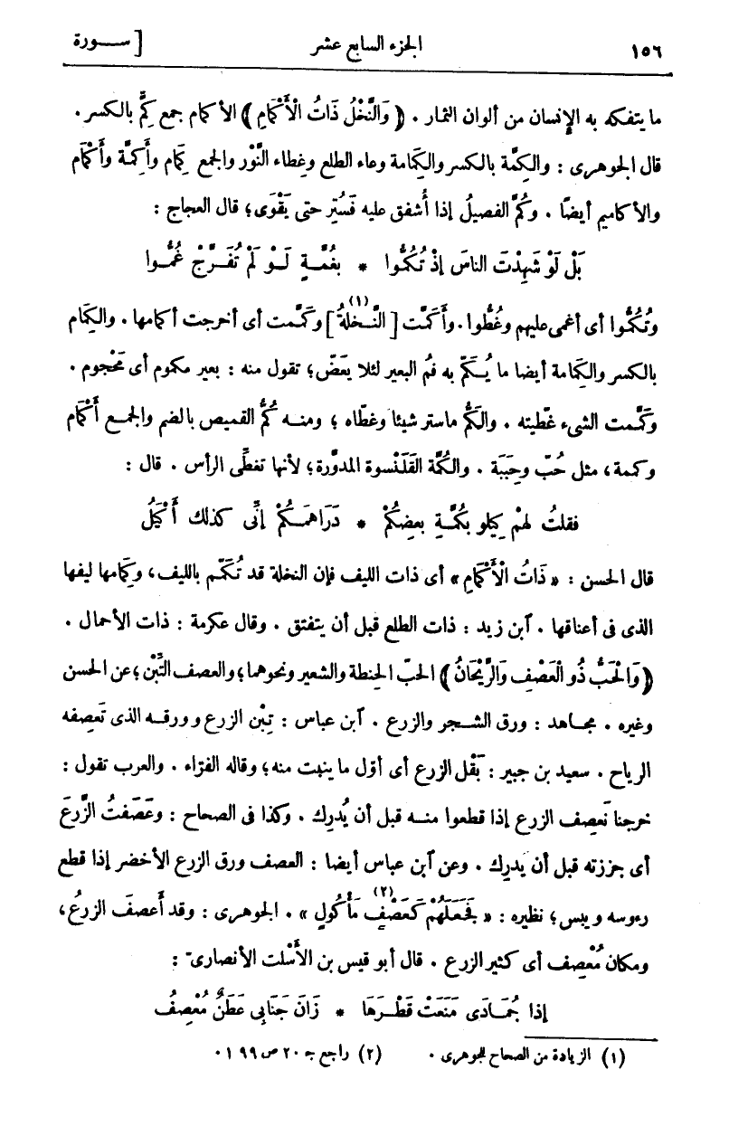 قَالَ الْحَسَنُ: (ذاتُ الْأَكْمامِ) أَيْ ذَاتُ اللِّيفِ فَإِنَّ النَّخْلَةَ قَدْ تُكَمَّمُ بِاللِّيفِ، وَكِمَامُهَا لِيفُهَا الَّذِي فِي أَعْنَاقِهَا. ابْنُ زَيْدٍ: ذَاتُ الطَّلْعِ قَبْلَ أَنْ يَتَفَتَّقَ. وَقَالَ عِكْرِمَةُ: ذَاتُ الْأَحْمَالِ. (وَالْحَبُّ ذُو الْعَصْفِ وَالرَّيْحانُ) الْحَبُّ الْحِنْطَةُ وَالشَّعِيرُ وَنَحْوُهُمَا، وَالْعَصْفُ التِّبْنُ، عَنِ الْحَسَنِ وَغَيْرِهِ. مُجَاهِدٌ: وَرَقُ الشَّجَرِ وَالزَّرْعِ. ابْنُ عَبَّاسٍ: تِبْنُ الزَّرْعِ وَوَرَقُهُ الَّذِي تَعْصِفُهُ الرِّيَاحُ. سَعِيدُ بْنُ جُبَيْرٍ: بَقْلُ الزَّرْعِ أَيْ أَوَّلُ مَا يَنْبُتُ مِنْهُ، وَقَالَهُ الْفَرَّاءُ. وَالْعَرَبُ تَقُولُ: خَرَجْنَا نَعْصِفُ الزَّرْعَ إِذَا قَطَعُوا مِنْهُ قَبْلَ أَنْ يُدْرِكَ. وَكَذَا فِي الصِّحَاحِ: وَعَصَفْتُ الزَّرْعَ أَيْ جَزَزْتُهُ قَبْلَ أَنْ يُدْرِكَ. وَعَنِ ابْنِ عَبَّاسٍ أَيْضًا: الْعَصْفُ وَرَقُ الزَّرْعِ الْأَخْضَرِ إِذَا قُطِعَ رُءُوسُهُ وَيَبِسَ، نَظِيرُهُ: (فَجَعَلَهُمْ كَعَصْفٍ «٢» مَأْكُولٍ). الْجَوْهَرِيُّ، وَقَدْ أَعْصَفَ الزَّرْعُ، وَمَكَانٌ مُعْصِفٌ أَيْ كَثِيرُ الزَّرْعِ. قَالَ أَبُو قَيْسِ بْنُ الْأَسْلَتِ الْأَنْصَارِيُّ: