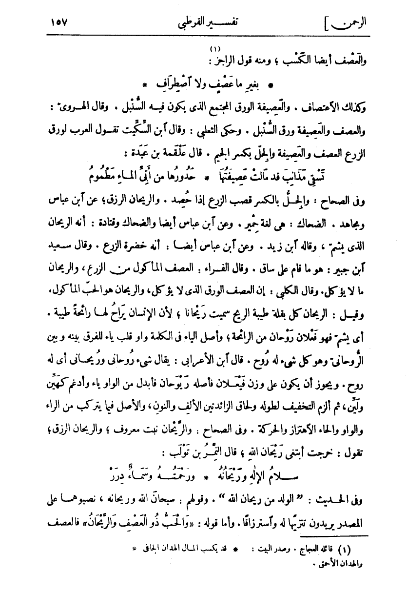 وَفِي الصِّحَاحِ: وَالْجِلُّ بِالْكَسْرِ قَصَبُ الزَّرْعِ إِذَا حُصِدَ. وَالرَّيْحَانُ الرِّزْقُ، عَنِ ابْنِ عَبَّاسٍ وَمُجَاهِدٍ. الضَّحَّاكُ: هِيَ لُغَةُ حِمْيَرَ. وَعَنِ ابْنِ عَبَّاسٍ أَيْضًا وَالضَّحَّاكِ وَقَتَادَةَ: أَنَّهُ الرَّيْحَانُ الَّذِي يُشَمُّ، وَقَالَهُ ابْنُ زَيْدٍ. وَعَنِ ابْنِ عَبَّاسٍ أَيْضًا: أَنَّهُ خُضْرَةُ الزرع. وقال سعيد ابن جُبَيْرٍ: هُوَ مَا قَامَ عَلَى سَاقٍ. وَقَالَ الْفَرَّاءُ: الْعَصْفُ الْمَأْكُولُ مِنَ الزَّرْعِ، وَالرَّيْحَانُ مَا لَا يُؤْكَلُ. وَقَالَ الْكَلْبِيُّ: إِنَّ الْعَصْفَ الْوَرَقُ الَّذِي لَا يُؤْكَلُ، وَالرَّيْحَانُ هُوَ الْحَبُّ الْمَأْكُولُ. وَقِيلَ: الرَّيْحَانُ كُلُّ بَقْلَةٍ طَيِّبَةِ الرِّيحِ سُمِّيَتْ رَيْحَانًا، لِأَنَّ الْإِنْسَانَ يَرَاحُ لَهَا رَائِحَةً طَيِّبَةً. أَيْ يَشُمُّ فَهُوَ فَعْلَانُ رَوْحَانُ مِنَ الرَّائِحَةِ، وَأَصْلُ الْيَاءِ فِي الْكَلِمَةِ وَاوٌ قُلِبَ يَاءً للفرق بينه وبين الروحاني وهو كل شي له روح. قال ابن الاعرابي: يقال شي رُوحَانِيٌّ وَرَيْحَانِيٌّ أَيْ لَهُ رُوحٌ. وَيَجُوزُ أَنْ يَكُونَ عَلَى وَزْنِ فَيْعَلَانِ فَأَصْلُهُ رَيْوَحَانُ فَأُبْدِلَ مِنَ الْوَاوِ يَاءً وَأُدْغِمَ كَهَيِّنٍ وَلَيِّنٍ، ثُمَّ أُلْزِمَ التَّخْفِيفُ لِطُولِهِ وَلِحَاقِ الزَّائِدَتَيْنِ الْأَلِفِ وَالنُّونِ، وَالْأَصْلُ فِيمَا يَتَرَكَّبُ مِنَ الرَّاءِ وَالْوَاوِ وَالْحَاءِ الِاهْتِزَازُ وَالْحَرَكَةُ. وَفِي الصِّحَاحِ: وَالرَّيْحَانُ نَبْتٌ مَعْرُوفٌ، وَالرَّيْحَانُ الرِّزْقُ، تَقُولُ: خَرَجْتُ أَبْتَغِي رَيْحَانَ اللَّهِ، قال النمر بن تولب:
