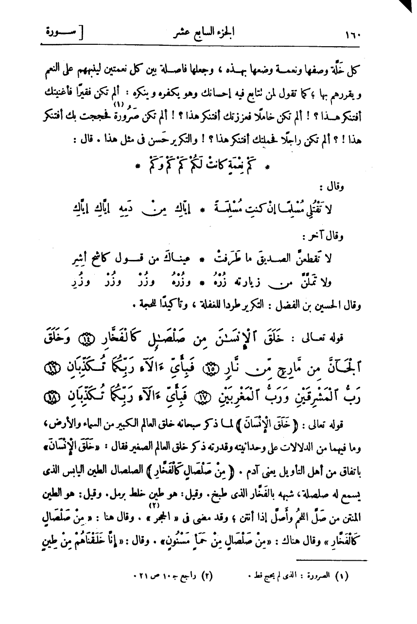 خَلَقَ الْإِنْسانَ مِنْ صَلْصالٍ كَالْفَخَّارِ (١٤) وَخَلَقَ الْجَانَّ مِنْ مارِجٍ مِنْ نارٍ (١٥) فَبِأَيِّ آلاءِ رَبِّكُما تُكَذِّبانِ (١٦) رَبُّ الْمَشْرِقَيْنِ وَرَبُّ الْمَغْرِبَيْنِ (١٧) فَبِأَيِّ آلاءِ رَبِّكُما تُكَذِّبانِ (١٨)