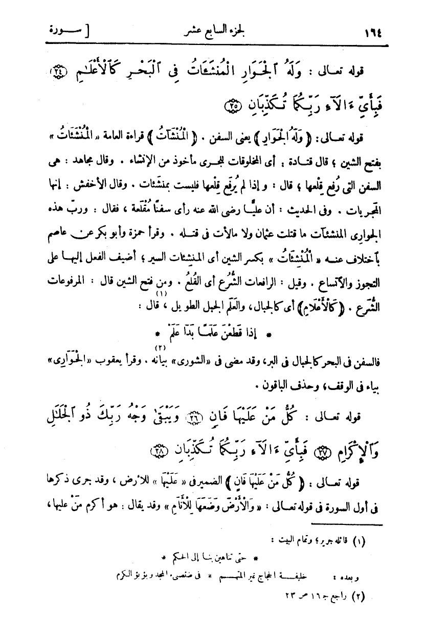 قَوْلُهُ تَعَالَى: (وَلَهُ الْجَوارِ) يعنى السفن. (الْمُنْشَآتُ) قِرَاءَةُ الْعَامَّةِ (الْمُنْشَآتُ) بِفَتْحِ الشِّينِ، قَالَ قَتَادَةُ: أَيِ الْمَخْلُوقَاتُ لِلْجَرْيِ مَأْخُوذٌ مِنَ الْإِنْشَاءِ. وَقَالَ مُجَاهِدٌ: هِيَ السُّفُنُ الَّتِي رُفِعَ قِلْعُهَا، قَالَ: وإذا لم يرفع قلعها فليست بمنشئات. وَقَالَ الْأَخْفَشُ: إِنَّهَا الْمُجْرَيَاتُ. وَفِي الْحَدِيثِ: أَنَّ عَلِيًّا رَضِيَ اللَّهُ عَنْهُ رَأَى سُفُنًا مُقْلَعَةً، فقال: ورب هذه الجواري المنشئات مَا قَتَلْتُ عُثْمَانَ وَلَا مَالَأْتُ فِي قَتْلِهِ. وَقَرَأَ حَمْزَةُ وَأَبُو بَكْرٍ عَنْ عَاصِمٍ بِاخْتِلَافٍ عنه (الْمُنْشَآتُ) بِكَسْرِ الشِّينِ أَيِ الْمُنْشِئَاتُ السَّيْرَ، أُضِيفَ الْفِعْلُ إِلَيْهَا عَلَى التَّجَوُّزِ وَالِاتِّسَاعِ. وَقِيلَ: الرَّافِعَاتُ الشُّرُعِ أَيِ الْقُلُعِ. وَمَنْ فَتَحَ الشِّينَ قَالَ: الْمَرْفُوعَاتُ الشُّرَعِ. (كَالْأَعْلامِ) أَيْ كَالْجِبَالِ، وَالْعَلَمُ الْجَبَلُ الطَّوِيلُ، قَالَ «١»:
