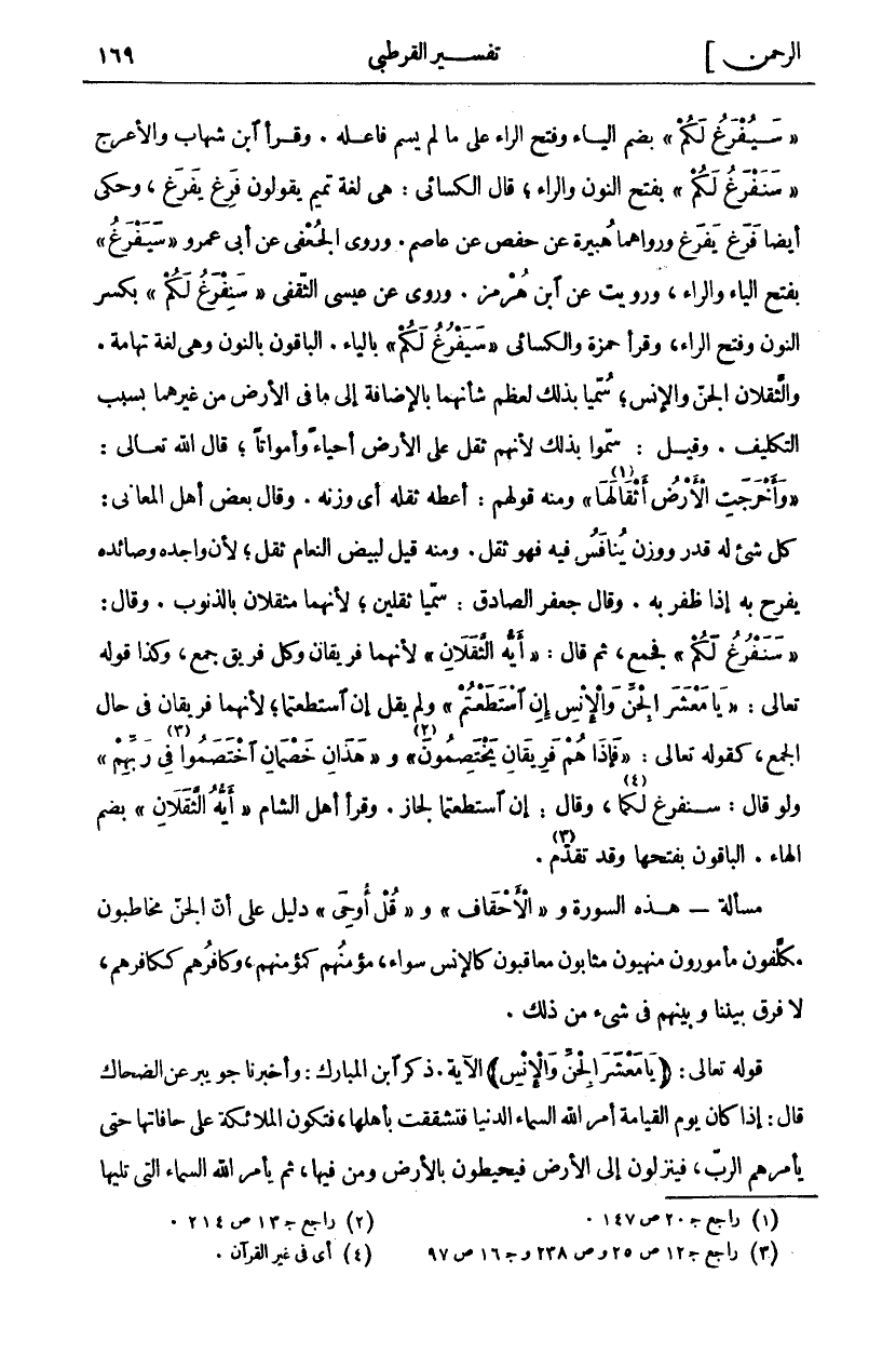 (سَيُفْرَغُ لَكُمْ) بِضَمِّ الْيَاءِ وَفَتْحِ الرَّاءِ عَلَى مَا لَمْ يُسَمَّ فَاعِلُهُ. وَقَرَأَ ابْنُ شِهَابٍ وَالْأَعْرَجُ (سَنَفْرَغُ لَكُمْ) بِفَتْحِ النُّونِ وَالرَّاءِ، قَالَ الْكِسَائِيُّ: هِيَ لُغَةُ تَمِيمٍ يَقُولُونَ فَرَغَ يَفْرَغُ، وَحَكَى أَيْضًا فَرَغَ يَفْرَغُ وَرَوَاهُمَا هُبَيْرَةُ عَنْ حَفْصٍ عَنْ عَاصِمٍ. وَرَوَى الْجُعْفِيُّ عَنْ أَبِي عَمْرٍو (سَيَفْرَغُ) بِفَتْحِ الْيَاءِ وَالرَّاءِ، وَرُوِيَتْ عَنِ ابْنِ هُرْمُزَ. وَرُوِيَ عَنْ عِيسَى الثَّقَفِيِّ (سَنِفْرَغُ لَكُمْ) بِكَسْرِ النُّونِ وَفَتْحِ الرَّاءِ، وَقَرَأَ حَمْزَةُ وَالْكِسَائِيُّ (سَيَفْرُغُ لَكُمْ) بِالْيَاءِ. الْبَاقُونَ بِالنُّونِ وَهِيَ لُغَةُ تِهَامَةَ. وَالثَّقَلَانِ الْجِنُّ وَالْإِنْسُ، سُمِّيَا بِذَلِكَ لِعِظَمِ شَأْنِهِمَا بِالْإِضَافَةِ إِلَى مَا فِي الْأَرْضِ مِنْ غَيْرِهِمَا بِسَبَبِ التَّكْلِيفِ. وَقِيلَ: سُمُّوا بِذَلِكَ لِأَنَّهُمْ ثِقْلٌ عَلَى الْأَرْضِ أَحْيَاءً وَأَمْوَاتًا، قَالَ اللَّهُ تَعَالَى: (وَأَخْرَجَتِ الْأَرْضُ أَثْقالَها) «١» وَمِنْهُ قَوْلُهُمْ: أَعْطِهِ ثِقْلَهُ أَيْ وَزْنَهَ. وَقَالَ بَعْضُ أَهْلِ المعاني: كل شي لَهُ قَدْرٌ وَوَزْنٌ يُنَافَسُ فِيهِ فَهُوَ ثِقْلٌ. وَمِنْهُ قِيلَ لِبَيْضِ النَّعَامِ ثِقْلٌ، لِأَنَّ وَاجِدَهُ وَصَائِدَهُ يَفْرَحُ بِهِ إِذَا ظَفِرَ بِهِ. وَقَالَ جَعْفَرٌ الصَّادِقُ: سُمِّيَا ثَقَلَيْنِ، لِأَنَّهُمَا مُثْقَلَانِ بِالذُّنُوبِ. وَقَالَ: (سَنَفْرُغُ لَكُمْ) فَجَمَعَ، ثُمَّ قَالَ: (أَيُّهَ الثَّقَلانِ) لِأَنَّهُمَا فَرِيقَانِ وَكُلُّ فَرِيقٍ جَمْعٌ، وَكَذَا قَوْلُهُ تَعَالَى: (يَا مَعْشَرَ الْجِنِّ وَالْإِنْسِ إِنِ اسْتَطَعْتُمْ) وَلَمْ يَقُلْ إِنِ اسْتَطَعْتُمَا، لِأَنَّهُمَا فَرِيقَانِ فِي حَالِ الْجَمْعِ، كَقَوْلِهِ تَعَالَى: (فَإِذا هُمْ فَرِيقانِ يَخْتَصِمُونَ) «٢» وَ (هذانِ خَصْمانِ اخْتَصَمُوا «٣» فِي رَبِّهِمْ) وَلَوْ قَالَ: سَنَفْرُغُ لَكُمَا «٤»، وَقَالَ: إِنِ اسْتَطَعْتُمَا لَجَازَ. وَقَرَأَ أَهْلُ الشَّامِ (أَيُّهُ الثَّقَلَانِ) بِضَمِّ الْهَاءِ. الْبَاقُونَ بِفَتْحِهَا وَقَدْ تَقَدَّمَ «٥». مَسْأَلَةٌ- هَذِهِ السُّورَةُ وَ (الْأَحْقَافُ) وَ (قُلْ أُوحِيَ) دَلِيلٌ عَلَى أَنَّ الْجِنَّ مُخَاطَبُونَ مُكَلَّفُونَ مَأْمُورُونَ مَنْهِيُّونَ مُثَابُونَ مُعَاقَبُونَ كَالْإِنْسِ سَوَاءٌ، مُؤْمِنُهِمْ كَمُؤْمِنِهِمْ، وَكَافِرُهِمْ كَكَافِرِهِمْ، لَا فَرْقَ بَيْنَنَا وَبَيْنَهُمْ فِي شي مِنْ ذَلِكَ. قَوْلُهُ تَعَالَى: (يَا مَعْشَرَ الْجِنِّ وَالْإِنْسِ) الْآيَةَ. ذَكَرَ ابْنُ الْمُبَارَكِ: وَأَخْبَرَنَا جُوَيْبِرٌ عَنِ الضَّحَّاكِ قَالَ: إِذَا كَانَ يَوْمُ الْقِيَامَةِ أَمَرَ اللَّهُ السَّمَاءَ الدُّنْيَا فَتَشَقَّقَتْ بِأَهْلِهَا، فَتَكُونُ الْمَلَائِكَةُ عَلَى حَافَّاتِهَا حَتَّى يَأْمُرَهُمُ الرَّبُّ، فَيَنْزِلُونَ إِلَى الْأَرْضِ فَيُحِيطُونَ بِالْأَرْضِ وَمَنْ فِيهَا، ثُمَّ يأمر الله السماء التي تليها