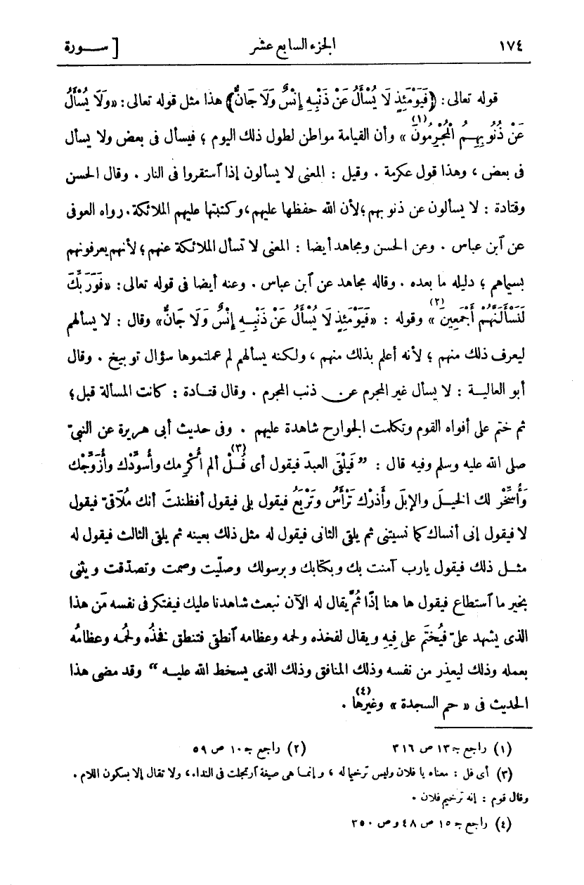 هذا مثل قوله تعالى: (وَلا يُسْئَلُ عَنْ ذُنُوبِهِمُ الْمُجْرِمُونَ) «١» وَأَنَّ الْقِيَامَةَ مَوَاطِنُ لِطُولِ ذَلِكَ الْيَوْمِ، فَيُسْأَلُ فِي بَعْضٍ وَلَا يُسْأَلُ فِي بَعْضٍ، وَهَذَا قَوْلُ عِكْرِمَةَ. وَقِيلَ: الْمَعْنَى لَا يُسْأَلُونَ إِذَا اسْتَقَرُّوا فِي النَّارِ. وَقَالَ الْحَسَنُ وَقَتَادَةُ: لَا يُسْأَلُونَ عَنْ ذُنُوبِهِمْ، لِأَنَّ اللَّهَ حَفِظَهَا عَلَيْهِمْ، وَكَتَبَتْهَا عَلَيْهِمُ الْمَلَائِكَةُ. رَوَاهُ الْعَوْفِيُّ عَنِ ابْنِ عَبَّاسٍ. وَعَنِ الْحَسَنِ وَمُجَاهِدٍ أَيْضًا: الْمَعْنَى لَا تَسْأَلُ الْمَلَائِكَةُ عَنْهُمْ، لِأَنَّهُمْ يَعْرِفُونَهُمْ بِسِيمَاهُمْ، دَلِيلُهُ مَا بَعْدَهُ. وَقَالَهُ مُجَاهِدٌ عَنِ ابْنِ عَبَّاسٍ. وَعَنْهُ أَيْضًا فِي قَوْلِهِ تعالى: (فَوَ رَبِّكَ لَنَسْئَلَنَّهُمْ أَجْمَعِينَ) «٢» وقوله: (فَيَوْمَئِذٍ لا يُسْئَلُ عَنْ ذَنْبِهِ إِنْسٌ وَلا جَانٌّ) وَقَالَ: لَا يَسْأَلُهُمْ لِيَعْرِفَ ذَلِكَ مِنْهُمْ، لِأَنَّهُ أَعْلَمُ بِذَلِكَ مِنْهُمْ، وَلَكِنَّهُ يَسْأَلُهُمْ لِمَ عَمِلْتُمُوهَا سُؤَالَ تَوْبِيخٍ. وَقَالَ أَبُو الْعَالِيَةِ: لَا يُسْأَلُ غَيْرُ الْمُجْرِمِ عَنْ ذَنْبِ الْمُجْرِمِ. وَقَالَ قَتَادَةُ: كَانَتِ الْمَسْأَلَةُ قَبْلُ، ثُمَّ خُتِمَ عَلَى أَفْوَاهِ الْقَوْمِ وَتَكَلَّمَتِ الْجَوَارِحُ شَاهِدَةً عَلَيْهِمْ. وَفِي حَدِيثُ أَبِي هُرَيْرَةَ عَنِ النَّبِيِّ صَلَّى اللَّهُ عَلَيْهِ وَسَلَّمَ وَفِيهِ قَالَ: (فَيَلْقَى الْعَبْدَ فَيَقُولُ أَيْ فُلْ «٣» أَلَمْ أُكْرِمْكَ وَأُسَوِّدْكَ وَأُزَوِّجْكَ وَأُسَخِّرْ لَكَ الْخَيْلَ وَالْإِبِلَ وَأَذَرْكَ تَرْأَسُ وَتَرْبَعُ فَيَقُولُ بَلَى فَيَقُولُ أَفَظَنَنْتَ أَنَّكَ مُلَاقِيَّ فَيَقُولُ لَا فَيَقُولُ إِنِّي أَنْسَاكَ كَمَا نَسِيتَنِي ثُمَّ يَلْقَى الثَّانِي فَيَقُولُ لَهُ مِثْلَ ذَلِكَ بِعَيْنِهِ ثُمَّ يَلْقَى الثَّالِثَ فَيَقُولُ لَهُ مِثْلَ ذَلِكَ فَيَقُولُ يَا رَبِّ آمَنْتُ بِكَ وَبِكِتَابِكَ وَبِرَسُولِكَ وَصَلَّيْتُ وَصُمْتُ وَتَصَدَّقْتُ وَيُثْنِي بخير ما استطاع فيقول ها هنا إِذًا ثُمَّ يُقَالُ لَهُ الْآنَ نَبْعَثُ شَاهِدَنَا عَلَيْكَ فيتفكر فِي نَفْسِهِ مَنْ هَذَا الَّذِي يَشْهَدُ عَلَيَّ فَيُخْتَمُ عَلَى فِيهِ وَيُقَالُ لِفَخِذِهِ وَلَحْمِهِ وَعِظَامِهِ انْطِقِي فَتَنْطِقُ فَخِذُهُ وَلَحْمُهُ وَعِظَامُهُ بِعَمَلِهِ وَذَلِكَ لِيُعْذَرَ مِنْ نَفْسِهِ وَذَلِكَ الْمُنَافِقُ وَذَلِكَ الَّذِي يَسْخَطُ اللَّهُ عَلَيْهِ) وَقَدْ مَضَى هَذَا الْحَدِيثُ في (حم السجدة) وغيرها».