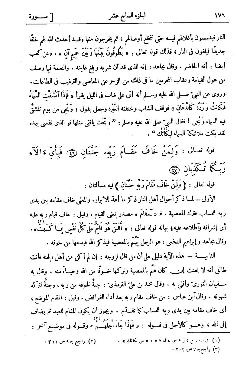 قَوْلُهُ تَعَالَى: (وَلِمَنْ خافَ مَقامَ رَبِّهِ جَنَّتانِ) فِيهِ مَسْأَلَتَانِ: الْأُولَى- لَمَّا ذَكَرَ أَحْوَالَ أَهْلِ النَّارِ ذَكَرَ مَا أَعَدَّ لِلْأَبْرَارِ. وَالْمَعْنَى خَافَ مَقَامَهُ بَيْنَ يَدَيْ رَبِّهِ لِلْحِسَابِ فَتَرَكَ الْمَعْصِيَةَ. فَ (مَقامَ) مَصْدَرٌ بِمَعْنَى الْقِيَامِ. وَقِيلَ: خَافَ قِيَامَ رَبِّهِ عَلَيْهِ أَيْ إِشْرَافَهُ وَاطِّلَاعَهُ عَلَيْهِ، بَيَانُهُ قَوْلُهُ تَعَالَى: (أَفَمَنْ هُوَ قائِمٌ عَلى كُلِّ نَفْسٍ بِما كَسَبَتْ) «٢». وَقَالَ مُجَاهِدٌ وَإِبْرَاهِيمُ النَّخَعِيُّ: هُوَ الرَّجُلُ يَهُمُّ بِالْمَعْصِيَةِ فَيَذْكُرُ اللَّهَ فَيَدَعُهَا مِنْ خَوْفِهِ. الثَّانِيَةُ- هَذِهِ الْآيَةُ دَلِيلٌ عَلَى أَنَّ مَنْ قَالَ لِزَوْجِهِ: إِنْ لَمْ أَكُنْ مِنْ أَهْلِ الْجَنَّةِ فَأَنْتِ طَالِقٌ أَنَّهُ لَا يَحْنَثُ إِنْ كَانَ هَمَّ بِالْمَعْصِيَةِ وَتَرَكَهَا خَوْفًا مِنَ اللَّهِ وَحَيَاءً مِنْهُ. وَقَالَ بِهِ سُفْيَانُ الثَّوْرِيُّ وَأَفْتَى بِهِ. وَقَالَ مُحَمَّدُ بْنُ عَلِيٍّ التِّرْمِذِيُّ: جَنَّةٌ لِخَوْفِهِ مِنْ رَبِّهِ، وَجَنَّةٌ لِتَرْكِهِ شَهْوَتِهِ. وَقَالَ ابْنُ عَبَّاسٍ: مَنْ خَافَ مَقَامَ رَبِّهِ بَعْدَ أَدَاءِ الْفَرَائِضِ. وَقِيلَ: الْمَقَامُ الْمَوْضِعُ، أَيْ خَافَ مَقَامَهُ بَيْنَ يَدَيْ رَبِّهِ لِلْحِسَابِ كَمَا تَقَدَّمَ. وَيَجُوزُ أَنْ يَكُونَ الْمَقَامُ لِلْعَبْدِ ثُمَّ يُضَافُ إِلَى اللَّهِ، وَهُوَ كَالْأَجَلِ فِي قَوْلِهِ: (فَإِذا جاءَ أَجَلُهُمْ) «٣» وَقَوْلِهِ فِي موضع آخر: