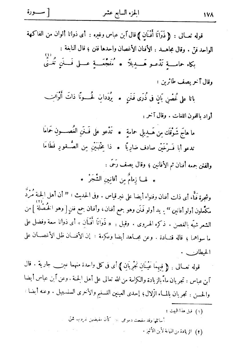 وَشَجَرَةٌ فَنَّاءُ أَيْ ذَاتُ أَفْنَانٍ وَفَنْوَاءُ أَيْضًا عَلَى غَيْرِ قِيَاسٍ. وَفِي الْحَدِيثِ: (إِنَّ أَهْلَ الْجَنَّةِ مُرْدٌ مُكَحَّلُونَ أُولُو أَفَانِينَ) يُرِيدُ أُولُو فَنَنٍ وَهُوَ جَمْعُ أَفْنَانٍ، وَأَفْنَانٌ جَمْعُ فَنَنٍ [وَهُوَ الْخُصْلَةُ «٢»] مِنَ الشَّعْرِ شُبِّهَ بِالْغُصْنِ. ذَكَرَهُ الْهَرَوِيُّ. وَقِيلَ: (ذَواتا أَفْنانٍ) أَيْ ذَوَاتَا سَعَةٍ وَفَضْلٍ عَلَى مَا سِوَاهُمَا، قَالَهُ قَتَادَةُ. وَعَنْ مُجَاهِدٍ أَيْضًا وَعِكْرِمَةَ: إِنَّ الْأَفْنَانَ ظِلُّ الْأَغْصَانِ عَلَى الْحِيطَانِ. قَوْلُهُ تَعَالَى: (فِيهِما عَيْنانِ تَجْرِيانِ) أَيْ فِي كُلِّ وَاحِدَةٍ مِنْهُمَا عَيْنٌ جَارِيَةٌ. قَالَ ابْنُ عَبَّاسٍ: تَجْرِيَانِ مَاءً بِالزِّيَادَةِ وَالْكَرَامَةِ مِنَ اللَّهِ تَعَالَى عَلَى أَهْلِ الْجَنَّةِ. وَعَنِ ابْنِ عَبَّاسٍ أَيْضًا وَالْحَسَنِ: تَجْرِيَانِ بِالْمَاءِ الزُّلَالِ، إِحْدَى الْعَيْنَيْنِ التَّسْنِيمُ وَالْأُخْرَى السَّلْسَبِيلُ. وَعَنْهُ أيضا: