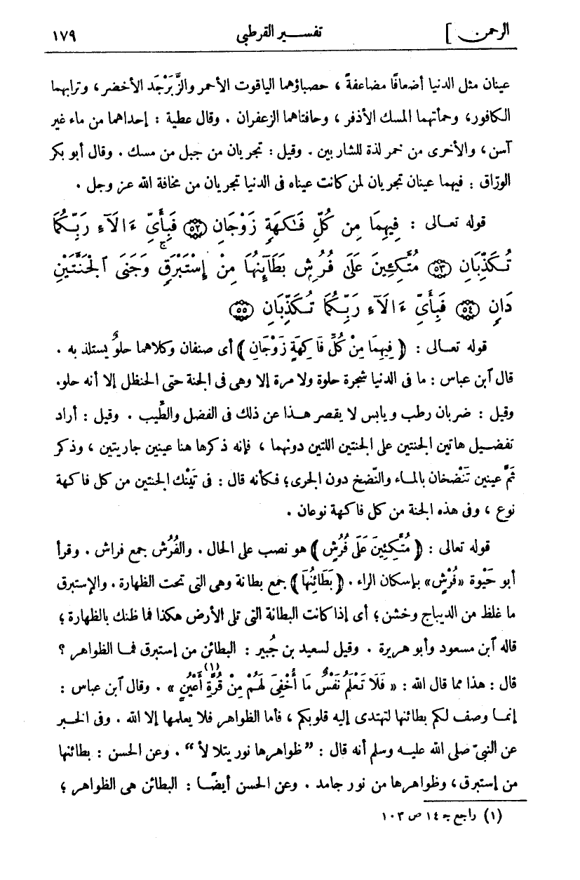 قَوْلُهُ تَعَالَى: (فِيهِما مِنْ كُلِّ فاكِهَةٍ زَوْجانِ) أَيْ صِنْفَانِ وَكِلَاهُمَا حُلْوٌ يُسْتَلَذُّ بِهِ. قَالَ ابْنُ عَبَّاسٍ: مَا فِي الدُّنْيَا شَجَرَةٌ حُلْوَةٌ وَلَا مُرَّةٌ إِلَّا وَهِيَ فِي الْجَنَّةِ حَتَّى الْحَنْظَلُ إِلَّا أَنَّهُ حُلْوٌ. وَقِيلَ: ضَرْبَانِ رَطْبٌ وَيَابِسٌ لَا يَقْصُرُ هَذَا عَنْ ذَلِكَ فِي الْفَضْلِ وَالطِّيبِ. وَقِيلَ: أَرَادَ تَفْضِيلَ هَاتَيْنِ الجنتين على الجنتين اللتين دونهما، فإنه ذكر هاهنا عَيْنَيْنِ جَارِيَتَيْنِ، وَذَكَرَ ثَمَّ عَيْنَيْنِ تَنْضَخَانِ بِالْمَاءِ والنضخ دُونَ الْجَرْيِ، فَكَأَنَّهُ قَالَ: فِي تَيْنِكَ الْجَنَّتَيْنِ مِنْ كُلِّ فَاكِهَةٍ نَوْعٌ، وَفِي هَذِهِ الْجَنَّةِ مِنْ كُلِّ فَاكِهَةٍ نَوْعَانِ. قَوْلُهُ تَعَالَى: (مُتَّكِئِينَ عَلى فُرُشٍ) هُوَ نَصْبٌ عَلَى الْحَالِ. وَالْفُرُشُ جَمْعُ فِرَاشٍ. وَقَرَأَ أَبُو حَيْوَةَ (فُرْشٍ) بِإِسْكَانِ الراء. (بَطائِنُها) جَمْعُ بِطَانَةٍ وَهِيَ الَّتِي تَحْتَ الظِّهَارَةِ. وَالْإِسْتَبْرَقُ مَا غَلُظَ مِنَ الدِّيبَاجِ وَخَشُنَ، أَيْ إِذَا كَانَتِ الْبِطَانَةُ الَّتِي تَلِي الْأَرْضَ هَكَذَا فَمَا ظَنُّكَ بِالظِّهَارَةِ، قَالَهُ ابْنُ مَسْعُودٍ وَأَبُو هُرَيْرَةَ. وَقِيلَ لِسَعِيدِ بْنِ جُبَيْرٍ: الْبَطَائِنُ مِنْ إِسْتَبْرَقٍ فَمَا الظَّوَاهِرُ؟ قَالَ: هَذَا مِمَّا قَالَ اللَّهُ: (فَلا تَعْلَمُ نَفْسٌ مَا أُخْفِيَ لَهُمْ مِنْ قُرَّةِ «١» أَعْيُنٍ). وَقَالَ ابْنُ عَبَّاسٍ: إِنَّمَا وَصَفَ لَكُمْ بَطَائِنَهَا لِتَهْتَدِيَ إِلَيْهِ قُلُوبُكُمْ، فَأَمَّا الظَّوَاهِرُ فَلَا يَعْلَمُهَا إِلَّا اللَّهُ. وَفِي الْخَبَرَ عَنِ النَّبِيِّ صَلَّى اللَّهُ عَلَيْهِ وَسَلَّمَ أَنَّهُ قَالَ: (ظَوَاهِرُهَا نُورٌ يَتَلَأْلَأُ). وَعَنِ الْحَسَنِ: بَطَائِنُهَا مِنْ إِسْتَبْرَقٍ، وَظَوَاهِرُهَا مِنْ نُورٍ جَامِدٍ. وَعَنِ الْحَسَنِ أيضا: البطائن هي الظواهر،