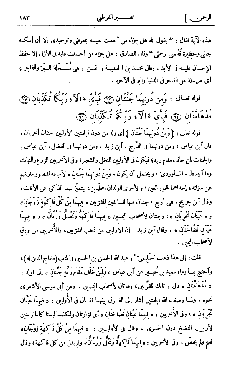 . وَقَالَ ابْنُ زَيْدٍ: إِنَّ الْأُولَيَيْنِ مِنْ ذَهَبٍ لِلْمُقَرَّبِينَ، وَالْأُخْرَيَيْنِ مِنْ وَرِقٍ لِأَصْحَابِ الْيَمِينِ. قُلْتُ: إِلَى هَذَا ذَهَبَ الْحَلِيمِيُّ أَبُو عَبْدِ اللَّهِ الْحَسَنُ بْنُ الْحُسَيْنِ فِي كِتَابِ (مِنْهَاجِ الدِّينِ لَهُ)، وَاحْتَجَّ بِمَا رَوَاهُ سَعِيدُ بْنُ جُبَيْرٍ عَنِ ابْنِ عَبَّاسٍ (وَلِمَنْ خافَ مَقامَ رَبِّهِ جَنَّتانِ) إِلَى قَوْلِهِ: (مُدْهامَّتانِ) قَالَ: تَانِكَ لِلْمُقَرَّبِينَ، وَهَاتَانِ لِأَصْحَابِ الْيَمِينِ. وَعَنْ أَبِي مُوسَى الْأَشْعَرِيِّ نَحْوُهُ. وَلَمَّا وَصَفَ اللَّهُ الْجَنَّتَيْنِ أَشَارَ إِلَى الْفَرْقِ بَيْنَهُمَا فَقَالَ فِي الْأُولَيَيْنِ: (فِيهِما عَيْنانِ تَجْرِيانِ)، وفي الأخريين: ِيهِما عَيْنانِ نَضَّاخَتانِ)