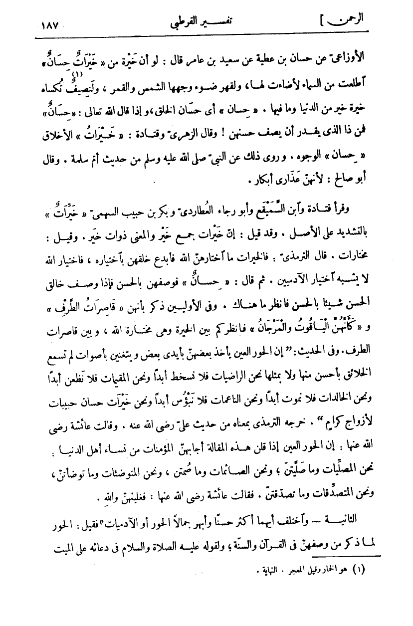 الْأَوْزَاعِيُّ عَنْ حَسَّانَ بْنِ عَطِيَّةَ عَنْ سَعِيدِ بْنِ عَامِرٍ قَالَ: لَوْ أَنَّ خَيْرَةً مِنْ (خَيْراتٌ حِسانٌ) اطَّلَعَتْ مِنَ السَّمَاءِ لَأَضَاءَتْ لَهَا، وَلَقَهَرَ ضَوْءُ وَجْهِهَا الشَّمْسَ وَالْقَمَرَ، وَلَنَصِيفٌ «١» تُكْسَاهُ خَيْرَةٌ خَيْرٌ مِنَ الدُّنْيَا وَمَا فِيهَا. (حِسانٌ) أَيْ حِسَانُ الْخَلْقِ، وَإِذَا قَالَ اللَّهُ تَعَالَى: (حِسانٌ) فَمَنْ ذَا الَّذِي يَقْدِرُ أَنْ يَصِفَ حُسْنَهُنَّ! وَقَالَ الزُّهْرِيُّ وَقَتَادَةُ: (خَيْراتٌ) الْأَخْلَاقِ (حِسانٌ) الْوُجُوهِ. وَرُوِيَ ذَلِكَ عَنِ النَّبِيِّ صَلَّى اللَّهُ عَلَيْهِ وَسَلَّمَ مِنْ حَدِيثِ أُمِّ سَلَمَةَ. وَقَالَ أَبُو صَالِحٍ: لِأَنَّهُنَّ عَذَارَى أَبْكَارٌ. وَقَرَأَ قَتَادَةُ وابن السميقع وَأَبُو رَجَاءٍ الْعُطَارِدِيُّ وَبَكْرُ بْنُ حَبِيبٍ السَّهْمِيُّ (خَيِّرَاتٌ) بِالتَّشْدِيدِ عَلَى الْأَصْلِ. وَقَدْ قِيلَ: إِنَّ خَيْرَاتٍ جَمْعُ خَيْرٍ وَالْمَعْنَى ذَوَاتُ خَيْرٍ. وَقِيلَ: مُخْتَارَاتٌ. قَالَ التِّرْمِذِيُّ: فَالْخَيْرَاتُ مَا اخْتَارَهُنَّ اللَّهُ فَأَبْدَعَ خَلْقَهُنَّ بِاخْتِيَارِهِ، فَاخْتِيَارُ اللَّهِ لَا يُشْبِهُ اخْتِيَارَ الْآدَمِيِّينَ. ثُمَّ قَالَ: (حِسانٌ) فَوَصَفَهُنَّ بِالْحُسْنِ فَإِذَا وَصَفَ خَالِقُ الْحُسْنِ شَيْئًا بِالْحُسْنِ فَانْظُرْ مَا هُنَاكَ. وَفِي الْأُولَيَيْنِ ذَكَرَ بِأَنَّهُنَّ (قاصِراتُ الطَّرْفِ) وَ (كَأَنَّهُنَّ الْياقُوتُ وَالْمَرْجانُ) فَانْظُرْ كَمْ بَيْنَ الْخَيْرَةِ وَهِيَ مُخْتَارَةُ اللَّهِ، وَبَيْنَ قَاصِرَاتِ الطَّرْفِ. وَفِي الْحَدِيثِ: (إِنَّ الْحُورَ الْعِينَ يَأْخُذُ بَعْضُهُنَّ بِأَيْدِي بَعْضٍ وَيَتَغَنَّيْنَ بِأَصْوَاتٍ لَمْ تَسْمَعِ الْخَلَائِقُ بِأَحْسَنَ مِنْهَا وَلَا بِمِثْلِهَا نَحْنُ الرَّاضِيَاتِ فَلَا نَسْخَطُ أَبَدًا وَنَحْنُ الْمُقِيمَاتُ فَلَا نَظْعَنُ أَبَدًا وَنَحْنُ الْخَالِدَاتُ فَلَا نَمُوتُ أَبَدًا وَنَحْنُ النَّاعِمَاتُ فَلَا نَبْؤُسُ أَبَدًا وَنَحْنُ خَيْرَاتٌ حِسَانٌ حَبِيبَاتٌ لِأَزْوَاجٍ كِرَامٍ (. خَرَّجَهُ التِّرْمِذِيُّ بِمَعْنَاهُ مِنْ حَدِيثِ عَلِيٍّ رَضِيَ اللَّهُ عَنْهُ. وَقَالَتْ عَائِشَةُ رَضِيَ اللَّهُ عَنْهَا: إِنَّ الْحُورَ الْعِينَ إِذَا قُلْنَ هَذِهِ الْمَقَالَةَ أَجَابَهُنَّ الْمُؤْمِنَاتُ مِنْ نِسَاءِ أَهْلِ الدُّنْيَا: نَحْنُ الْمُصَلِّيَاتُ وَمَا صَلَّيْتُنَّ، وَنَحْنُ الصائمات وما صمتن، ونحن المتوضيات وَمَا تَوَضَّأْتُنَّ، وَنَحْنُ الْمُتَصَدِّقَاتُ وَمَا تَصَدَّقْتُنَّ. فَقَالَتْ عَائِشَةُ رَضِيَ اللَّهُ، عَنْهَا: فَغَلَبْنَهُنَّ وَاللَّهِ. الثَّانِيَةُ- وَاخْتُلِفَ أَيُّهُمَا أَكْثَرُ حُسْنًا وَأَبْهَرُ جَمَالًا الْحُورُ أَوِ الْآدَمِيَّاتُ؟ فَقِيلَ: الْحُورُ لِمَا ذُكِرَ مِنْ وَصْفِهِنَّ فِي الْقُرْآنِ وَالسُّنَّةِ، وَلِقَوْلِهِ عَلَيْهِ الصَّلَاةُ والسلام في دعائه على الميت