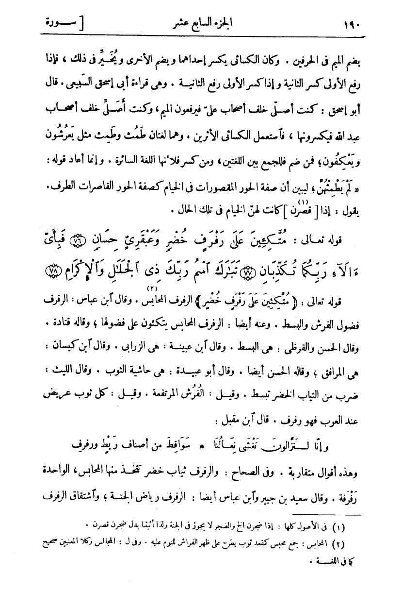 مُتَّكِئِينَ عَلى رَفْرَفٍ خُضْرٍ وَعَبْقَرِيٍّ حِسانٍ (٧٦) فَبِأَيِّ آلاءِ رَبِّكُما تُكَذِّبانِ (٧٧) تَبارَكَ اسْمُ رَبِّكَ ذِي الْجَلالِ وَالْإِكْرامِ (٧٨)