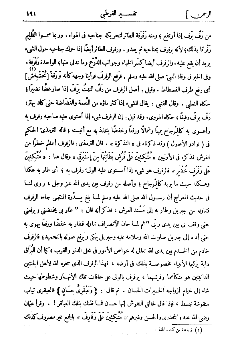 مِنْ رَفَّ يَرِفُّ إِذَا ارْتَفَعَ، وَمِنْهُ رَفْرَفَةُ الطَّائِرِ لِتَحْرِيكِهِ جَنَاحَيْهِ فِي الْهَوَاءِ. وَرُبَّمَا سَمَّوُا الظَّلِيمَ رَفْرَافًا بِذَلِكَ، لِأَنَّهُ يُرَفْرِفُ بِجَنَاحَيْهِ ثُمَّ يَعْدُو. وَرَفْرَفَ الطَّائِرُ أَيْضًا إِذَا حَرَّكَ جَنَاحَيْهِ حَوْلَ الشَّيْءِ يُرِيدُ أَنْ يَقَعَ عَلَيْهِ. وَالرَّفْرَفُ أَيْضًا كِسْرُ الْخِبَاءِ وَجَوَانِبُ الدِّرْعِ وَمَا تَدَلَّى منها، الواحدة رَفْرَفَةٌ. وَفِي الْخَبَرِ فِي وَفَاةِ النَّبِيِّ صَلَّى اللَّهُ عَلَيْهِ وَسَلَّمَ: فَرَفَعَ الرَّفْرَفَ فَرَأَيْنَا وَجْهَهُ كَأَنَّهُ وَرَقَةٌ [تُخَشْخِشُ «١»] أَيْ رَفَعَ طَرْفَ الْفُسْطَاطِ. وَقِيلَ: أَصْلُ الرَّفْرَفِ مِنْ رَفَّ النَّبْتُ يَرِفُّ إذا صار غضا نَضِيرًا، حَكَاهُ الثَّعْلَبِيُّ. وَقَالَ الْقُتَبِيُّ: يُقَالُ لِلشَّيْءِ إِذَا كَثُرَ مَاؤُهُ مِنَ النِّعْمَةِ وَالْغَضَاضَةِ حَتَّى كَادَ يَهْتَزُّ: رَفَّ يَرِفُّ رَفِيفًا، حَكَاهُ الْهَرَوِيُّ. وقد قيل: إن الرفرف شي إِذَا اسْتَوَى عَلَيْهِ صَاحِبُهُ رَفْرَفَ بِهِ وَأَهْوَى بِهِ كَالْمِرْجَاحِ يَمِينًا وَشِمَالًا وَرَفْعًا وَخَفْضًا يَتَلَذَّذُ بِهِ مَعَ أَنِيسَتِهِ، قَالَهُ التِّرْمِذِيُّ الْحَكِيمُ فِي (نَوَادِرِ الْأُصُولِ) وَقَدْ ذَكَرْنَاهُ فِي (التَّذْكِرَةِ). قَالَ التِّرْمِذِيُّ: فَالرَّفْرَفُ أَعْظَمُ خَطَرًا مِنَ الْفُرُشِ فَذَكَرَهُ فِي الْأُولَيَيْنِ (مُتَّكِئِينَ عَلى فُرُشٍ بَطائِنُها مِنْ إِسْتَبْرَقٍ) وَقَالَ هُنَا: (مُتَّكِئِينَ عَلى رَفْرَفٍ خُضْرٍ) فالرفرف هو شي إِذَا اسْتَوَى عَلَيْهِ الْوَلِيُّ رَفْرَفَ بِهِ، أَيْ طَارَ بِهِ هَكَذَا وَهَكَذَا حَيْثُ مَا يُرِيدُ كَالْمِرْجَاحِ، وَأَصْلُهُ مِنْ رَفْرَفٍ بَيْنَ يَدَيِ اللَّهِ عَزَّ وَجَلَّ، رُوِيَ لَنَا فِي حَدِيثِ الْمِعْرَاجِ أن رسول الله صَلَّى اللَّهُ عَلَيْهِ وَسَلَّمَ لَمَّا بَلَغَ سِدْرَةَ الْمُنْتَهَى جَاءَهُ الرَّفْرَفُ فَتَنَاوَلَهُ مِنْ جِبْرِيلَ وَطَارَ بِهِ إِلَى مَسْنَدِ الْعَرْشِ، فَذَكَرَ أَنَّهُ قَالَ: (طَارَ بِي يَخْفِضُنِي وَيَرْفَعُنِي حَتَّى وَقَفَ بِي بَيْنَ يَدَيْ رَبِّي) ثُمَّ لَمَّا حَانَ الِانْصِرَافُ تَنَاوَلَهُ فَطَارَ بِهِ خَفْضًا وَرَفْعًا يَهْوِي بِهِ حَتَّى أَدَّاهُ إِلَى جِبْرِيلَ صَلَوَاتُ اللَّهِ وَسَلَامُهُ عَلَيْهِ وَجِبْرِيلُ يَبْكِي وَيَرْفَعُ صَوْتَهُ بِالتَّحْمِيدِ، فَالرَّفْرَفُ خَادِمٌ مِنَ الْخَدَمِ بَيْنَ يَدَيِ اللَّهِ تَعَالَى لَهُ خَوَاصُّ الْأُمُورِ فِي مَحَلِّ الدُّنُوِّ وَالْقُرْبِ، كَمَا أَنَّ الْبُرَاقَ دَابَّةٌ يَرْكَبُهَا الْأَنْبِيَاءُ مَخْصُوصَةٌ بِذَلِكَ فِي أَرْضِهِ، فَهَذَا الرَّفْرَفُ الَّذِي سَخَّرَهُ اللَّهُ لِأَهْلِ الْجَنَّتَيْنِ الدَّانِيَتَيْنِ هو متكأهما وَفُرُشُهُمَا، يُرَفْرِفُ بِالْوَلِيِّ عَلَى حَافَّاتِ تِلْكَ الْأَنْهَارِ وَشُطُوطِهَا حَيْثُ شَاءَ إِلَى خِيَامِ أَزْوَاجِهِ الْخَيْرَاتِ الْحِسَانِ. ثُمَّ قَالَ: (وَعَبْقَرِيٍّ حِسانٍ) فَالْعَبْقَرِيُّ ثِيَابٌ مَنْقُوشَةٌ تُبْسَطُ، فَإِذَا قَالَ خَالِقُ النُّقُوشِ إِنَّهَا حِسَانٌ فَمَا ظَنُّكَ بِتِلْكَ الْعَبَاقِرِ!. وَقَرَأَ عُثْمَانُ رَضِيَ اللَّهُ عَنْهُ وَالْجَحْدَرِيُّ وَالْحَسَنُ وَغَيْرُهُمْ (مُتَّكِئِينَ على رفارف) بالجمع غير مصروف كذلك