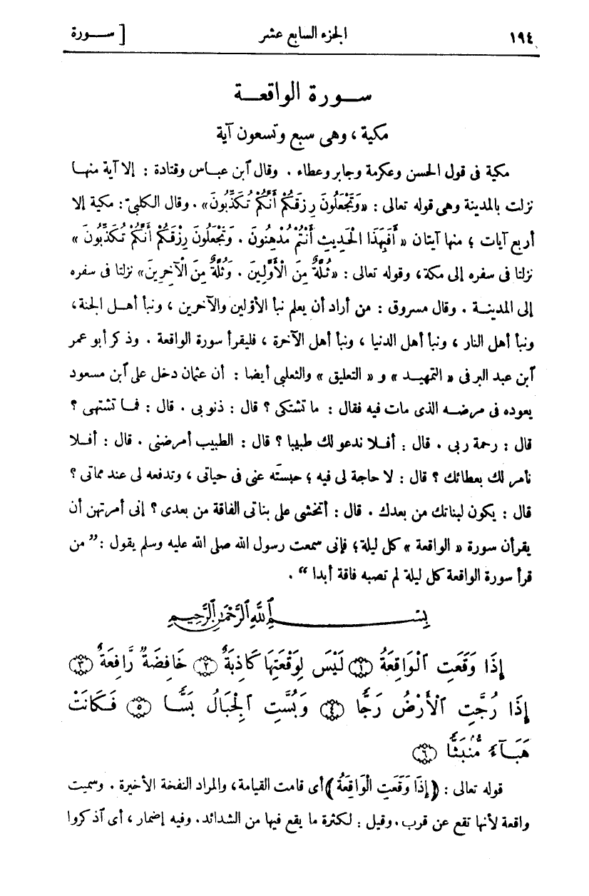 سورة الواقعة مَكِّيَّةٌ، وَهِيَ سَبْعٌ وَتِسْعُونَ آيَةً مَكِّيَّةٌ فِي قَوْلِ الْحَسَنِ وَعِكْرِمَةَ وَجَابِرٍ وَعَطَاءٍ. وَقَالَ ابْنُ عَبَّاسٍ وَقَتَادَةُ: إِلَّا آيَةً مِنْهَا نَزَلَتْ بِالْمَدِينَةِ وَهِيَ قَوْلُهُ تَعَالَى: (وَتَجْعَلُونَ رِزْقَكُمْ أَنَّكُمْ تُكَذِّبُونَ). وَقَالَ الْكَلْبِيُّ: مَكِّيَّةٌ إِلَّا أَرْبَعَ آيَاتٍ، مِنْهَا آيَتَانِ (أَفَبِهذَا الْحَدِيثِ أَنْتُمْ مُدْهِنُونَ. وَتَجْعَلُونَ رِزْقَكُمْ أَنَّكُمْ تُكَذِّبُونَ) نَزَلَتَا فِي سَفَرِهِ إِلَى مَكَّةَ، وَقَوْلُهُ تَعَالَى: (ثُلَّةٌ مِنَ الْأَوَّلِينَ. وَثُلَّةٌ مِنَ الْآخِرِينَ) نَزَلَتَا فِي سَفَرِهِ إِلَى الْمَدِينَةِ. وَقَالَ مَسْرُوقٌ: مَنْ أَرَادَ أَنْ يَعْلَمَ نَبَأَ الْأَوَّلِينَ وَالْآَخِرِينَ، وَنَبَأَ أَهْلِ الْجَنَّةِ، وَنَبَأَ أَهْلِ النَّارِ، وَنَبَأَ أَهْلِ الدُّنْيَا، وَنَبَأَ أَهْلِ الْآخِرَةِ، فَلْيَقْرَأْ سُورَةَ الْوَاقِعَةِ. وذكر أبو عمر ابن عَبْدِ الْبَرِّ فِي (التَّمْهِيدِ) وَ (التَّعْلِيقِ) وَالثَّعْلَبِيُّ أَيْضًا: أَنَّ عُثْمَانَ دَخَلَ عَلَى ابْنِ مَسْعُودٍ يَعُودُهُ فِي مَرَضِهِ الَّذِي مَاتَ فِيهِ فَقَالَ: مَا تَشْتَكِي؟ قَالَ: ذُنُوبِي. قَالَ: فَمَا تَشْتَهِي؟ قَالَ: رَحْمَةَ رَبِّي. قَالَ: أَفَلَا نَدْعُو لَكَ طَبِيبًا؟ قَالَ: الطَّبِيبُ أَمْرَضَنِي. قَالَ: أَفَلَا نَأْمُرُ لك بعطائك؟ قَالَ: لَا حَاجَةَ لِي فِيهِ، حَبَسْتَهُ عَنِّي فِي حَيَاتِي، وَتَدْفَعُهُ لِي عِنْدَ مَمَاتِي؟ قَالَ: يَكُونُ لِبَنَاتِكَ مِنْ بَعْدِكَ. قَالَ: أَتَخْشَى عَلَى بَنَاتِي الْفَاقَةَ مِنْ بَعْدِي؟ إِنِّي أَمَرْتُهُنَّ أَنْ يَقْرَأْنَ سُورَةَ (الْوَاقِعَةِ) كُلَّ لَيْلَةٍ، فَإِنِّي سَمِعْتُ رَسُولَ اللَّهِ صَلَّى اللَّهُ عَلَيْهِ وَسَلَّمَ يقول: (مَنْ قَرَأَ سُورَةَ الْوَاقِعَةِ كُلَّ لَيْلَةٍ لَمْ تُصِبْهُ فَاقَةٌ أَبَدًا.