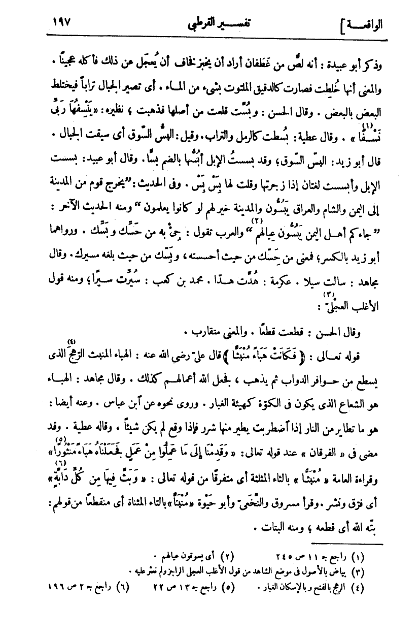 وَذَكَرَ أَبُو عُبَيْدَةَ: أَنَّهُ لِصٌّ مِنْ غَطَفَانَ أَرَادَ أَنْ يَخْبِزَ فَخَافَ أَنْ يُعْجَلَ عَنْ ذَلِكَ فَأَكَلَهُ عَجِينًا. وَالْمَعْنَى أَنَّهَا خُلِطَتْ فَصَارَتْ كَالدَّقِيقِ الْمَلْتُوتِ بِشَيْءٍ مِنَ الْمَاءِ. أَيْ تَصِيرُ الْجِبَالُ تُرَابًا فَيَخْتَلِطُ الْبَعْضُ بِالْبَعْضِ. وَقَالَ الْحَسَنُ: وبست قُلِعَتْ مِنْ أَصْلِهَا فَذَهَبَتْ، نَظِيرُهُ: (يَنْسِفُها رَبِّي نَسْفاً) «١». وَقَالَ عَطِيَّةُ: بُسِطَتْ كَالرَّمْلِ وَالتُّرَابِ. وَقِيلَ: الْبَسُّ السُّوقُ أَيْ سِيقَتِ الْجِبَالُ. قَالَ أَبُو زَيْدٍ: الْبَسُّ السُّوقُ، وَقَدْ بَسَسْتُ الْإِبِلَ أَبُسُّهَا بِالضَّمِّ بَسًّا. وَقَالَ أَبُو عُبَيْدٍ: بَسَسْتَ الْإِبِلَ وَأَبْسَسْتَ لُغَتَانِ إِذَا زَجَرْتَهَا وَقُلْتَ لَهَا بِسْ بِسْ. وَفِي الْحَدِيثِ: (يَخْرُجُ قَوْمٌ مِنَ الْمَدِينَةِ إِلَى الْيَمَنِ وَالشَّامِ وَالْعِرَاقِ يَبُسُّونَ وَالْمَدِينَةُ خَيْرٌ لَهُمْ لَوْ كَانُوا يَعْلَمُونَ) وَمِنْهُ الْحَدِيثُ الْآخَرُ: (جَاءَكُمْ أَهْلُ الْيَمَنِ يَبُسُّونَ عِيَالَهُمْ) «٢» وَالْعَرَبُ تَقُولُ: جئ بِهِ مِنْ حَسِّكَ وَبَسِّكَ. وَرَوَاهُمَا أَبُو زَيْدٍ بِالْكَسْرِ، فَمَعْنَى مِنْ حَسِّكَ مِنْ حَيْثُ أَحْسَسْتَهُ، وَبَسِّكَ مِنْ حَيْثُ بَلَغَهُ مَسِيرُكَ. وَقَالَ مُجَاهِدٌ: سَالَتْ سَيْلًا. عِكْرِمَةُ: هُدَّتْ هَدًّا. مُحَمَّدُ بْنُ كَعْبٍ: سُيَّرَتْ سَيْرًا، وَمِنْهُ قَوْلُ الْأَغْلَبِ الْعِجْلِيِّ «٣»: وَقَالَ الْحَسَنُ: قُطِعَتْ قَطْعًا. وَالْمَعْنَى مُتَقَارِبٌ. قَوْلُهُ تَعَالَى: (فَكانَتْ هَباءً مُنْبَثًّا) قَالَ عَلِيٌّ رَضِيَ الله عنه: الهباء المنبث الرَّهْجُ «٤» الَّذِي يَسْطَعُ مِنْ حَوَافِرِ الدَّوَابِّ ثُمَّ يَذْهَبُ، فَجَعَلَ اللَّهُ أَعْمَالَهُمْ كَذَلِكَ. وَقَالَ مُجَاهِدٌ: الْهَبَاءُ هُوَ الشُّعَاعُ الَّذِي يَكُونُ فِي الْكُوَّةِ كَهَيْئَةِ الْغُبَارِ. وَرُوِيَ نَحْوُهُ عَنِ ابْنِ عَبَّاسٍ. وَعَنْهُ أَيْضًا: هُوَ مَا تَطَايَرَ مِنَ النَّارِ إِذَا اضْطَرَبَتْ يَطِيرُ مِنْهَا شَرَرٌ فَإِذَا وَقَعَ لم يكن شيئا. وقال عَطِيَّةُ. وَقَدْ مَضَى فِي (الْفُرْقَانِ) عِنْدَ قَوْلُهُ تَعَالَى: (وَقَدِمْنا إِلى مَا عَمِلُوا مِنْ عَمَلٍ فَجَعَلْناهُ هَباءً مَنْثُوراً) «٥» وَقِرَاءَةُ الْعَامَّةِ (مُنْبَثًّا) بِالثَّاءِ الْمُثَلَّثَةِ أَيْ مُتَفَرِّقًا مِنْ قَوْلُهُ تَعَالَى: (وَبَثَّ فِيها مِنْ كُلِّ دَابَّةٍ) «٦» أَيْ فَرَّقَ وَنَشَرَ. وَقَرَأَ مَسْرُوقٌ وَالنَّخَعِيُّ وَأَبُو حَيْوَةَ (مُنْبَتًّا) بِالتَّاءِ الْمُثَنَّاةِ أَيْ مُنْقَطِعًا مِنْ قَوْلِهِمْ: بَتَّهُ اللَّهُ أي قطعه، ومنه البتات.