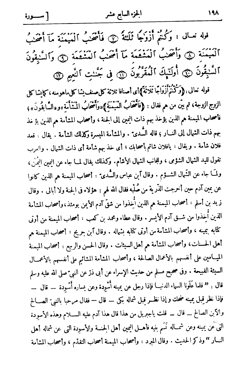 قَوْلُهُ تَعَالَى: (وَكُنْتُمْ أَزْواجاً ثَلاثَةً) أَيْ أَصْنَافًا ثَلَاثَةً كُلُّ، صِنْفٍ يُشَاكِلُ مَا هُوَ مِنْهُ، كَمَا يُشَاكِلُ الزَّوْجُ الزَّوْجَةَ، ثُمَّ بَيَّنَ مَنْ هم فقال: (فَأَصْحابُ الْمَيْمَنَةِ) (وَأَصْحابُ الْمَشْئَمَةِ) و (السَّابِقُونَ)، فَأَصْحَابُ الْمَيْمَنَةِ هُمُ الَّذِينَ يُؤْخَذُ بِهِمْ ذَاتَ الْيَمِينِ إِلَى الْجَنَّةِ، وَأَصْحَابُ الْمَشْأَمَةِ هُمُ الَّذِينَ يُؤْخَذُ بِهِمْ ذَاتَ الشِّمَالِ إِلَى النَّارِ، قَالَهُ السُّدِّيُّ. وَالْمَشْأَمَةُ الْمَيْسَرَةُ وَكَذَلِكَ الشَّأْمَةُ. يُقَالُ: قَعَدَ فُلَانٌ شَأْمَةً. وَيُقَالُ: يَا فُلَانُ شَائِمْ بِأَصْحَابِكَ، أَيْ خُذْ بِهِمْ شَأْمَةً أَيْ ذَاتَ الشِّمَالِ. وَالْعَرَبُ تَقُولُ لِلْيَدِ الشِّمَالِ الشُّؤْمَى، وَلِلْجَانِبِ الشِّمَالِ الْأَشْأَمُ. وَكَذَلِكَ يُقَالُ لِمَا جَاءَ عَنِ الْيَمِينِ الْيُمْنُ، وَلِمَا جَاءَ عَنِ الشِّمَالِ الشُّؤْمُ. وَقَالَ ابْنُ عَبَّاسٍ وَالسُّدِّيُّ: أَصْحَابُ الْمَيْمَنَةِ هُمُ الَّذِينَ كانوا عن يمين آدم حِينِ أُخْرِجَتِ الذُّرِّيَّةُ مِنْ صُلْبِهِ فَقَالَ اللَّهُ لَهُمْ: هَؤُلَاءِ فِي الْجَنَّةِ وَلَا أُبَالِي. وَقَالَ زَيْدُ بْنُ أَسْلَمَ: أَصْحَابُ الْمَيْمَنَةِ هُمُ الَّذِينَ أُخِذُوا مِنْ شِقِّ آدَمَ الْأَيْمَنِ يَوْمَئِذٍ، وَأَصْحَابُ الْمَشْأَمَةِ الَّذِينَ أُخِذُوا مِنْ شِقِّ آدَمَ الْأَيْسَرِ. وَقَالَ عَطَاءٌ وَمُحَمَّدُ بْنُ كَعْبٍ: أَصْحَابُ الْمَيْمَنَةِ مَنْ أُوتِيَ كِتَابَهُ بِيَمِينِهِ، وَأَصْحَابُ الْمَشْأَمَةِ مَنْ أُوتِيَ كِتَابَهُ بِشِمَالِهِ. وَقَالَ ابْنُ جُرَيْجٍ: أَصْحَابُ الْمَيْمَنَةِ هُمْ أَهْلُ الْحَسَنَاتِ، وَأَصْحَابُ الْمَشْأَمَةِ هُمْ أَهْلُ السَّيِّئَاتِ. وَقَالَ الْحَسَنُ وَالرَّبِيعُ: أَصْحَابُ الْمَيْمَنَةِ الْمَيَامِينُ عَلَى أَنْفُسِهِمْ بِالْأَعْمَالِ الصَّالِحَةِ، وَأَصْحَابُ الْمَشْأَمَةِ الْمَشَائِيمُ عَلَى أَنْفُسِهِمْ بِالْأَعْمَالِ السَّيِّئَةِ الْقَبِيحَةِ. وَفِي صَحِيحِ مُسْلِمٍ مِنْ حَدِيثِ الْإِسْرَاءِ عَنْ أَبِي ذَرٍّ عَنِ النَّبِيِّ صَلَّى اللَّهُ عَلَيْهِ وَسَلَّمَ قَالَ: (فَلَمَّا عَلَوْنَا السَّمَاءَ الدُّنْيَا فَإِذَا رَجُلٌ عَنْ يَمِينِهِ أَسْوِدَةٌ وَعَنْ يَسَارِهِ أَسْوِدَةٌ- قَالَ- فَإِذَا نَظَرَ قِبَلَ يَمِينِهِ ضَحِكَ وَإِذَا نَظَرَ قِبَلَ شِمَالِهِ بَكَى- قَالَ- فَقَالَ مَرْحَبًا بِالنَّبِيِّ الصَّالِحِ وَالِابْنِ الصَّالِحِ- قَالَ- قُلْتُ يَا جِبْرِيلُ مَنْ هَذَا قَالَ هَذَا آدَمُ عَلَيْهِ السَّلَامُ وَهَذِهِ الْأَسْوِدَةُ الَّتِي عَنْ يَمِينِهِ وَعَنْ شِمَالِهِ نَسَمُ بَنِيهِ فَأَهْلُ الْيَمِينِ أَهْلُ الْجَنَّةِ وَالْأَسْوِدَةُ الَّتِي عَنْ شِمَالِهِ أَهْلُ النَّارِ) وَذَكَرَ الْحَدِيثَ. وَقَالَ الْمُبَرِّدُ: وَأَصْحَابُ الْمَيْمَنَةِ أَصْحَابُ التَّقَدُّمِ، وَأَصْحَابُ المشأمة