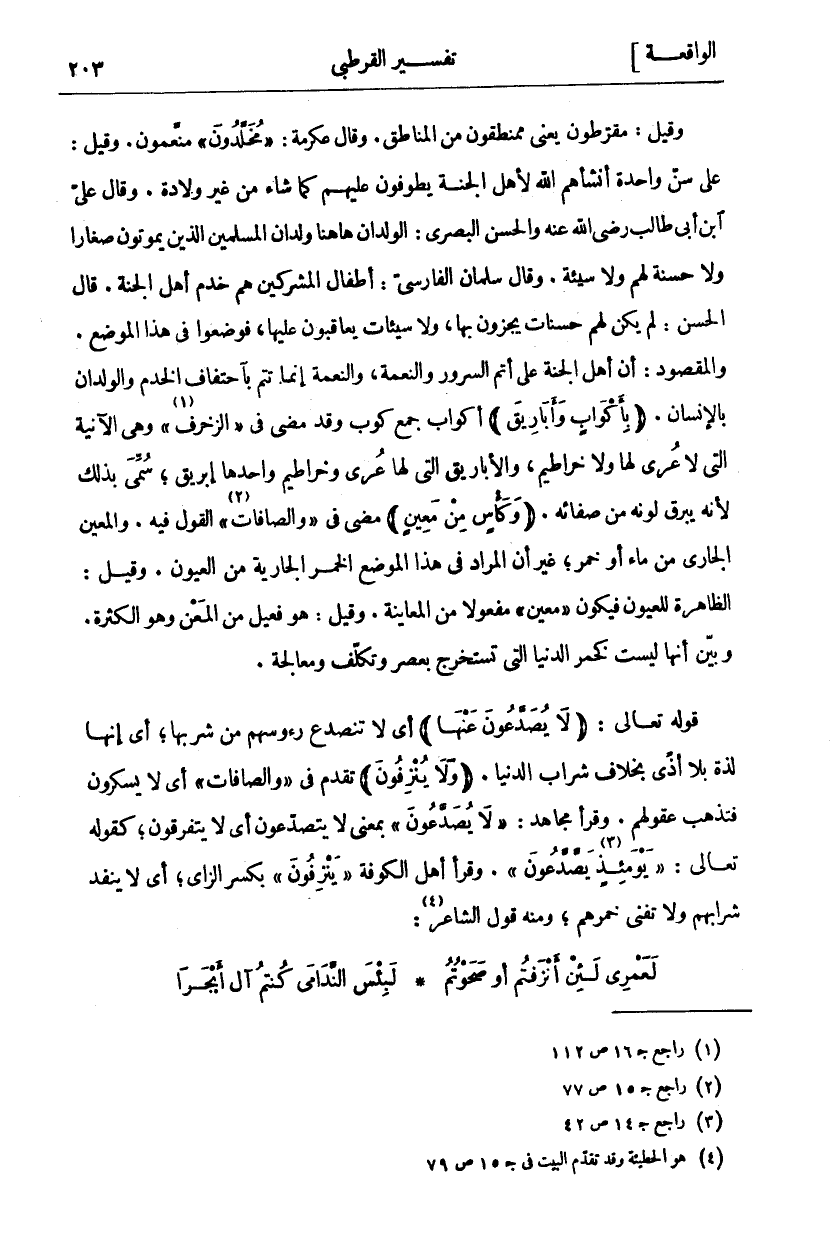 وَقِيلَ: مُقَرَّطُونَ يَعْنِي مُمَنْطَقُونَ مِنَ الْمَنَاطِقِ. وَقَالَ عِكْرِمَةُ: (مُخَلَّدُونَ) مُنَعَّمُونَ. وَقِيلَ: عَلَى سِنٍّ وَاحِدَةٍ أَنْشَأَهُمُ اللَّهُ لِأَهْلِ الْجَنَّةِ يَطُوفُونَ عَلَيْهِمْ كَمَا شاء من غير ولادة. وقال علي ابن أَبِي طَالِبٍ رَضِيَ اللَّهُ عَنْهُ وَالْحَسَنُ الْبَصْرِيُّ: الولدان ها هنا وِلْدَانُ الْمُسْلِمِينَ الَّذِينَ يَمُوتُونَ صِغَارًا وَلَا حَسَنَةَ لَهُمْ وَلَا سَيِّئَةَ. وَقَالَ سَلْمَانُ الْفَارِسِيُّ: أَطْفَالُ الْمُشْرِكِينَ هُمْ خَدَمُ أَهْلِ الْجَنَّةِ. قَالَ الْحَسَنُ: لَمْ يَكُنْ لَهُمْ حَسَنَاتٌ يُجْزَوْنَ بِهَا، وَلَا سَيِّئَاتٌ يُعَاقَبُونَ عَلَيْهَا، فَوُضِعُوا فِي هَذَا الْمَوْضِعِ. وَالْمَقْصُودُ: أَنَّ أَهْلَ الْجَنَّةِ عَلَى أَتَمِّ السُّرُورِ وَالنِّعْمَةِ، وَالنِّعْمَةُ إِنَّمَا تَتِمُّ بِاحْتِفَافِ الْخَدَمِ وَالْوِلْدَانِ بِالْإِنْسَانِ. (بِأَكْوابٍ وَأَبارِيقَ) أَكْوَابٌ جَمْعُ كُوبٍ وَقَدْ مَضَى فِي (الزُّخْرُفِ) «١» وَهِيَ الْآنِيَةُ الَّتِي لَا عُرَى لَهَا وَلَا خَرَاطِيمَ، وَالْأَبَارِيقُ الَّتِي لَهَا عُرَى وَخَرَاطِيمُ وَاحِدُهَا إِبْرِيقٌ، سُمِّيَ بِذَلِكَ لِأَنَّهُ يَبْرُقُ لَوْنُهُ مِنْ صَفَائِهِ. (وَكَأْسٍ مِنْ مَعِينٍ) مَضَى فِي (وَالصَّافَّاتِ) «٢» الْقَوْلُ فِيهِ. وَالْمَعِينُ الْجَارِي مِنْ مَاءٍ أَوْ خَمْرٍ، غَيْرَ أَنَّ الْمُرَادَ فِي هَذَا الْمَوْضِعِ الْخَمْرُ الْجَارِيَةُ مِنَ الْعُيُونِ. وَقِيلَ: الظَّاهِرَةُ لِلْعُيُونِ فَيَكُونُ (مَعِينٍ) مَفْعُولًا مِنَ الْمُعَايَنَةِ. وَقِيلَ: هُوَ فَعِيلٌ مِنَ الْمَعْنِ وَهُوَ الْكَثْرَةُ. وَبَيَّنَ أَنَّهَا لَيْسَتْ كَخَمْرِ الدُّنْيَا الَّتِي تُسْتَخْرَجُ بِعَصْرٍ وَتَكَلُّفٍ وَمُعَالَجَةٍ. قَوْلُهُ تَعَالَى: (لَا يُصَدَّعُونَ عَنْها) أي لا تنصدع رؤوسهم مِنْ شُرْبِهَا، أَيْ أَنَّهَا لَذَّةٌ بِلَا أَذًى بِخِلَافِ شَرَابِ الدُّنْيَا. (وَلا يُنْزِفُونَ) تَقَدَّمَ فِي (وَالصَّافَّاتِ) أَيْ لَا يَسْكَرُونَ فَتَذْهَبُ عُقُولُهُمْ. وَقَرَأَ مُجَاهِدٌ: (لَا يُصَدَّعُونَ) بِمَعْنَى لَا يَتَصَدَّعُونَ أَيْ لَا يَتَفَرَّقُونَ، كَقَوْلِهِ تَعَالَى: (يَوْمَئِذٍ «٣» يَصَّدَّعُونَ). وَقَرَأَ أَهْلُ الْكُوفَةِ (يُنْزِفُونَ) بِكَسْرِ الزَّايِ، أَيْ لَا ينفد شرابهم ولا تقنى خَمْرُهُمْ، وَمِنْهُ قَوْلُ الشَّاعِرِ «٤»: