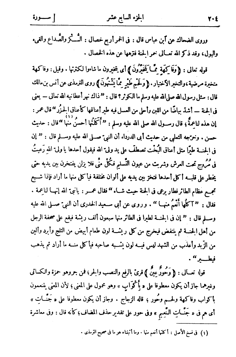 وَرَوَى الضَّحَّاكُ عَنِ ابْنِ عَبَّاسٍ قَالَ: فِي الْخَمْرِ أَرْبَعُ خِصَالٍ: السُّكْرُ وَالصُّدَاعُ وَالْقَيْءُ وَالْبَوْلُ، وَقَدْ ذَكَرَ اللَّهُ تَعَالَى خَمْرَ الْجَنَّةِ فَنَزَّهَهَا عَنْ هَذِهِ الْخِصَالِ. قَوْلُهُ تَعَالَى: (وَفاكِهَةٍ مِمَّا يَتَخَيَّرُونَ) أَيْ يَتَخَيَّرُونَ مَا شَاءُوا لِكَثْرَتِهَا. وَقِيلَ: وَفَاكِهَةٌ مُتَخَيَّرَةٌ مُرْضِيَةٌ، وَالتَّخَيُّرُ الِاخْتِيَارُ. (وَلَحْمِ طَيْرٍ مِمَّا يَشْتَهُونَ) رَوَى التِّرْمِذِيُّ عَنْ أَنَسِ بْنِ مَالِكٍ قَالَ: سُئِلَ رَسُولُ اللَّهِ صَلَّى اللَّهُ عَلَيْهِ وَسَلَّمَ مَا الْكَوْثَرُ؟ قَالَ: (ذَاكَ نَهَرٌ أَعْطَانِيهِ اللَّهُ تَعَالَى- يَعْنِي فِي الْجَنَّةِ- أَشَدُّ بياضا من اللبن أحلى مِنَ الْعَسَلِ فِيهِ طَيْرٌ أَعْنَاقُهَا كَأَعْنَاقِ الْجُزُرِ) قَالَ عُمَرُ: إِنَّ هَذِهِ لَنَاعِمَةٌ، قَالَ رَسُولُ اللَّهِ صَلَّى اللَّهُ عَلَيْهِ وَسَلَّمَ: (أَكَلَتُهَا أَحْسَنُ مِنْهَا) «١» قَالَ: حَدِيثٌ حَسَنٌ. وَخَرَّجَهُ الثَّعْلَبِيُّ مِنْ حَدِيثِ أَبِي الدَّرْدَاءِ أَنَّ النَّبِيَّ صَلَّى اللَّهُ عَلَيْهِ وَسَلَّمَ قَالَ: (إِنَّ فِي الْجَنَّةِ طَيْرًا مِثْلَ أَعْنَاقِ الْبُخْتِ تَصْطَفُّ عَلَى يَدِ وَلِيِّ اللَّهِ فَيَقُولُ أَحَدُهَا يَا وَلِيَّ اللَّهِ رَعَيْتُ فِي مُرُوجٍ تَحْتَ الْعَرْشِ وَشَرِبْتُ مِنْ عُيُونِ التَّسْنِيمِ فَكُلْ مِنِّي فَلَا يَزَلْنَ يَفْتَخِرْنَ بَيْنَ يَدَيْهِ حَتَّى يَخْطِرَ عَلَى قَلْبِهِ أَكْلُ أَحَدِهَا فَتَخِرُّ بَيْنَ يَدَيْهِ عَلَى أَلْوَانٍ مُخْتَلِفَةٍ فَيَأْكُلُ مِنْهَا مَا أَرَادَ فَإِذَا شَبِعَ تَجَمَّعَ عِظَامُ الطَّائِرِ فَطَارَ يَرْعَى فِي الْجَنَّةِ حَيْثُ شَاءَ) فقال عمر: يا نبي الله إنها لنا عمة. فَقَالَ: (آكِلُهَا أَنْعَمُ مِنْهَا). وَرُوِيَ عَنْ أَبِي سَعِيدٍ الْخُدْرِيِّ أَنَّ النَّبِيَّ صَلَّى اللَّهُ عَلَيْهِ وَسَلَّمَ قَالَ: (إِنَّ فِي الْجَنَّةِ لَطَيْرًا فِي الطَّائِرِ مِنْهَا سَبْعُونَ أَلْفَ رِيشَةٍ فَيَقَعُ عَلَى صَحْفَةِ الرَّجُلِ مِنْ أَهْلِ الْجَنَّةِ ثُمَّ يَنْتَفِضُ فَيَخْرُجُ مِنْ كُلِّ رِيشَةٍ لَوْنُ طَعَامٍ أَبْيَضَ مِنَ الثَّلْجِ وَأَبْرَدَ وَأَلْيَنَ مِنَ الزُّبْدِ وَأَعْذَبَ مِنَ الشَّهْدِ لَيْسَ فِيهِ لَوْنٌ يُشْبِهُ صَاحِبَهُ فَيَأْكُلُ مِنْهُ مَا أَرَادَ ثُمَّ يَذْهَبُ فَيَطِيرُ (. قَوْلُهُ تَعَالَى:) وَحُورٌ عِينٌ) قُرِئَ بِالرَّفْعِ وَالنَّصْبِ وَالْجَرِّ، فَمَنْ جَرَّ وَهُوَ حَمْزَةُ وَالْكِسَائِيُّ وَغَيْرُهُمَا جَازَ أَنْ يَكُونَ مَعْطُوفًا عَلَى (بِأَكْوابٍ) وَهُوَ مَحْمُولٌ عَلَى الْمَعْنَى، لِأَنَّ الْمَعْنَى يَتَنَعَّمُونَ بِأَكْوَابٍ وَفَاكِهَةٍ وَلَحْمٍ وَحُورٍ، قَالَهُ الزَّجَّاجُ. وَجَازَ أَنْ يَكُونَ مَعْطُوفًا عَلَى (جَنَّاتِ) أَيْ هُمْ فِي (جَنَّاتِ النَّعِيمِ) وَفِي حُورٌ عَلَى تَقْدِيرِ حَذْفِ المضاف، كأنه قال: وفي معاشرة