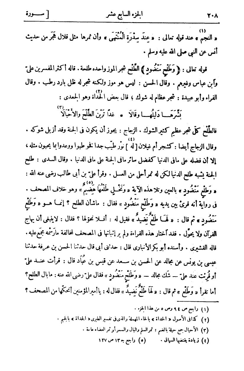 (النَّجْمِ) «١» عِنْدَ قَوْلِهِ تَعَالَى: (عِنْدَ سِدْرَةِ الْمُنْتَهى) وَأَنَّ ثَمَرَهَا مِثْلُ قِلَالِ هَجَرَ مِنْ حَدِيثِ أَنَسٍ عَنِ النَّبِيِّ صَلَّى اللَّهُ عَلَيْهِ وَسَلَّمَ. قَوْلُهُ تَعَالَى: (وَطَلْحٍ مَنْضُودٍ) الطَّلْحُ شَجَرُ الْمَوْزِ وَاحِدُهُ طَلْحَةُ. قَالَهُ أَكْثَرُ الْمُفَسِّرِينَ عَلِيٌّ وَابْنُ عَبَّاسٍ وَغَيْرُهُمْ. وَقَالَ الْحَسَنُ: لَيْسَ هُوَ مَوْزٌ وَلَكِنَّهُ شَجَرٌ لَهُ ظِلٌّ بَارِدٌ رَطْبٌ. وَقَالَ الْفَرَّاءُ وَأَبُو عُبَيْدَةَ: شَجَرٌ عِظَامٌ لَهُ شَوْكٌ، قَالَ بَعْضُ الْحُدَاةِ «٢» وَهُوَ الْجَعْدِيُّ: