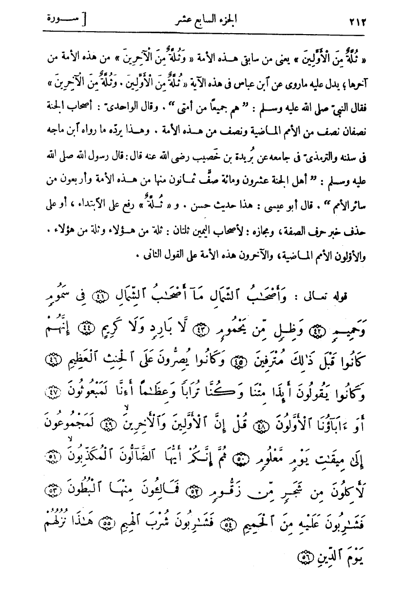 (ثُلَّةٌ مِنَ الْأَوَّلِينَ) يَعْنِي مِنْ سَابِقِي هَذِهِ الْأُمَّةِ (وَثُلَّةٌ مِنَ الْآخِرِينَ) مِنْ هَذِهِ الْأُمَّةِ مِنْ آخِرِهَا، يَدُلُّ عَلَيْهِ مَا رُوِيَ عَنِ ابْنِ عَبَّاسٍ فِي هَذِهِ الْآيَةِ (ثُلَّةٌ مِنَ الْأَوَّلِينَ. وَثُلَّةٌ مِنَ الْآخِرِينَ) فَقَالَ النَّبِيُّ صَلَّى اللَّهُ عَلَيْهِ وَسَلَّمَ: (هُمْ جَمِيعًا مِنْ أُمَّتِي). وقال الواحدي: أصحاب الجنة نصفان نصف مِنَ الْأُمَمِ الْمَاضِيَةِ وَنِصْفٌ مِنْ هَذِهِ الْأُمَّةِ. وَهَذَا يَرُدُّهُ مَا رَوَاهُ ابْنُ مَاجَهْ فِي سُنَنِهِ وَالتِّرْمِذِيُّ فِي جَامِعِهِ عَنْ بُرَيْدَةَ بْنِ خصيب رَضِيَ اللَّهُ عَنْهُ قَالَ: قَالَ رَسُولُ اللَّهِ صَلَّى اللَّهُ عَلَيْهِ وَسَلَّمَ: (أَهْلُ الْجَنَّةِ عِشْرُونَ وَمِائَةُ صَفٍّ ثَمَانُونَ مِنْهَا مِنْ هَذِهِ الْأُمَّةِ وَأَرْبَعُونَ مِنْ سَائِرِ الْأُمَمِ). قَالَ أَبُو عِيسَى: هَذَا حَدِيثٌ حَسَنٌ. وَ (ثُلَّةٌ) رُفِعَ عَلَى الِابْتِدَاءِ، أَوْ عَلَى حَذْفِ خَبَرِ حَرْفِ الصِّفَةِ، وَمَجَازُهُ: لِأَصْحَابِ الْيَمِينِ ثُلَّتَانِ: ثُلَّةٌ مِنْ هَؤُلَاءِ وَثُلَّةٌ مِنْ هَؤُلَاءِ. وَالْأَوَّلُونَ الْأُمَمُ الْمَاضِيَةُ، وَالْآخِرُونَ هذه الامة على القول الثاني.