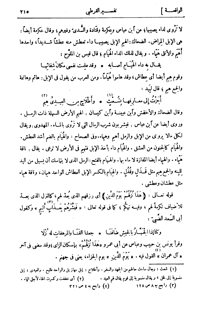 وَقَالَ الضَّحَّاكُ وَالْأَخْفَشُ وَابْنُ عُيَيْنَةَ وَابْنُ كَيْسَانَ: الْهِيمُ الْأَرْضُ السَّهْلَةُ ذَاتُ الرَّمَلِ. وَرُوِيَ أَيْضًا عَنِ ابْنِ عَبَّاسٍ: فَيَشْرَبُونَ شُرْبَ الرِّمَالِ الَّتِي لَا تُرْوَى بِالْمَاءِ. المهدوي: ويقال لكل مالا يُرْوَى مِنَ الْإِبِلِ وَالرَّمَلِ أَهْيَمُ وَهَيْمَاءُ. وَفِي الصِّحَاحِ: وَالْهُيَامُ بِالضَّمِّ أَشَدُّ الْعَطَشِ. وَالْهُيَامُ كَالْجُنُونِ مِنَ الْعِشْقِ. وَالْهُيَامُ دَاءٌ يَأْخُذُ الْإِبِلَ فَتَهِيمُ فِي الْأَرْضِ لَا تَرْعَى. يُقَالُ: نَاقَةٌ هَيْمَاءُ. وَالْهَيْمَاءُ أَيْضًا الْمَفَازَةُ لَا مَاءَ بِهَا. وَالْهَيَامُ بِالْفَتْحِ: الرَّمْلُ الَّذِي لَا يَتَمَاسَكُ أَنْ يَسِيلَ مِنَ الْيَدِ لِلِينِهِ وَالْجَمْعُ هِيمٌ مِثْلُ قَذَالٍ وَقُذُلٍ. وَالْهِيَامُ بِالْكَسْرِ الْإِبِلُ الْعِطَاشُ الْوَاحِدُ هَيْمَانُ، وَنَاقَةٌ هَيْمَاءُ مِثْلُ عَطْشَانَ وَعَطْشَى. قَوْلُهُ تَعَالَى: (هَذَا نُزُلُهُمْ يَوْمَ الدِّينِ) أَيْ رِزْقُهُمُ الَّذِي يُعَدُّ لَهُمْ، كَالنُّزُلِ الَّذِي يُعَدُّ لِلْأَضْيَافِ تَكْرِمَةً لَهُمْ، وَفِيهِ تَهَكُّمٌ، كَمَا فِي قَوْلِهِ تَعَالَى: (فَبَشِّرْهُمْ بِعَذابٍ»