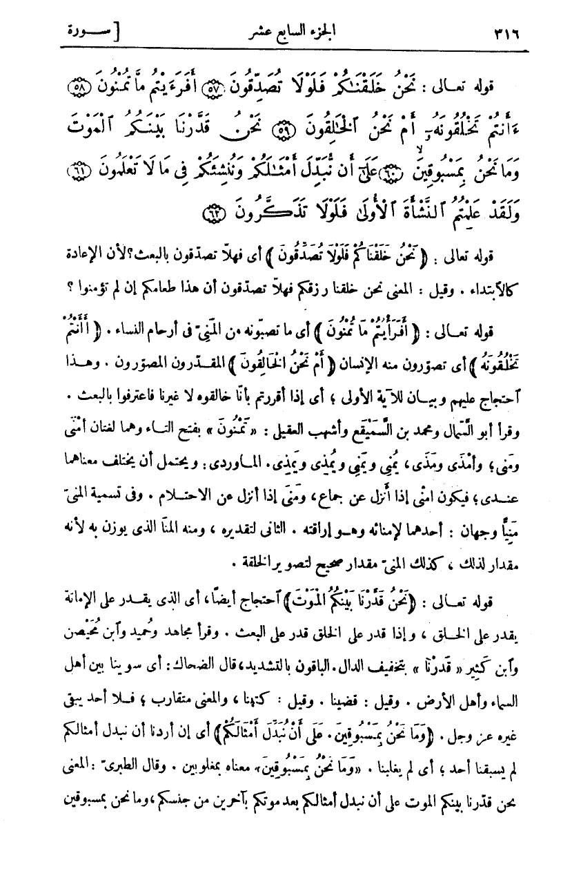 قوله تعالى: (نَحْنُ خَلَقْناكُمْ فَلَوْلا تُصَدِّقُونَ) أَيْ فَهَلَّا تُصَدِّقُونَ بِالْبَعْثِ؟ لِأَنَّ الْإِعَادَةَ كَالِابْتِدَاءِ. وَقِيلَ: الْمَعْنَى نَحْنُ خَلَقْنَا رِزْقَكُمْ فَهَلَّا تُصَدِّقُونَ أَنَّ هَذَا طَعَامُكُمْ إِنْ لَمْ تُؤْمِنُوا؟ قَوْلُهُ تَعَالَى: (أَفَرَأَيْتُمْ مَا تُمْنُونَ) أَيْ مَا تَصُبُّونَهُ مِنَ الْمَنِيِّ فِي أَرْحَامِ النِّسَاءِ. (أَأَنْتُمْ تَخْلُقُونَهُ) أَيْ تُصَوِّرُونَ مِنْهُ الْإِنْسَانَ (أَمْ نَحْنُ الْخالِقُونَ) الْمُقَدِّرُونَ الْمُصَوِّرُونَ. وَهَذَا احْتِجَاجٌ عَلَيْهِمْ وَبَيَانٌ لِلْآيَةِ الْأُولَى، أَيْ إِذَا أَقْرَرْتُمْ بِأَنَّا خَالِقُوهُ لَا غَيْرُنَا فَاعْتَرِفُوا بِالْبَعْثِ. وَقَرَأَ أَبُو السَّمَّالِ ومحمد بن السميقع وَأَشْهَبُ الْعُقَيْلِيُّ: (تَمْنُونَ) بِفَتْحِ التَّاءِ وَهُمَا لُغَتَانِ أَمْنَى وَمَنَى، وَأَمْذَى وَمَذَى، يُمْنِي وَيَمْنِي وَيُمْذِي وَيَمْذِي. الْمَاوَرْدِيُّ: وَيَحْتَمِلُ أَنْ يَخْتَلِفَ مَعْنَاهَا عِنْدِي، فَيَكُونُ أَمْنَى إِذَا أَنْزَلَ عَنْ جِمَاعٍ، وَمَنَى إِذَا أَنْزَلَ عَنْ الِاحْتِلَامِ. وَفِي تَسْمِيَةِ الْمَنِيِّ مَنِيًّا وَجْهَانِ: أَحَدُهُمَا لِإِمْنَائِهِ وَهُوَ إِرَاقَتُهُ. الثَّانِي لِتَقْدِيرِهِ، وَمِنْهُ الْمَنَا الَّذِي يُوزَنُ بِهِ لِأَنَّهُ مقدار لذلك، كذلك الْمَنِيُّ مِقْدَارٌ صَحِيحٌ لِتَصْوِيرِ الْخِلْقَةِ. قَوْلُهُ تَعَالَى: (نَحْنُ قَدَّرْنا بَيْنَكُمُ الْمَوْتَ) احْتِجَاجٌ أَيْضًا، أَيِ الَّذِي يَقْدِرُ عَلَى الْإِمَاتَةِ يَقْدِرُ عَلَى الْخَلْقِ، وَإِذَا قَدَرَ عَلَى الْخَلْقِ قَدَرَ عَلَى الْبَعْثِ. وَقَرَأَ مُجَاهِدٌ وَحُمَيْدٌ وَابْنُ مُحَيْصِنٍ وَابْنُ كَثِيرٍ (قَدَرْنَا) بِتَخْفِيفِ الدَّالِ. الْبَاقُونَ بِالتَّشْدِيدِ، قَالَ الضَّحَّاكُ: أَيْ سَوَّيْنَا بَيْنَ أَهْلِ السَّمَاءِ وَأَهْلِ الْأَرْضِ. وَقِيلَ: قَضَيْنَا. وَقِيلَ: كَتَبْنَا، وَالْمَعْنَى مُتَقَارِبٌ، فَلَا أَحَدَ يَبْقَى غَيْرُهُ عَزَّ وَجَلَّ. (وَما نَحْنُ بِمَسْبُوقِينَ. عَلى أَنْ نُبَدِّلَ أَمْثالَكُمْ) أَيْ إِنْ أَرَدْنَا أَنْ نُبَدِّلَ أَمْثَالَكُمْ لَمْ يسبقنا أحد، أي لم يغلبنا. (وَما نَحْنُ بِمَسْبُوقِينَ) مَعْنَاهُ بِمَغْلُوبِينَ. وَقَالَ الطَّبَرِيُّ: الْمَعْنَى نَحْنُ قَدَّرْنَا بَيْنَكُمُ الْمَوْتَ عَلَى أَنْ نُبَدِّلَ أَمْثَالَكُمْ بَعْدَ مَوْتِكُمْ بِآخَرِينَ مِنْ جِنْسِكُمْ، وَمَا نَحْنُ بمسبوقين