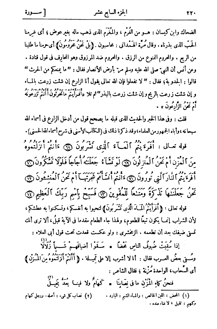 الضَّحَّاكُ وَابْنُ كَيْسَانَ: هُوَ مِنَ الْغُرْمِ، وَالْمُغْرَمُ الَّذِي ذَهَبَ مَالُهُ بِغَيْرِ عِوَضٍ، أَيْ غَرِمْنَا الْحَبَّ الَّذِي بَذَرْنَاهُ. وَقَالَ مُرَّةُ الْهَمْدَانِيُّ: مُحَاسَبُونَ. (بَلْ نَحْنُ مَحْرُومُونَ) أَيْ حُرِمْنَا مَا طَلَبْنَا مِنَ الرِّيعِ. وَالْمَحْرُومُ الْمَمْنُوعُ مِنَ الرِّزْقِ. وَالْمَحْرُومُ ضِدُّ الْمَرْزُوقِ وَهُوَ الْمُحَارِفُ فِي قَوْلِ قَتَادَةَ. وَعَنْ أَنَسٍ أَنَّ النَّبِيَّ صَلَّى اللَّهُ عَلَيْهِ وَسَلَّمَ مَرَّ بِأَرْضِ الْأَنْصَارِ فَقَالَ: (مَا يَمْنَعُكُمْ مِنَ الْحَرْثِ) قَالُوا: الْجُدُوبَةُ، فَقَالَ: (لَا تَفْعَلُوا فَإِنَّ اللَّهَ تَعَالَى يَقُولُ أَنَا الزَّارِعُ إِنْ شِئْتُ زَرَعْتُ بِالْمَاءِ وَإِنْ شِئْتُ زَرَعْتُ بِالرِّيحِ وَإِنْ شِئْتُ زَرَعْتُ بِالْبَذْرِ) ثُمَّ تَلَا (أَفَرَأَيْتُمْ مَا تَحْرُثُونَ أَأَنْتُمْ تَزْرَعُونَهُ أَمْ نَحْنُ الزَّارِعُونَ). قُلْتُ: وَفِي هَذَا الْخَبَرِ وَالْحَدِيثِ الَّذِي قَبْلَهُ مَا يُصَحِّحُ قَوْلَ مَنْ أَدْخَلَ الزَّارِعَ فِي أَسْمَاءِ اللَّهِ سُبْحَانَهُ، وَأَبَاهُ الْجُمْهُورُ مِنَ الْعُلَمَاءِ، وَقَدْ ذَكَرْنَا ذَلِكَ فِي (الْكِتَابِ الْأَسْنَى فِي شَرْحِ أَسْمَاءِ اللَّهِ الحسنى).