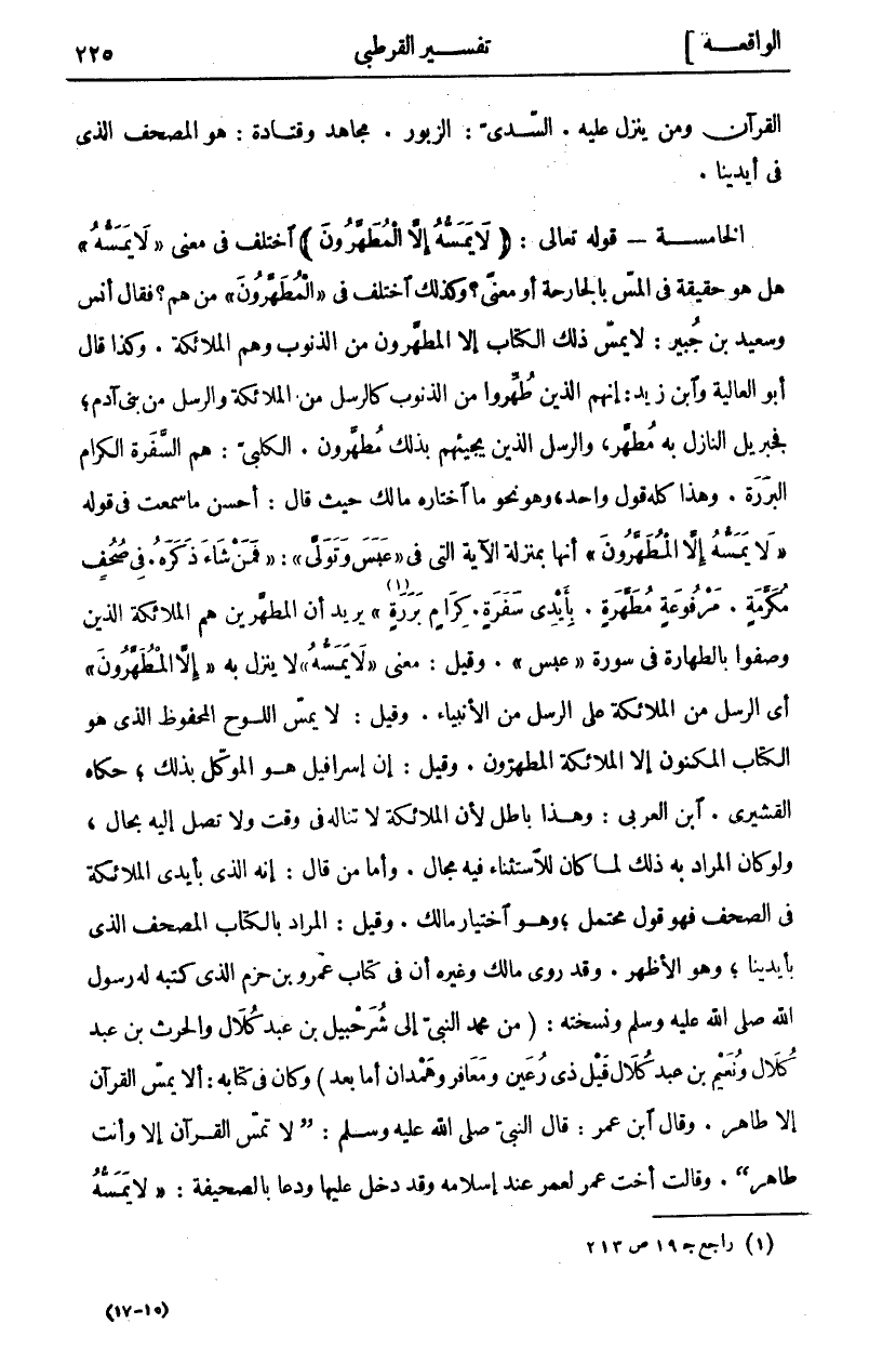 «١» يُرِيدُ أَنَّ الْمُطَهَّرِينَ هُمُ الْمَلَائِكَةُ الَّذِينَ وُصِفُوا بِالطَّهَارَةِ فِي سُورَةِ (عَبَسَ). وَقِيلَ: مَعْنَى (لَا يَمَسُّهُ) لَا يَنْزِلُ بِهِ (إِلَّا الْمُطَهَّرُونَ) أَيِ الرُّسُلُ مِنَ الْمَلَائِكَةِ عَلَى الرُّسُلِ مِنَ الْأَنْبِيَاءِ. وَقِيلَ: لَا يَمَسُّ اللَّوْحَ الْمَحْفُوظَ الَّذِي هُوَ الْكِتَابُ الْمَكْنُونُ إِلَّا الْمَلَائِكَةُ الْمُطَهَّرُونَ. وَقِيلَ: إِنَّ إِسْرَافِيلَ هُوَ الْمُوَكَّلُ بِذَلِكَ، حَكَاهُ الْقُشَيْرِيُّ. ابْنُ الْعَرَبِيِّ: وَهَذَا بَاطِلٌ لِأَنَّ الْمَلَائِكَةَ لَا تَنَالُهُ فِي وَقْتٍ وَلَا تَصِلُ إِلَيْهِ بِحَالٍ، وَلَوْ كَانَ الْمُرَادُ بِهِ ذَلِكَ لَمَا كَانَ لِلِاسْتِثْنَاءِ فِيهِ مَجَالٌ. وَأَمَّا مَنْ قَالَ: إِنَّهُ الَّذِي بِأَيْدِي الْمَلَائِكَةِ فِي الصُّحُفِ فَهُوَ قَوْلٌ مُحْتَمَلٌ، وَهُوَ اخْتِيَارُ مَالِكٍ. وَقِيلَ: الْمُرَادُ بِالْكِتَابِ الْمُصْحَفُ الَّذِي بِأَيْدِينَا، وَهُوَ الأظهر. وقد روى مالك وغيره أن كِتَابِ عَمْرِو بْنِ حَزْمٍ الَّذِي كَتَبَهُ لَهُ رَسُولُ اللَّهِ صَلَّى اللَّهُ عَلَيْهِ وَسَلَّمَ وَنُسْخَتُهُ: (مِنْ مُحَمَّدٍ النَّبِيِّ إِلَى شُرَحْبِيلَ بْنِ عَبْدِ كُلَالٍ وَالْحَارِثِ بْنِ عَبْدِ كُلَالٍ وَنُعَيْمِ بْنِ عَبْدِ كُلَالٍ قَيْلُ ذِي رُعَيْنٍ وَمَعَافِرَ وَهَمْدَانَ أَمَّا بَعْدُ) وَكَانَ فِي كِتَابِهِ: أَلَّا يَمَسَّ الْقُرْآنَ إِلَّا طَاهِرٌ. وَقَالَ ابْنُ عُمَرَ: قَالَ النَّبِيُّ صَلَّى اللَّهُ عَلَيْهِ وَسَلَّمَ: (لَا تَمَسَّ الْقُرْآنَ إِلَّا وَأَنْتَ طَاهِرٌ). وَقَالَتْ أُخْتُ عُمَرَ لِعُمَرَ عِنْدَ إِسْلَامِهِ وَقَدْ دَخَلَ عَلَيْهَا وَدَعَا بالصحيفة: (لا يَمَسُّهُ إِلَّا الْمُطَهَّرُونَ)