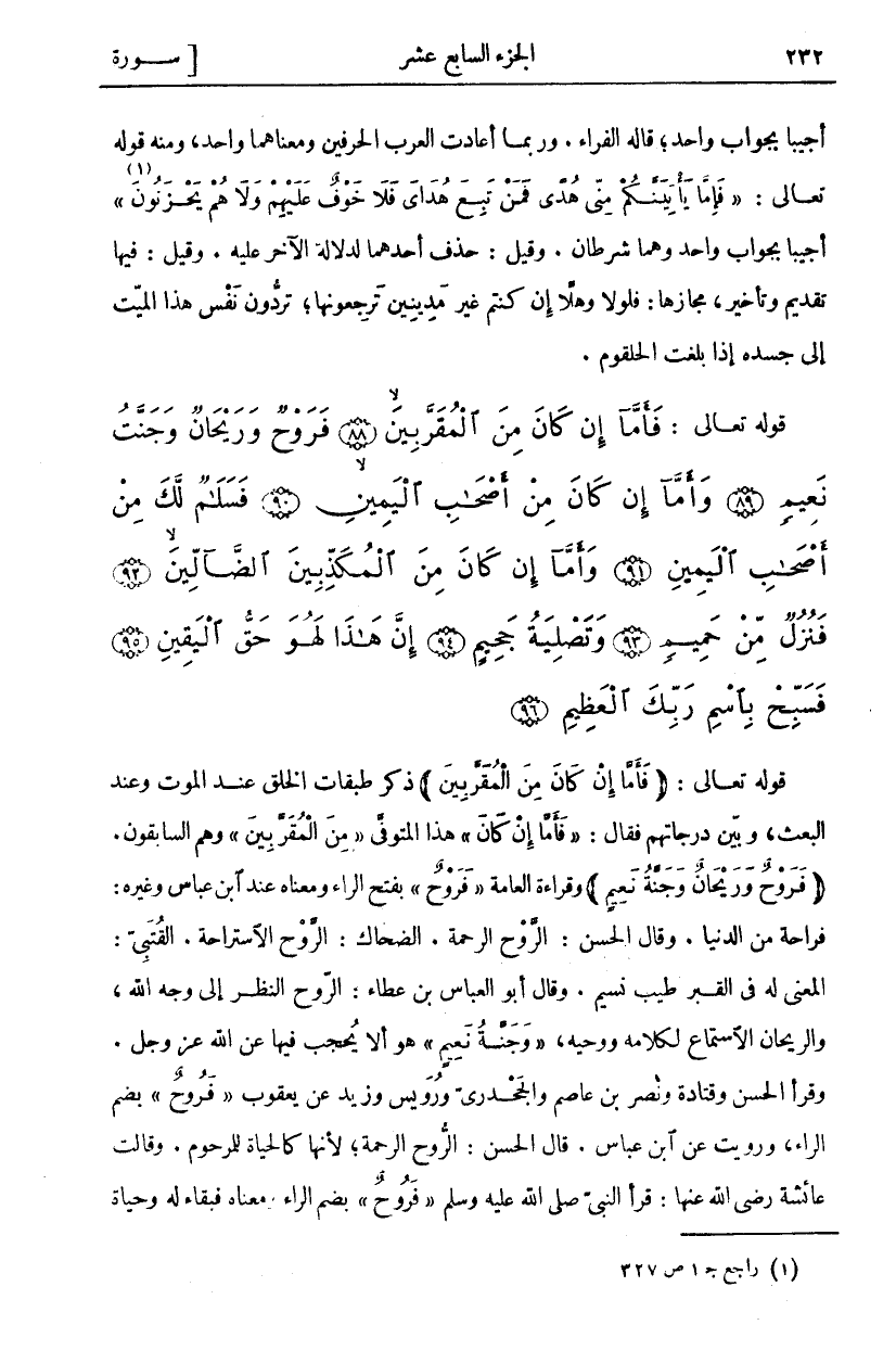 قَوْلُهُ تَعَالَى: (فَأَمَّا إِنْ كانَ مِنَ الْمُقَرَّبِينَ) ذَكَرَ طَبَقَاتِ الْخَلْقِ عِنْدَ الْمَوْتِ وَعِنْدَ الْبَعْثِ، وَبَيَّنَ دَرَجَاتِهِمْ فَقَالَ: (فَأَمَّا إِنْ كانَ) هَذَا الْمُتَوَفَّى (مِنَ الْمُقَرَّبِينَ) وَهُمُ السَّابِقُونَ. (فَرَوْحٌ وَرَيْحانٌ وَجَنَّةُ نَعِيمٍ) وَقِرَاءَةُ الْعَامَّةِ (فَرَوْحٌ) بِفَتْحِ الرَّاءِ وَمَعْنَاهُ عِنْدَ ابن عباس وغيره: فراحة من الدنيا. وقال الْحَسَنُ: الرَّوْحُ الرَّحْمَةُ. الضَّحَّاكُ: الرَّوْحُ الِاسْتِرَاحَةُ. الْقُتَبِيُّ: الْمَعْنَى لَهُ فِي الْقَبْرِ طِيبُ نَسِيمٍ. وَقَالَ أَبُو الْعَبَّاسِ بْنِ عَطَاءٍ: الرَّوْحُ النَّظَرُ إِلَى وَجْهِ اللَّهِ، وَالرَّيْحَانُ الِاسْتِمَاعُ لِكَلَامِهِ وَوَحْيِهِ، (وَجَنَّةُ نَعِيمٍ) هُوَ أَلَّا يُحْجَبَ فِيهَا عَنِ اللَّهِ عَزَّ وَجَلَّ. وَقَرَأَ الْحَسَنُ وَقَتَادَةُ وَنَصْرُ بْنُ عَاصِمٍ وَالْجَحْدَرِيُّ وَرُوَيْسٌ وَزَيْدٌ عَنْ يَعْقُوبَ (فَرُوحٌ) بِضَمِّ الرَّاءِ، وَرُوِيَتْ عَنِ ابْنِ عَبَّاسٍ. قَالَ الْحَسَنُ: الرُّوحُ الرَّحْمَةُ، لِأَنَّهَا كَالْحَيَاةِ لِلْمَرْحُومِ. وَقَالَتْ عَائِشَةُ رَضِيَ اللَّهُ عَنْهَا: قَرَأَ النَّبِيُّ صَلَّى اللَّهُ عَلَيْهِ وَسَلَّمَ (فَرُوحٌ) بِضَمِّ الرَّاءِ وَمَعْنَاهُ فبقاء له وحياة