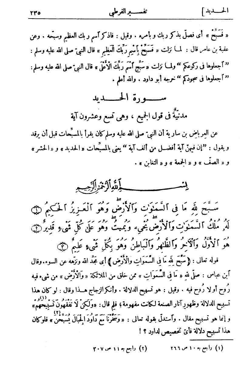 سَبَّحَ لِلَّهِ مَا فِي السَّماواتِ وَالْأَرْضِ وَهُوَ الْعَزِيزُ الْحَكِيمُ (١) لَهُ مُلْكُ السَّماواتِ وَالْأَرْضِ يُحْيِي وَيُمِيتُ وَهُوَ عَلى كُلِّ شَيْءٍ قَدِيرٌ (٢) هُوَ الْأَوَّلُ وَالْآخِرُ وَالظَّاهِرُ وَالْباطِنُ وَهُوَ بِكُلِّ شَيْءٍ عَلِيمٌ (٣)