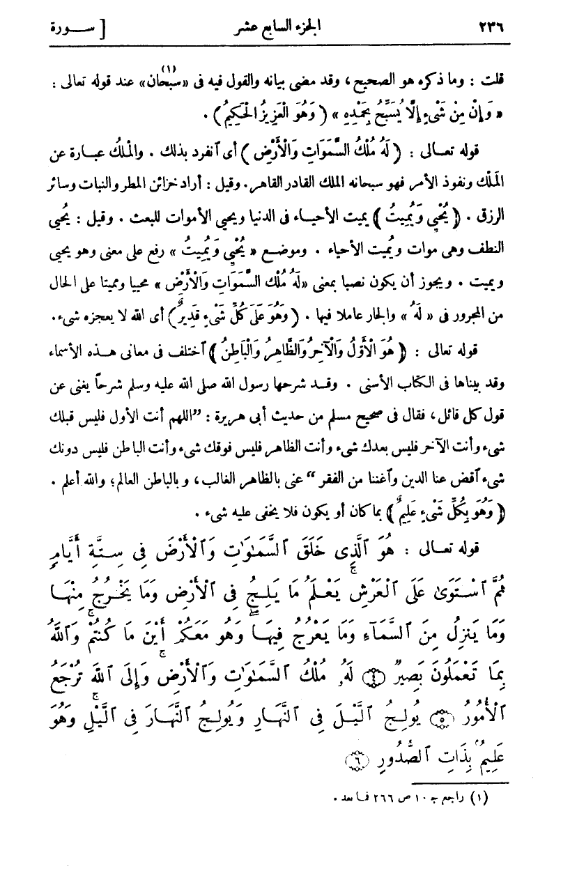 قُلْتُ: وَمَا ذَكَرَهُ هُوَ الصَّحِيحُ، وَقَدْ مَضَى بَيَانُهُ وَالْقَوْلُ فِيهِ فِي (سُبْحَانِ) «١» عِنْدَ قَوْلُهُ تَعَالَى: (وَإِنْ مِنْ شَيْءٍ إِلَّا يُسَبِّحُ بِحَمْدِهِ) (وَهُوَ الْعَزِيزُ الْحَكِيمُ). قوله تعالى: أَيِ انْفَرَدَ بِذَلِكَ. وَالْمُلْكُ عِبَارَةٌ عَنِ الْمَلْكِ وَنُفُوذِ الْأَمْرِ فَهُوَ سُبْحَانَهُ الْمَلِكُ الْقَادِرُ الْقَاهِرُ. وَقِيلَ: أَرَادَ خَزَائِنَ الْمَطَرِ وَالنَّبَاتِ وَسَائِرِ الرِّزْقِ. (يُحْيِي وَيُمِيتُ) يُمِيتُ الْأَحْيَاءَ فِي الدُّنْيَا وَيُحْيِي الْأَمْوَاتَ لِلْبَعْثِ. وَقِيلَ: يُحْيِي النُّطَفَ وَهِيَ مَوَاتٌ وَيُمِيتُ الْأَحْيَاءَ. وَمَوْضِعُ (يُحْيِي وَيُمِيتُ) رُفِعٌ عَلَى مَعْنَى وَهُوَ يُحْيِي وَيُمِيتُ. وَيَجُوزُ أَنْ يَكُونَ نَصْبًا بِمَعْنَى (لَهُ مُلْكُ السَّماواتِ وَالْأَرْضِ) مُحْيِيًا وَمُمِيتًا عَلَى الْحَالِ مِنَ الْمَجْرُورِ فِي (لَهُ) وَالْجَارُّ عَامِلًا فِيهَا. (وَهُوَ عَلى كُلِّ شَيْءٍ قَدِيرٌ) أي الله لا يعجزه شي. قَوْلُهُ تَعَالَى: (هُوَ الْأَوَّلُ وَالْآخِرُ وَالظَّاهِرُ وَالْباطِنُ) اخْتُلِفَ فِي مَعَانِي هَذِهِ الْأَسْمَاءِ وَقَدْ بَيَّنَّاهَا فِي الْكِتَابِ الْأَسْنَى. وَقَدْ شَرَحَهَا رَسُولُ اللَّهِ صَلَّى اللَّهُ عَلَيْهِ وَسَلَّمَ شَرْحًا يُغْنِي عَنْ قَوْلِ كُلِّ قَائِلٍ، فَقَالَ فِي صَحِيحِ مُسْلِمٍ مِنْ حَدِيثِ أَبِي هُرَيْرَةَ: (اللَّهُمَّ أَنْتَ الْأَوَّلُ فليس قبلك شي وأنت الآخر فليس بعدك شي وأنت الظاهر فليس فوقك شي وأنت الباطن فليس دونك شي اقْضِ عَنَّا الدَّيْنَ وَأَغْنِنَا مِنَ الْفَقْرِ) عَنَى بِالظَّاهِرِ الْغَالِبَ، وَبِالْبَاطِنِ الْعَالِمَ، وَاللَّهُ أَعْلَمُ. (وَهُوَ بِكُلِّ شَيْءٍ عَلِيمٌ) بِمَا كَانَ أَوْ يَكُونُ فلا يخفى عليه شي.