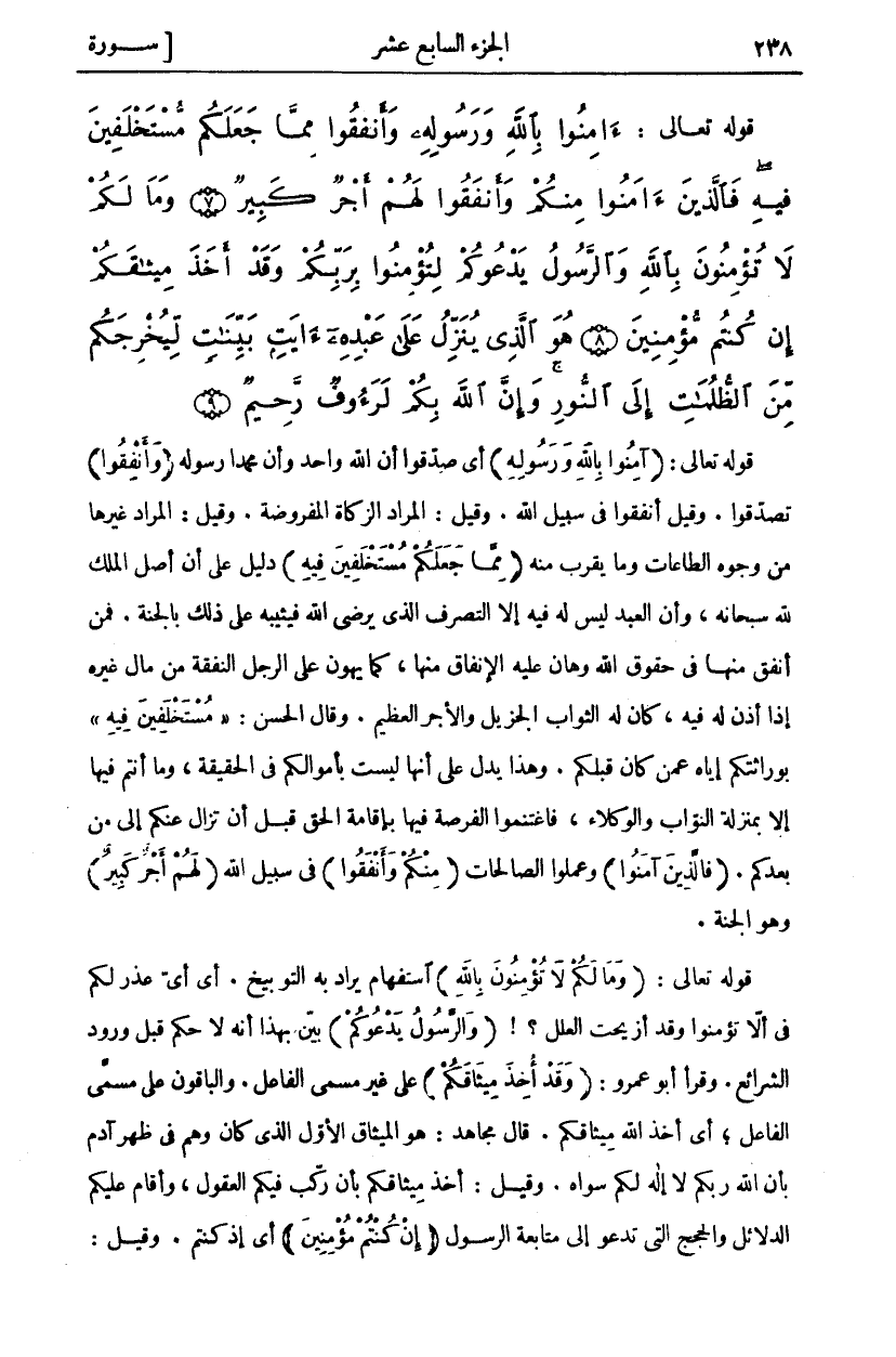 آمِنُوا بِاللَّهِ وَرَسُولِهِ وَأَنْفِقُوا مِمَّا جَعَلَكُمْ مُسْتَخْلَفِينَ فِيهِ فَالَّذِينَ آمَنُوا مِنْكُمْ وَأَنْفَقُوا لَهُمْ أَجْرٌ كَبِيرٌ (٧) وَما لَكُمْ لَا تُؤْمِنُونَ بِاللَّهِ وَالرَّسُولُ يَدْعُوكُمْ لِتُؤْمِنُوا بِرَبِّكُمْ وَقَدْ أَخَذَ مِيثاقَكُمْ إِنْ كُنْتُمْ مُؤْمِنِينَ (٨) هُوَ الَّذِي يُنَزِّلُ عَلى عَبْدِهِ آياتٍ بَيِّناتٍ لِيُخْرِجَكُمْ مِنَ الظُّلُماتِ إِلَى النُّورِ وَإِنَّ اللَّهَ بِكُمْ لَرَؤُفٌ رَحِيمٌ (٩)