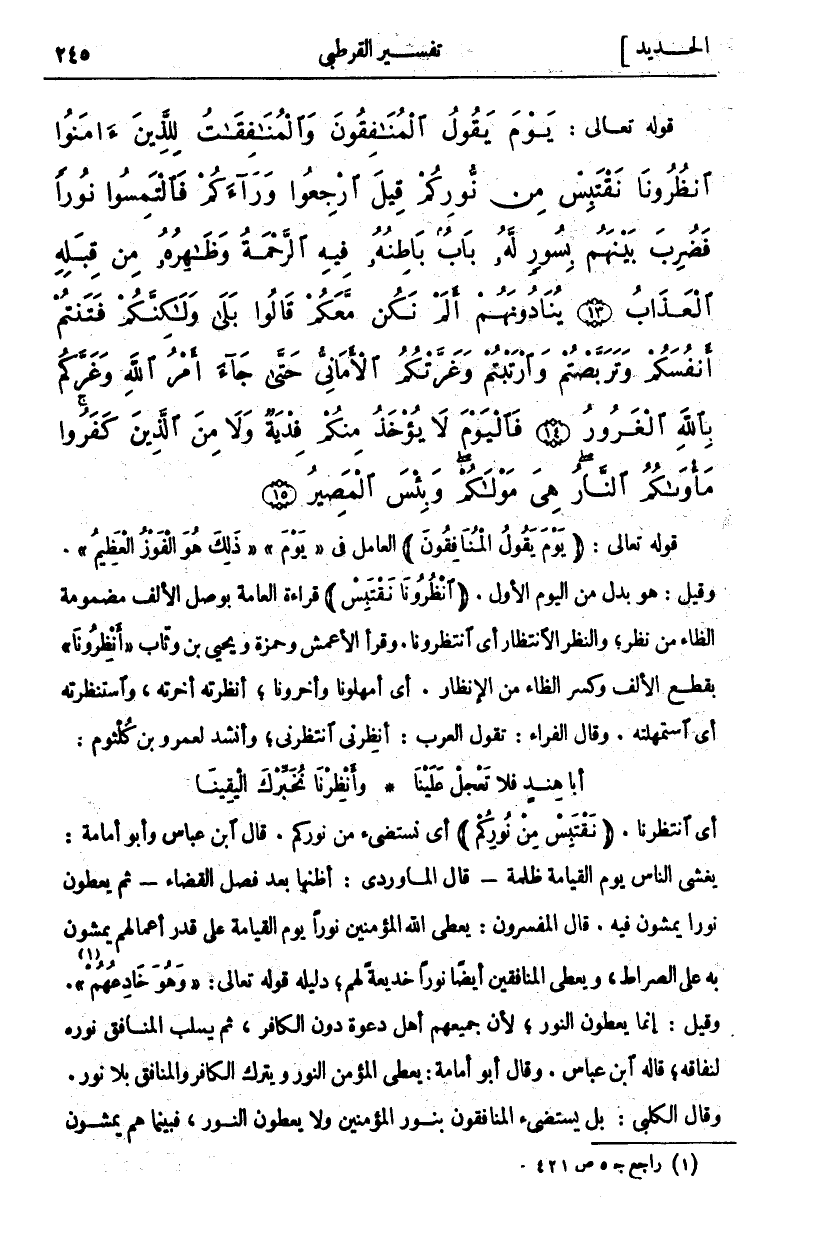 قَوْلُهُ تَعَالَى: (يَوْمَ يَقُولُ الْمُنافِقُونَ) الْعَامِلُ فِي (يَوْمَ) (ذلِكَ هُوَ الْفَوْزُ الْعَظِيمُ) .. وقيل: هو بد ل مِنَ الْيَوْمِ الْأَوَّلِ. (انْظُرُونا نَقْتَبِسْ) قِرَاءَةُ الْعَامَّةِ بِوَصْلِ الْأَلِفِ مَضْمُومَةُ الظَّاءِ مِنْ نَظَرَ، وَالنَّظَرُ الِانْتِظَارُ أَيِ انْتَظِرُونَا. وَقَرَأَ الْأَعْمَشُ وَحَمْزَةُ وَيَحْيَى بْنُ وَثَّابٍ (انْظُرُونا) بِقَطْعِ الْأَلِفِ وَكَسْرِ الظَّاءِ مِنَ الْإِنْظَارِ. أَيْ أَمْهِلُونَا وَأَخِّرُونَا، أَنْظَرْتُهُ أَخَّرْتُهُ، وَاسْتَنْظَرْتُهُ أَيِ اسْتَمْهَلْتُهُ. وَقَالَ الْفَرَّاءُ: تَقُولُ الْعَرَبُ: أَنْظِرْنِي انْتَظِرْنِي، وَأُنْشِدَ لِعَمْرِو بْنُ كُلْثُومٍ: