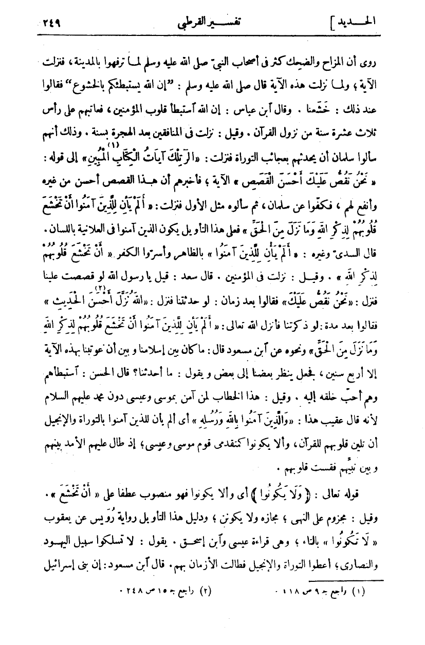 رُوِيَ أَنَّ الْمِزَاحَ وَالضَّحِكَ كَثُرَ فِي أَصْحَابَ النَّبِيِّ صَلَّى اللَّهُ عَلَيْهِ وَسَلَّمَ لَمَّا تَرَفَّهُوا بِالْمَدِينَةِ، فَنَزَلَتِ الْآيَةُ، وَلَمَّا نَزَلَتْ هَذِهِ الْآيَةُ قَالَ صَلَّى اللَّهُ عَلَيْهِ وَسَلَّمَ: (إِنَّ اللَّهَ يَسْتَبْطِئُكُمْ بِالْخُشُوعِ) فَقَالُوا عِنْدَ ذَلِكَ: خَشَعْنَا. وَقَالَ ابْنُ عَبَّاسٍ: إِنَّ اللَّهَ اسْتَبْطَأَ قُلُوبَ الْمُؤْمِنِينَ، فَعَاتَبَهُمْ عَلَى رَأْسِ ثَلَاثَ عَشْرَةَ سَنَةً مِنْ نُزُولِ الْقُرْآنِ. وَقِيلَ: نَزَلَتْ فِي الْمُنَافِقِينَ بَعْدَ الْهِجْرَةِ بِسَنَةٍ. وَذَلِكَ أَنَّهُمْ سَأَلُوا سَلْمَانَ أَنْ يُحَدِّثَهُمْ بِعَجَائِبِ التَّوْرَاةِ فَنَزَلَتْ: (الر تِلْكَ آياتُ الْكِتابِ «١» الْمُبِينِ) إِلَى قَوْلِهِ: (نَحْنُ نَقُصُّ عَلَيْكَ أَحْسَنَ الْقَصَصِ) الْآيَةَ، فَأَخْبَرَهُمْ أَنَّ هَذَا الْقَصَصَ أَحْسَنُ مِنْ غَيْرِهِ وَأَنْفَعُ لَهُمْ، فَكَفُّوا عَنْ سَلْمَانَ، ثُمَّ سَأَلُوهُ مِثْلَ الْأَوَّلِ فَنَزَلَتْ: (أَلَمْ يَأْنِ لِلَّذِينَ آمَنُوا أَنْ تَخْشَعَ قُلُوبُهُمْ لِذِكْرِ اللَّهِ وَما نَزَلَ مِنَ الْحَقِّ) فَعَلَى هَذَا التَّأْوِيلِ يَكُونُ الَّذِينَ آمَنُوا فِي الْعَلَانِيَةِ بِاللِّسَانِ. قَالَ السُّدِّيُّ وَغَيْرُهُ: (أَلَمْ يَأْنِ لِلَّذِينَ آمَنُوا) بِالظَّاهِرِ وَأَسَرُّوا الْكُفْرَ (أَنْ تَخْشَعَ قُلُوبُهُمْ لِذِكْرِ اللَّهِ). وَقِيلَ: نَزَلَتْ فِي الْمُؤْمِنِينَ. قَالَ سَعْدٌ: قِيلَ يَا رَسُولَ اللَّهِ لَوْ قَصَصْتَ عَلَيْنَا فَنَزَلَ: (نَحْنُ نَقُصُّ عَلَيْكَ) فَقَالُوا بَعْدَ زَمَانٍ: لَوْ حَدَّثْتَنَا فَنَزَلَ: (اللَّهُ نَزَّلَ أَحْسَنَ «٢» الْحَدِيثِ) فَقَالُوا بَعْدَ مُدَّةٍ: لَوْ ذَكَّرْتَنَا فَأَنْزَلَ اللَّهُ تَعَالَى: (أَلَمْ يَأْنِ لِلَّذِينَ آمَنُوا أَنْ تَخْشَعَ قُلُوبُهُمْ لِذِكْرِ اللَّهِ وَما نَزَلَ مِنَ الْحَقِّ) وَنَحْوُهُ عَنِ ابْنِ مَسْعُودٍ قَالَ: مَا كَانَ بَيْنَ إِسْلَامِنَا وَبَيْنَ أَنْ عُوتِبْنَا بِهَذِهِ الْآيَةِ إِلَّا أَرْبَعُ سِنِينَ، فَجَعَلَ يَنْظُرُ بَعْضُنَا إِلَى بَعْضٍ وَيَقُولُ: مَا أَحْدَثْنَا؟ قَالَ الْحَسَنُ: اسْتَبْطَأَهُمْ وَهُمْ أَحَبُّ خَلْقِهِ إِلَيْهِ. وَقِيلَ: هَذَا الْخِطَابُ لِمَنْ آمَنَ بِمُوسَى وَعِيسَى دُونَ مُحَمَّدٍ عَلَيْهِمُ السَّلَامُ لِأَنَّهُ قَالَ عَقِيبَ هَذَا: (وَالَّذِينَ آمَنُوا بِاللَّهِ وَرُسُلِهِ) أَيْ أَلَمْ يَأْنِ لِلَّذِينَ آمَنُوا بِالتَّوْرَاةِ وَالْإِنْجِيلِ أَنْ تَلِينَ قُلُوبُهُمْ لِلْقُرْآنِ، وَأَلَّا يَكُونُوا كَمُتَقَدِّمِي قَوْمِ مُوسَى وَعِيسَى، إِذْ طَالَ عَلَيْهِمُ الْأَمَدُ بَيْنَهُمْ وَبَيْنَ نَبِيِّهِمْ فَقَسَتْ قُلُوبُهُمْ. قَوْلُهُ تَعَالَى: (وَلا يَكُونُوا) أَيْ وَأَلَّا يَكُونُوا فَهُوَ مَنْصُوبٌ عَطْفًا عَلَى (أَنْ تَخْشَعَ). وَقِيلَ: مَجْزُومٌ عَلَى النَّهْيِ، مَجَازُهُ وَلَا يَكُونَنَّ، وَدَلِيلُ هَذَا التَّأْوِيلِ رِوَايَةُ رُوَيْسٍ عَنْ يَعْقُوبَ (لَا تكونوا) بالتاء، وهي قراءة عيسى وابن اسحق. يَقُولُ: لَا تَسْلُكُوا سَبِيلَ الْيَهُودِ وَالنَّصَارَى، أُعْطُوا التَّوْرَاةَ وَالْإِنْجِيلَ فَطَالَتِ الْأَزْمَانُ بِهِمْ. قَالَ ابْنُ مسعود: إن بني إسرائيل